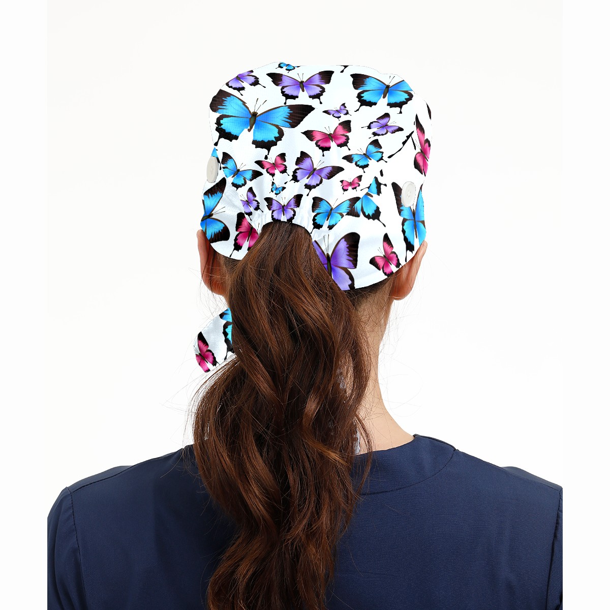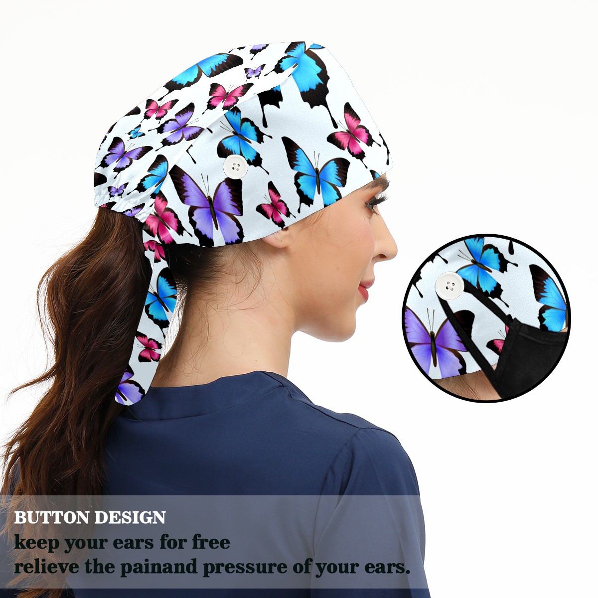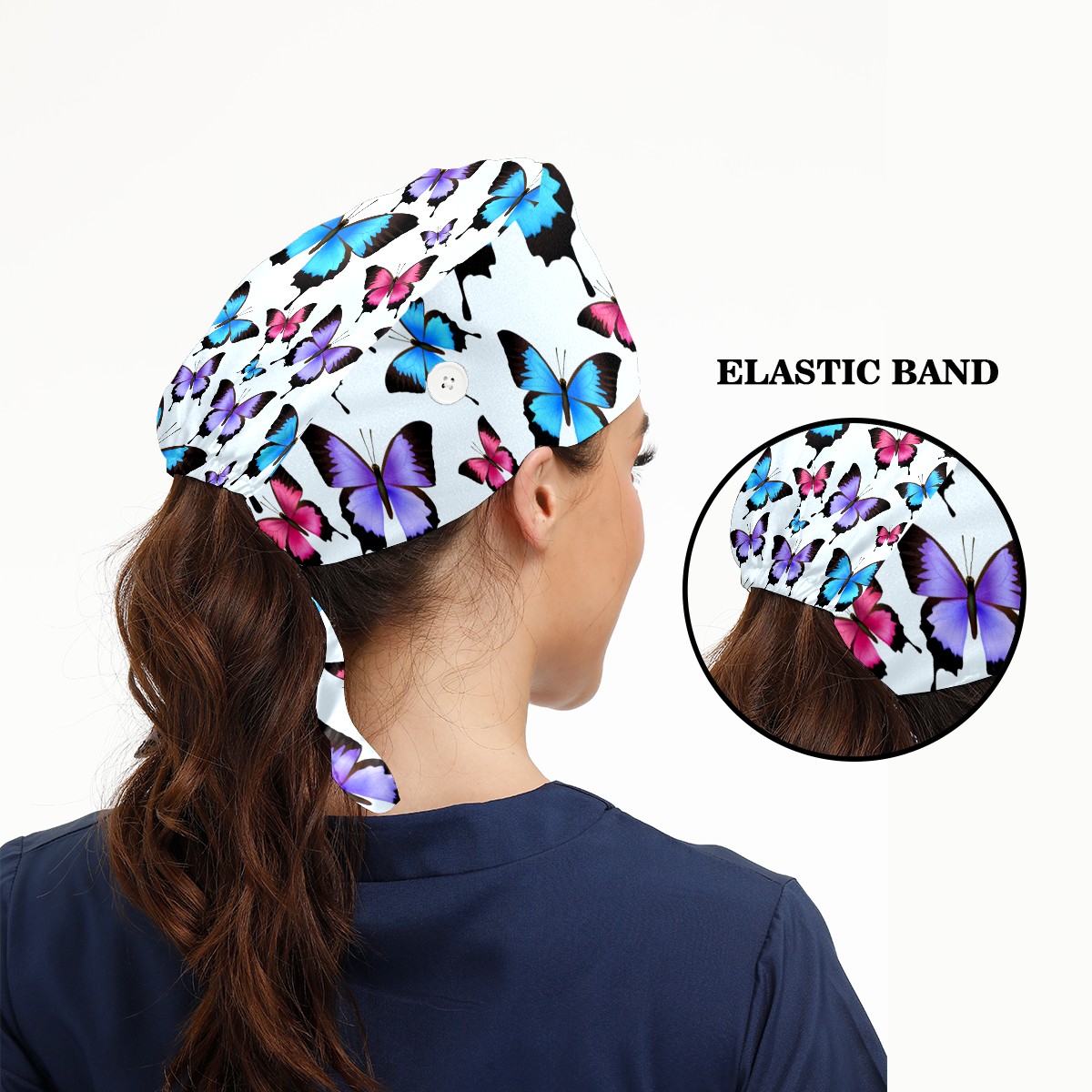Working Caps with Button & Sweatband Satin Lined Cotton Adjustable Nurse Hats Elastic Band Scrub Cap Surgeon Hat Blue Purple Pink Butterflies Pattern