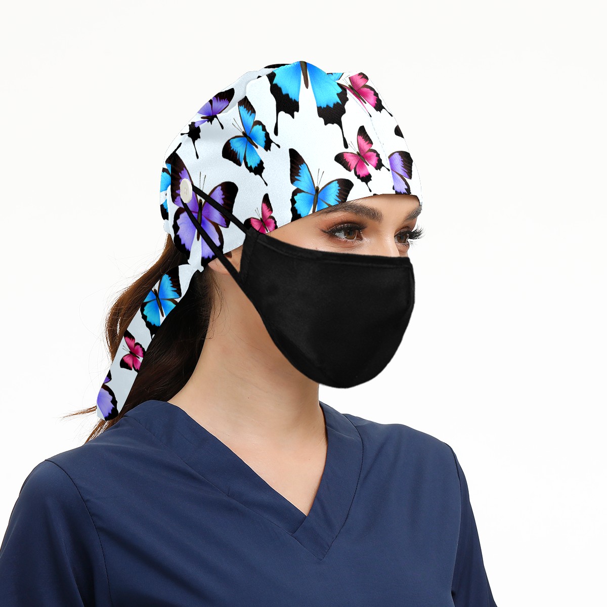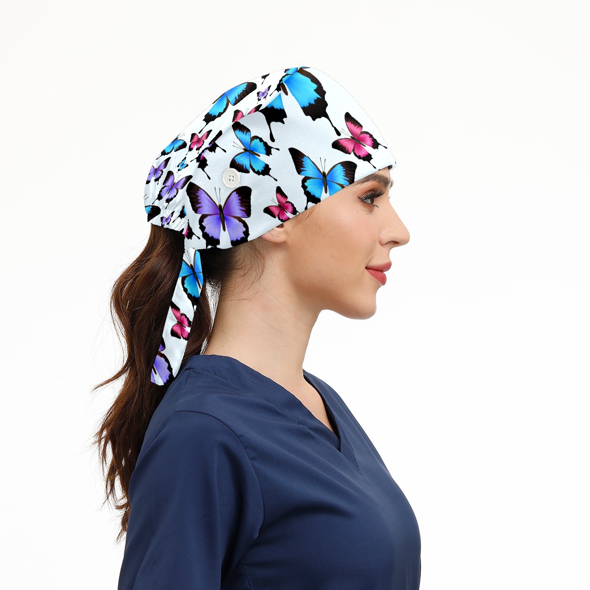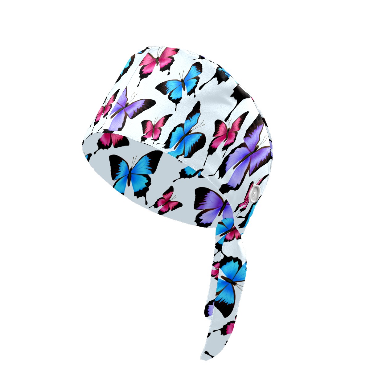 Working Caps with Button & Sweatband Satin Lined Cotton Adjustable Nurse Hats Elastic Band Scrub Cap Surgeon Hat Blue Purple Pink Butterflies Pattern