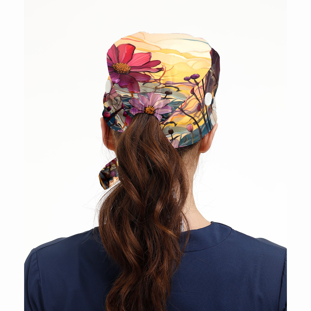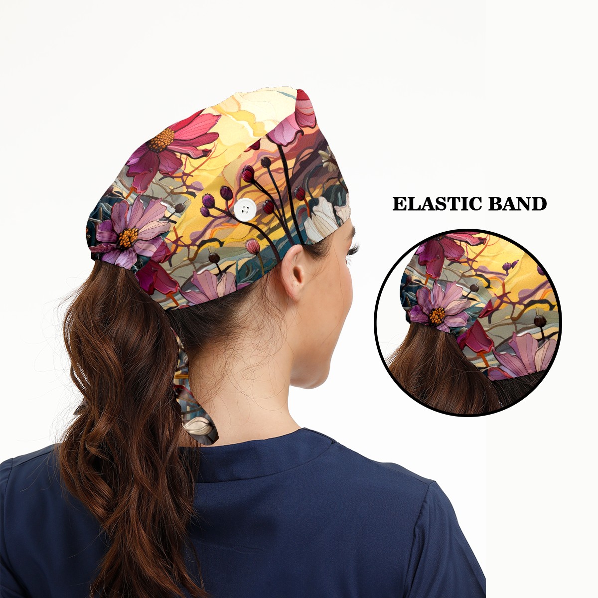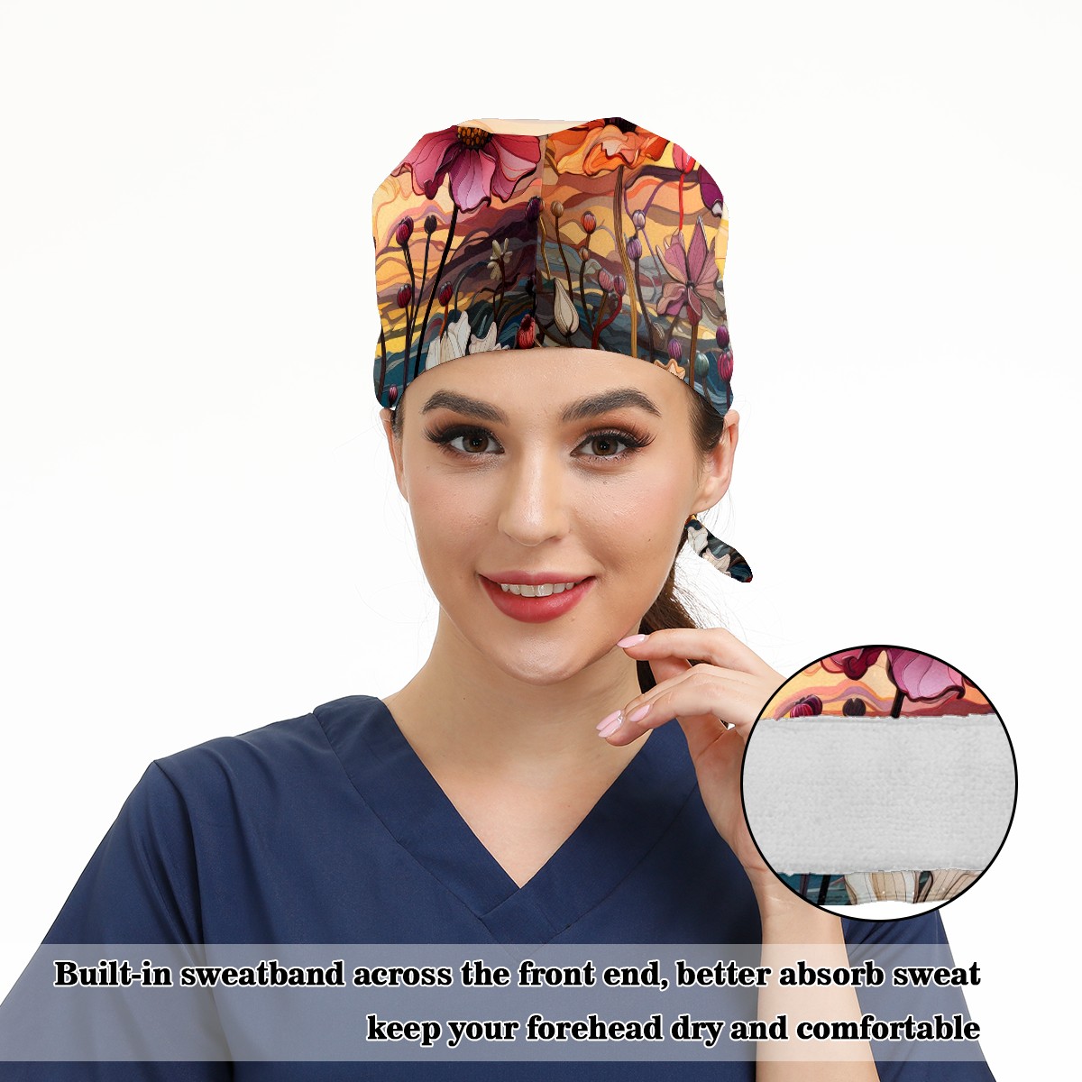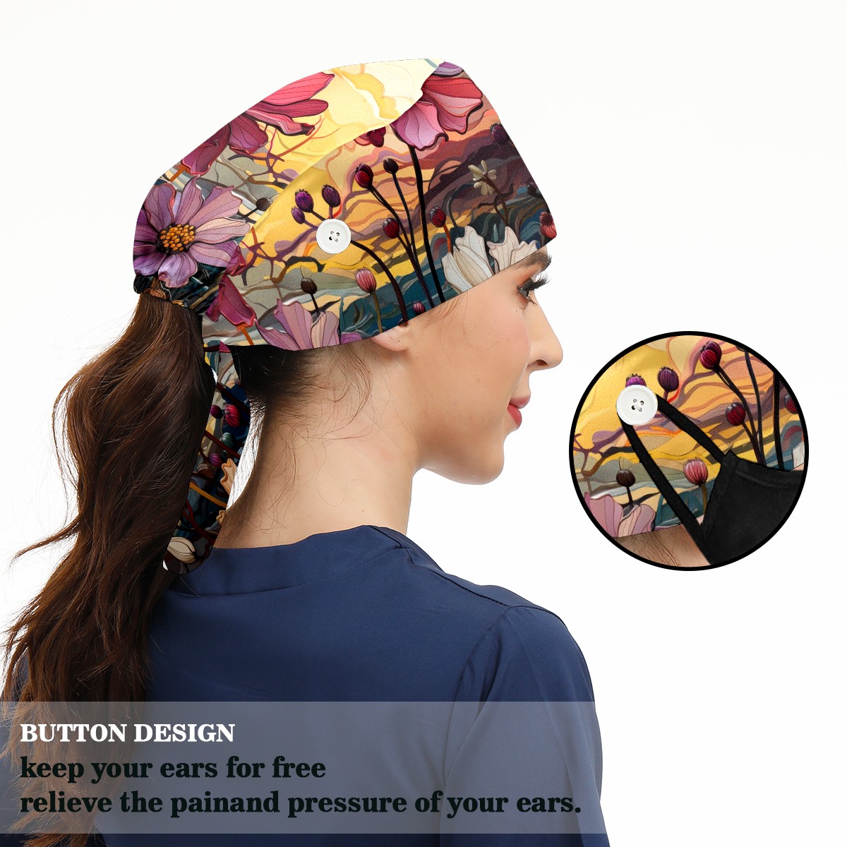 Working Caps with Button & Sweatband Satin Lined Cotton Adjustable Nurse Hats Elastic Band Scrub Cap Surgeon Hat Sea Of Colorful Flowers (2)