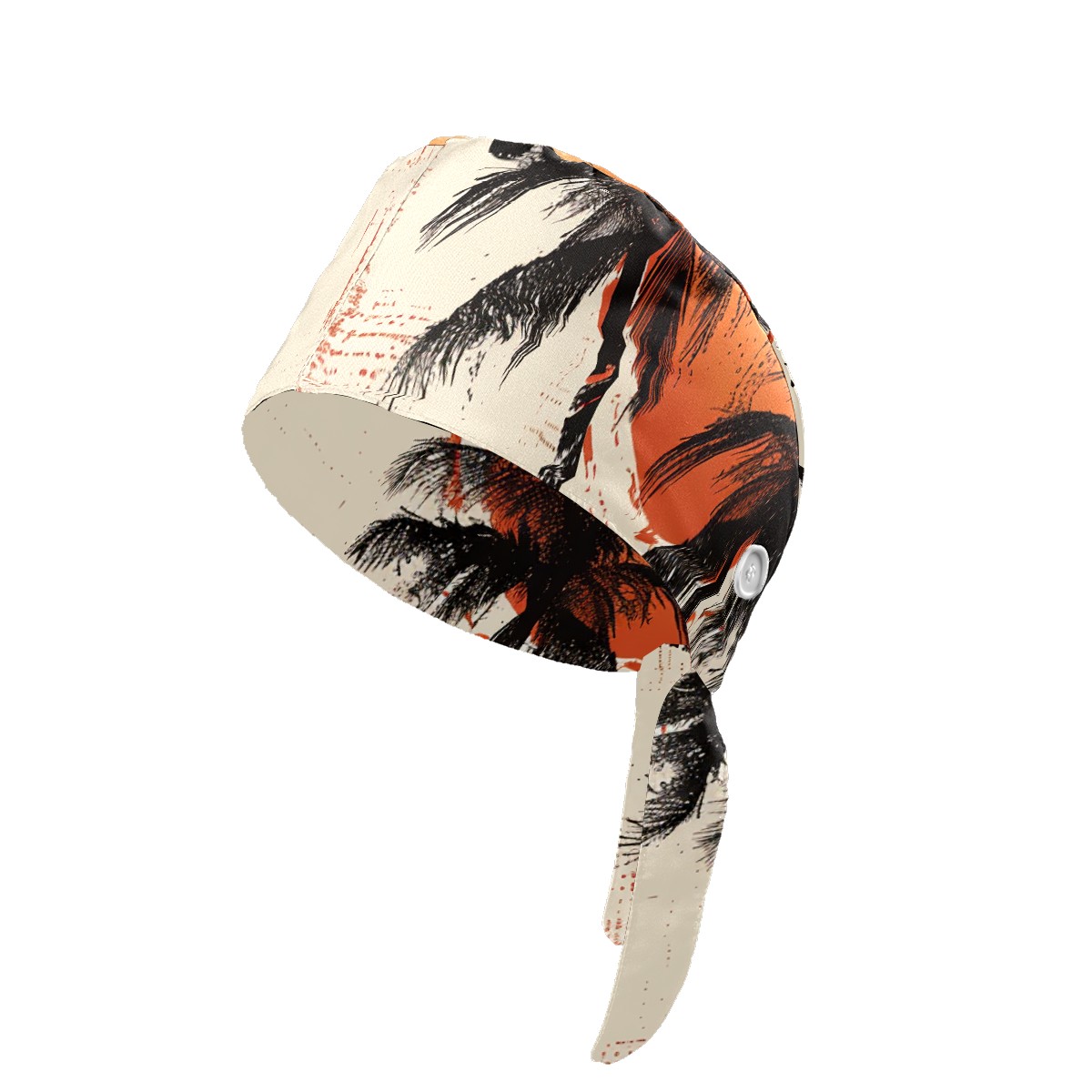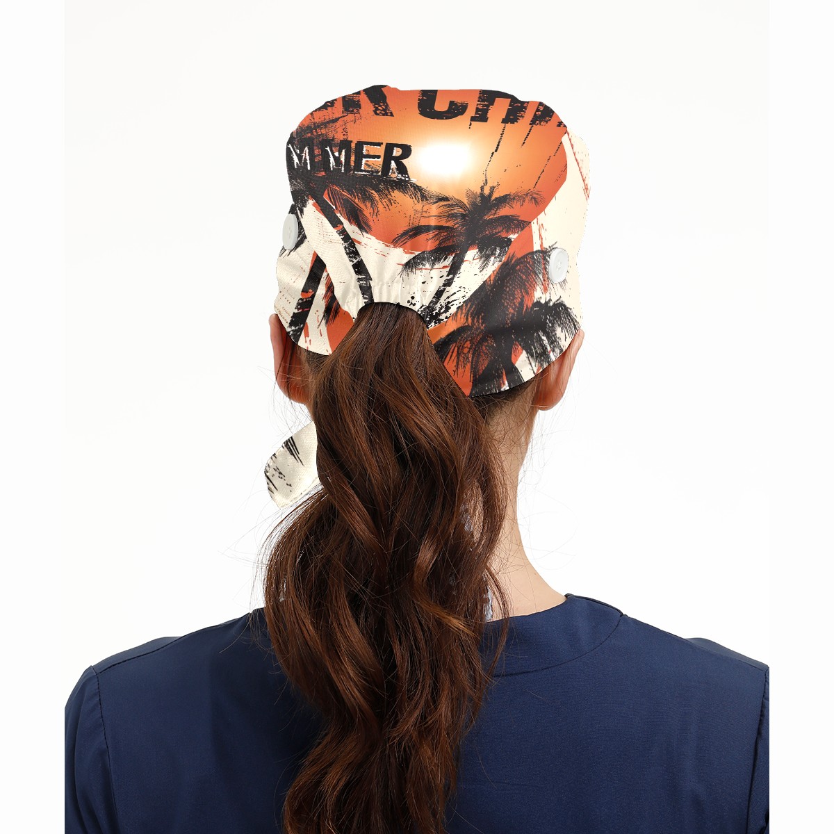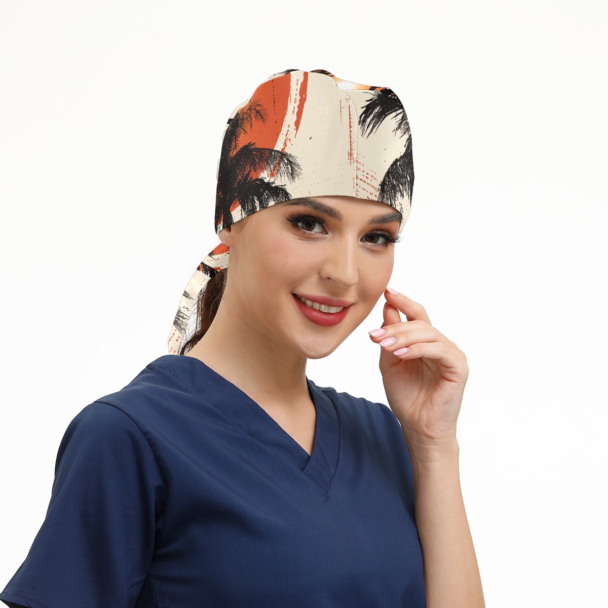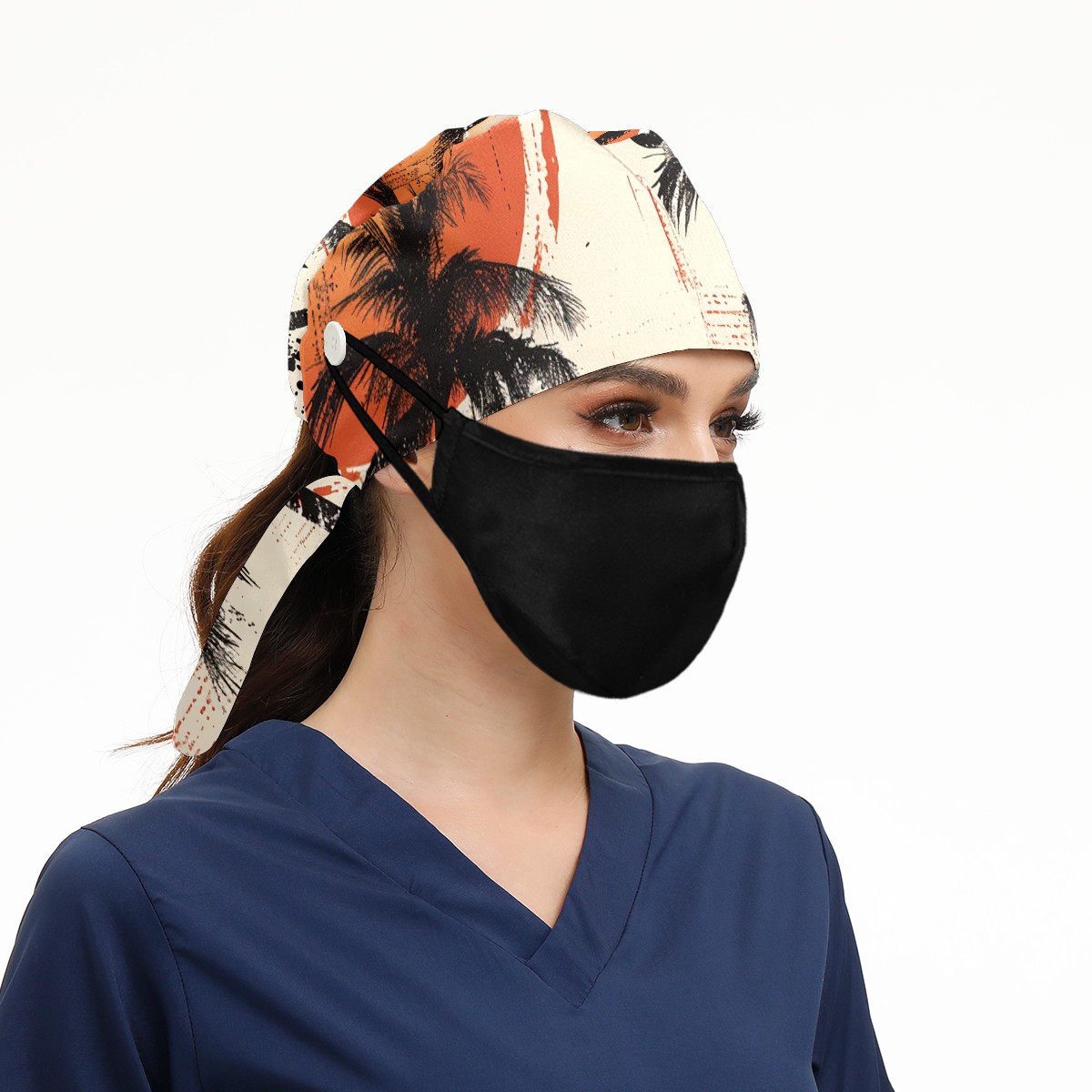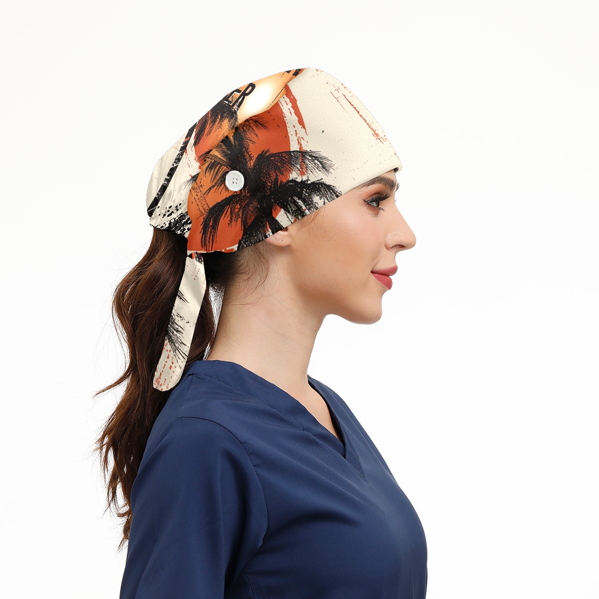 Working Caps with Button & Sweatband Satin Lined Cotton Adjustable Nurse Hats Elastic Band Scrub Cap Surgeon Hat Coconut Trees