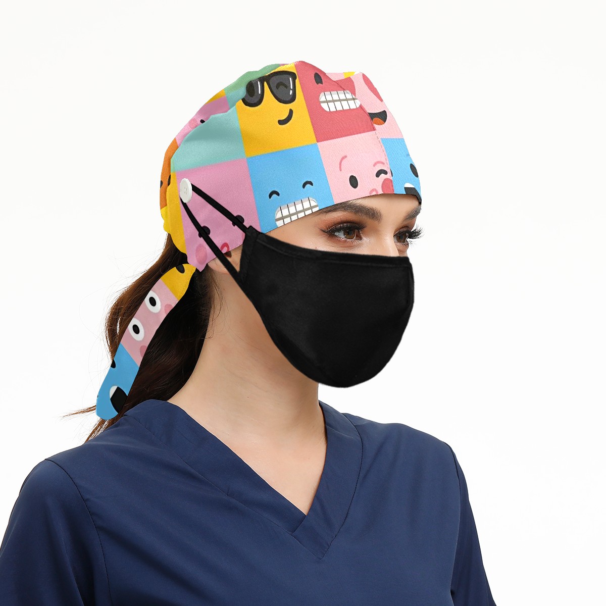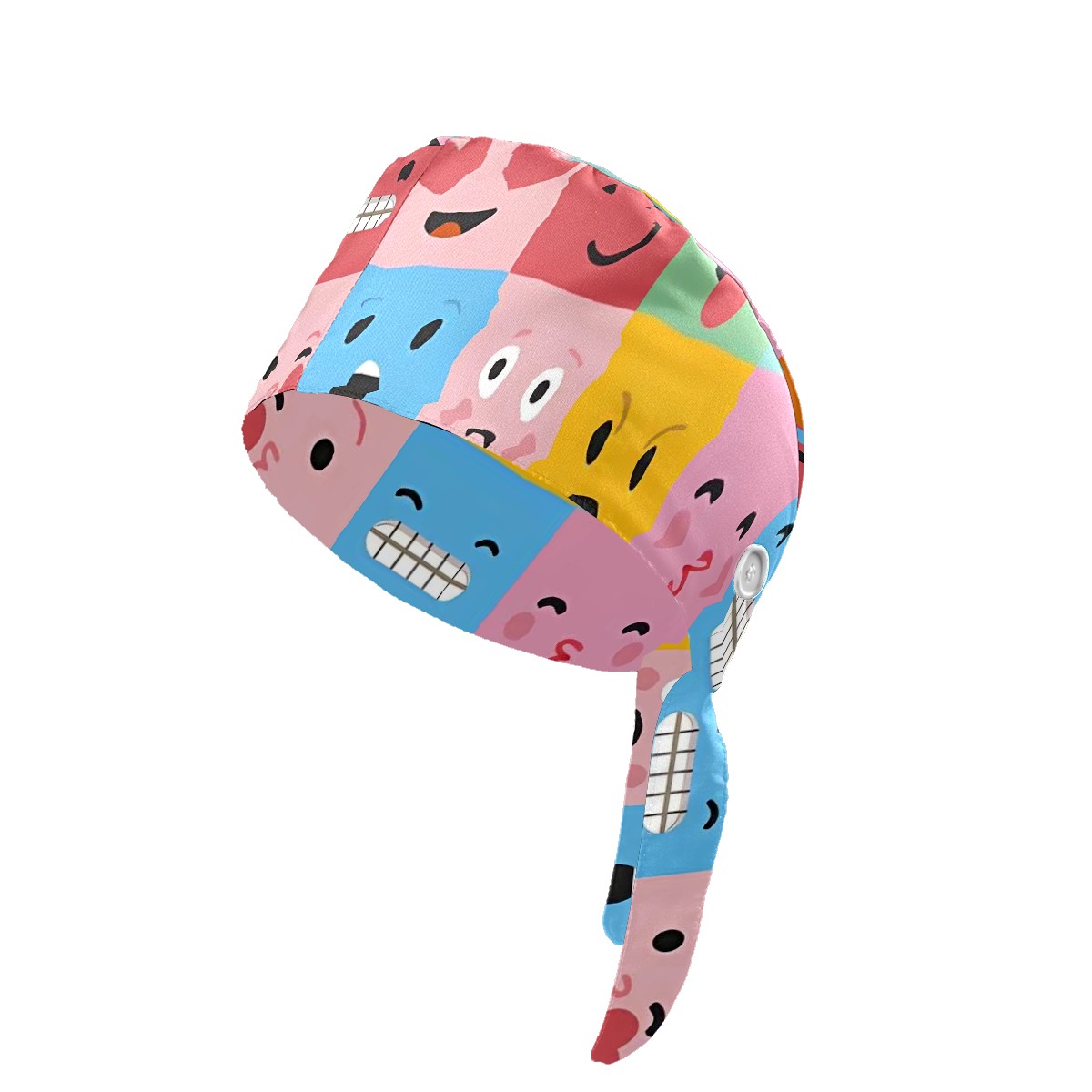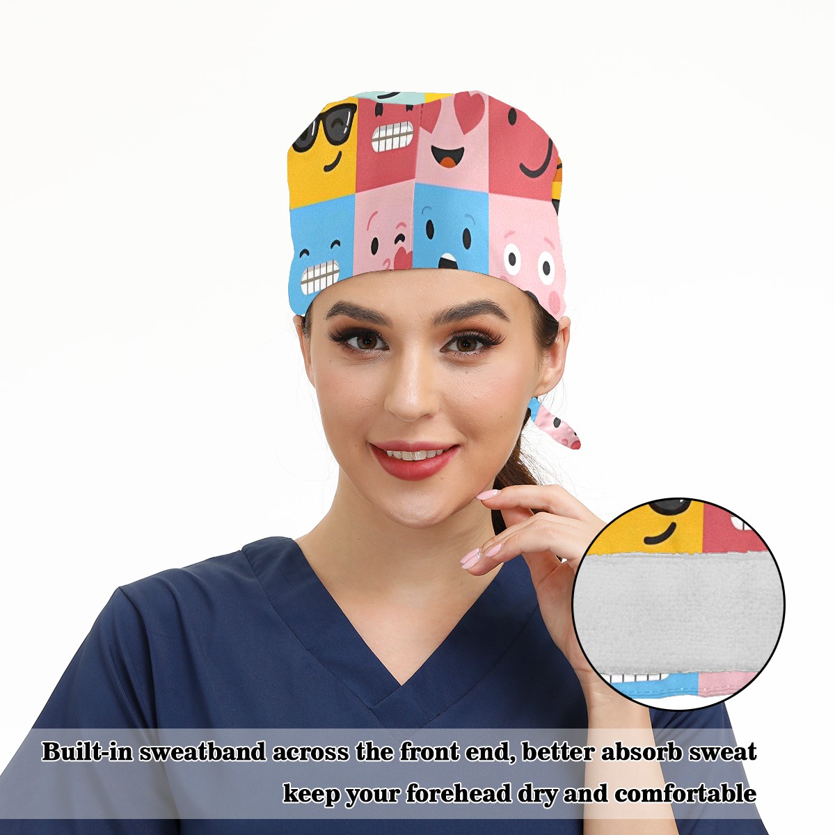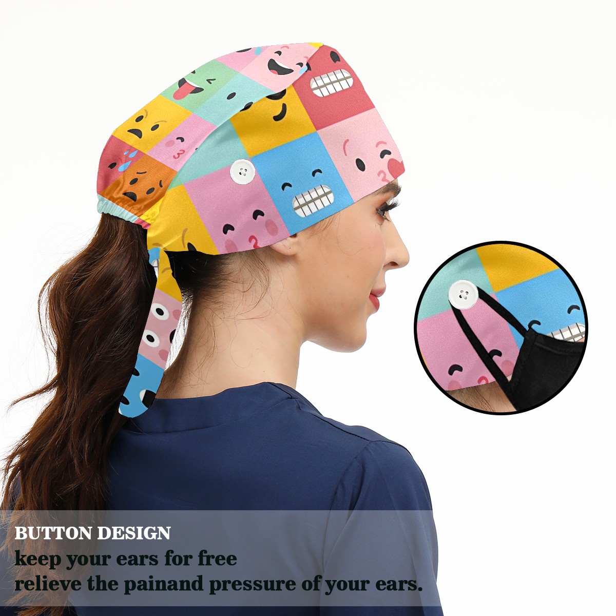 Working Caps with Button & Sweatband Satin Lined Cotton Adjustable Nurse Hats Elastic Band Scrub Cap Surgeon Hat Smiling Face