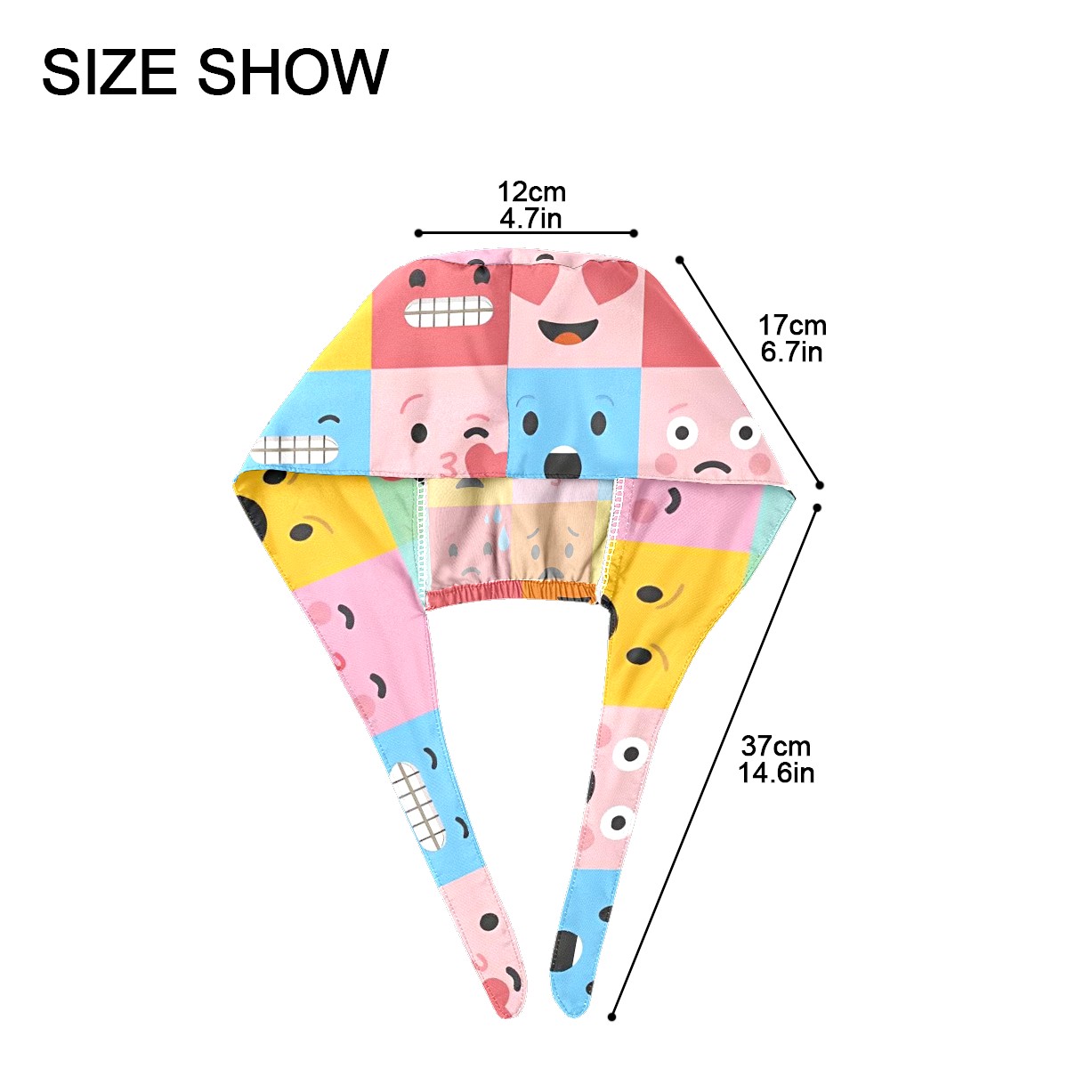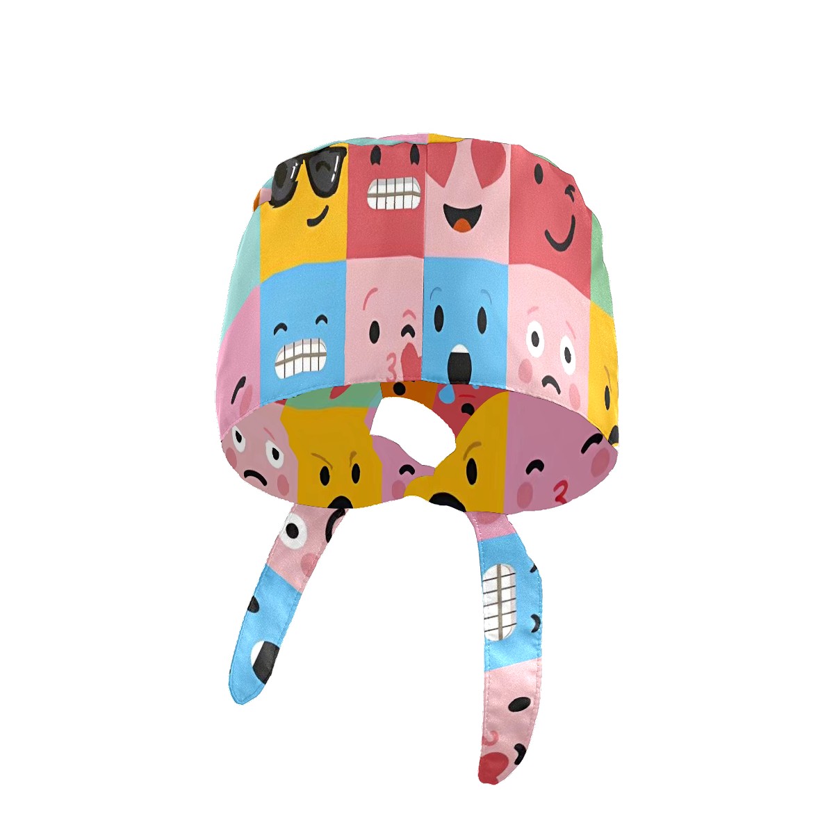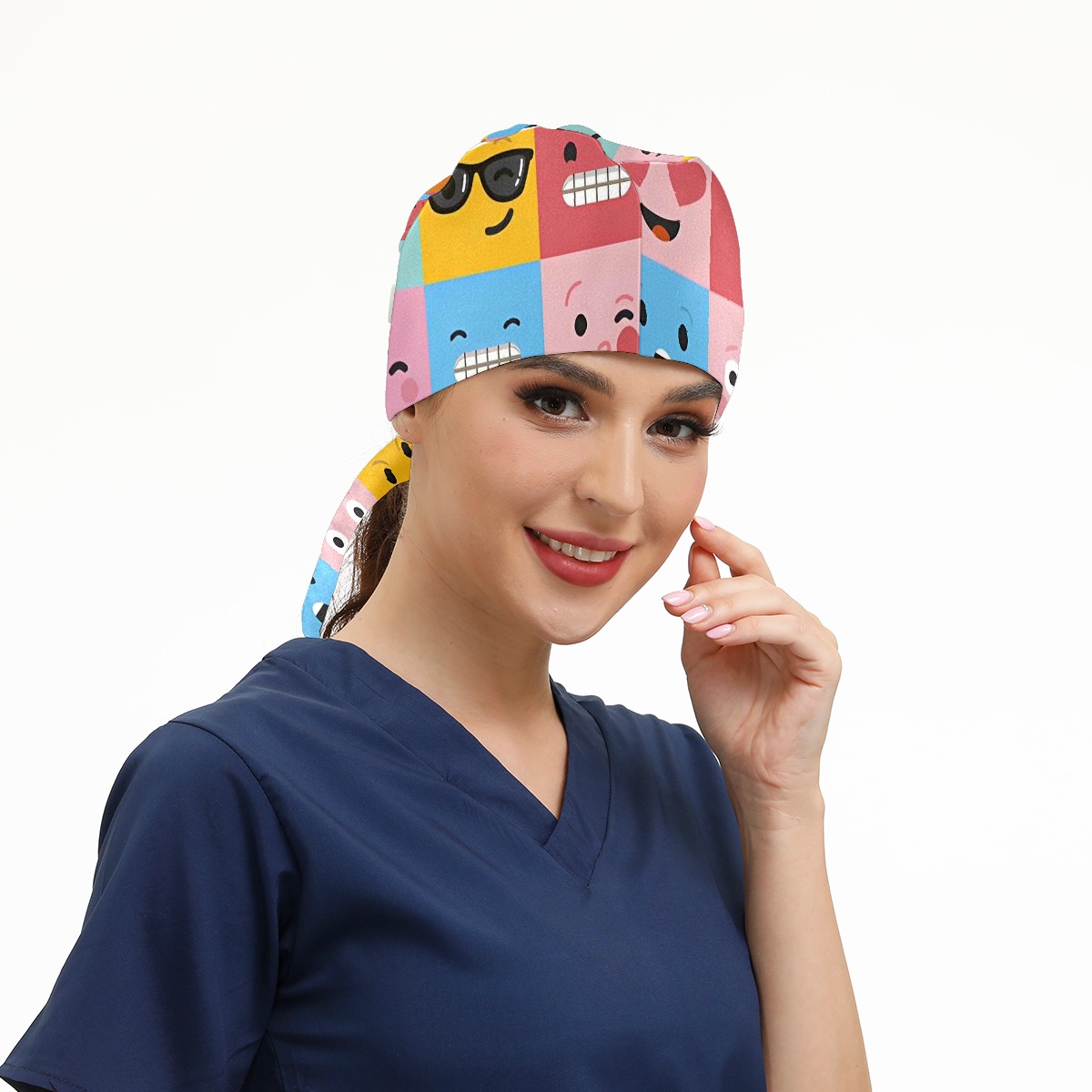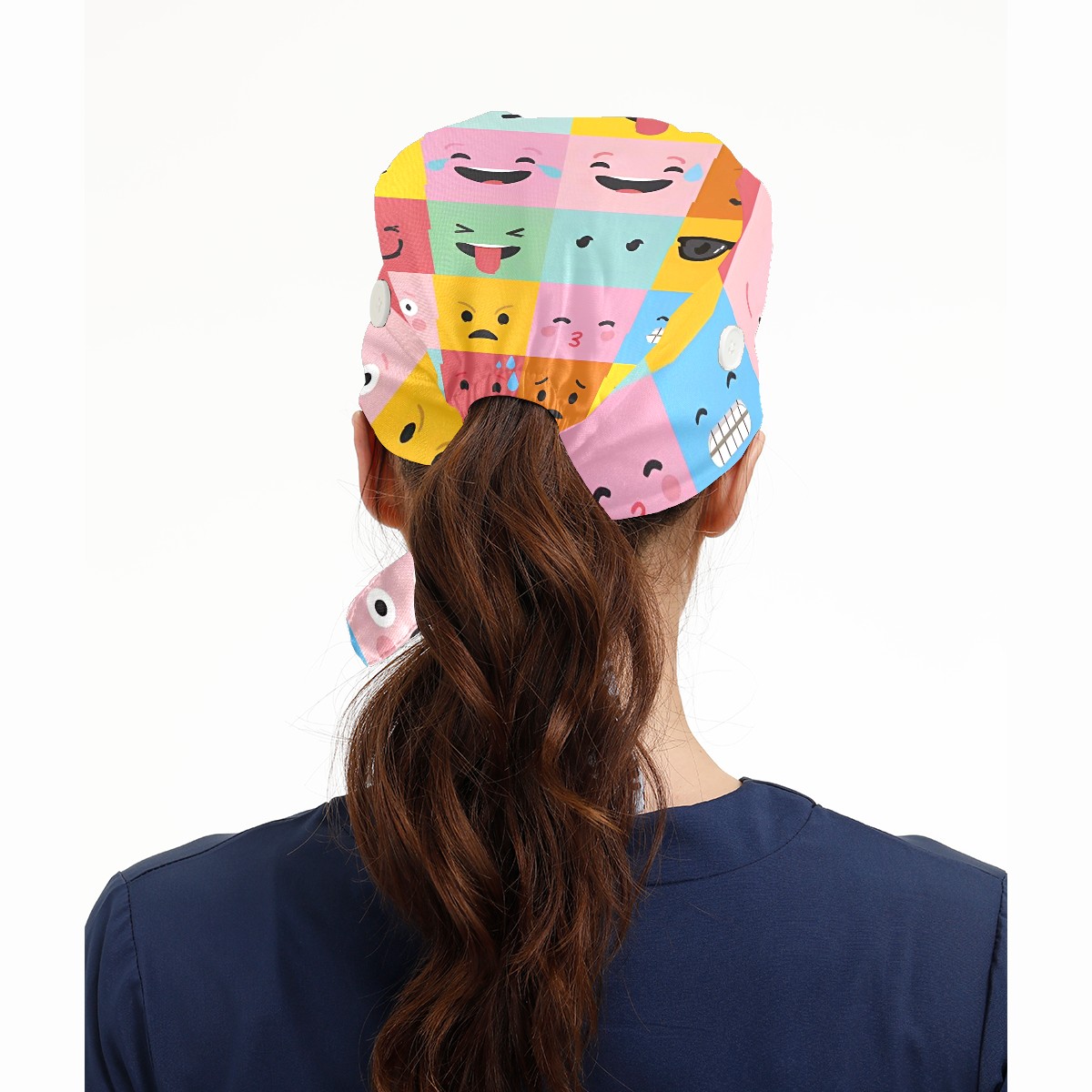 Working Caps with Button & Sweatband Satin Lined Cotton Adjustable Nurse Hats Elastic Band Scrub Cap Surgeon Hat Smiling Face