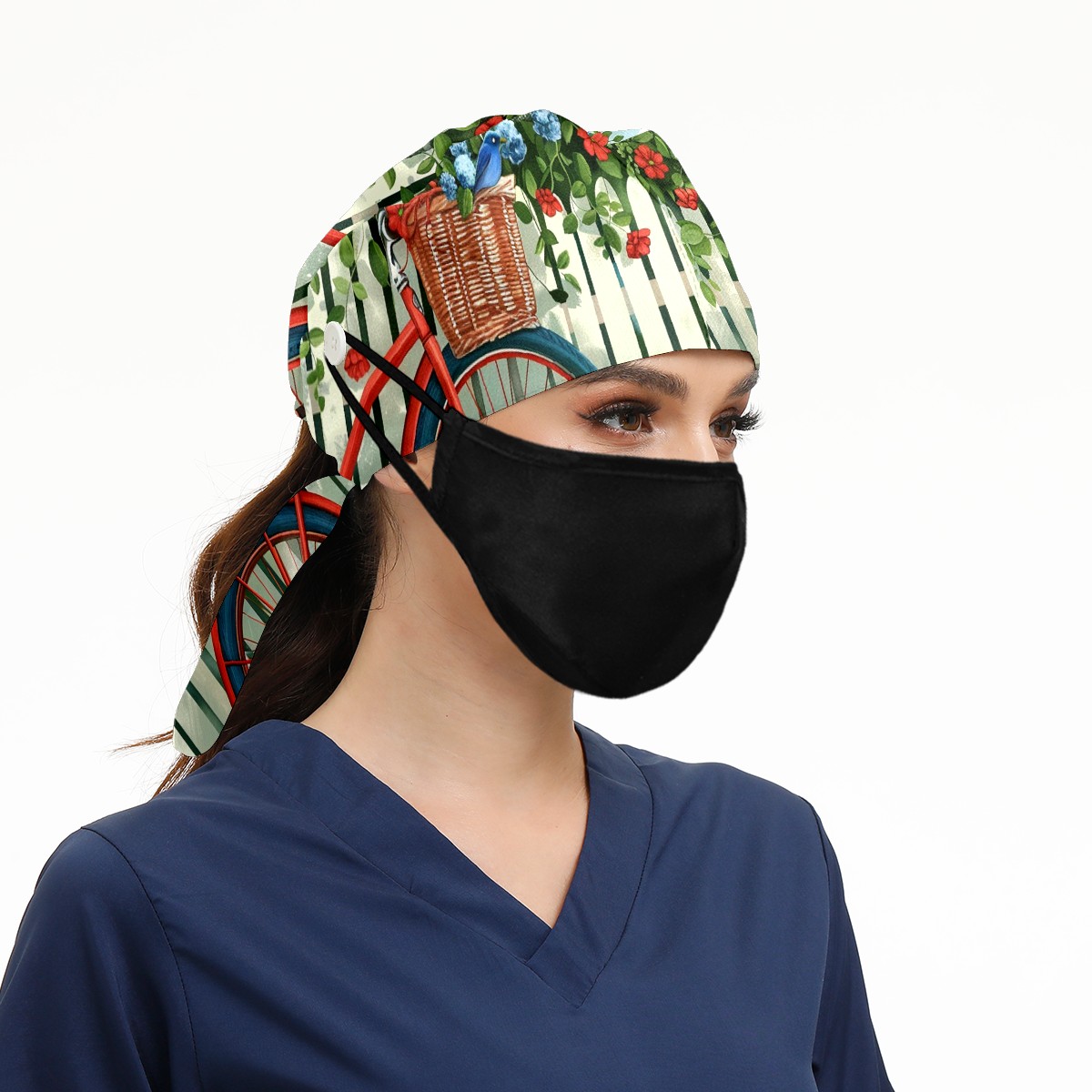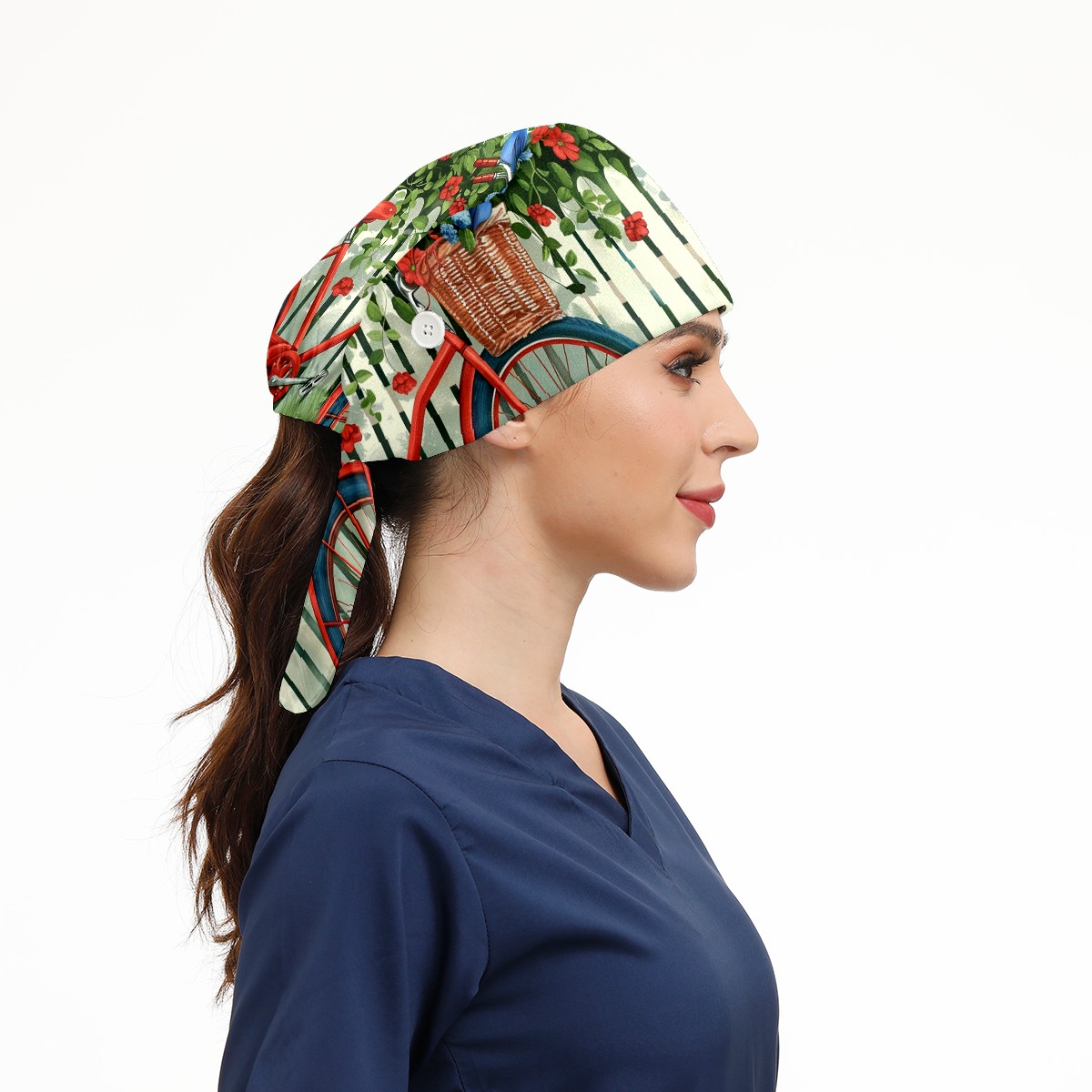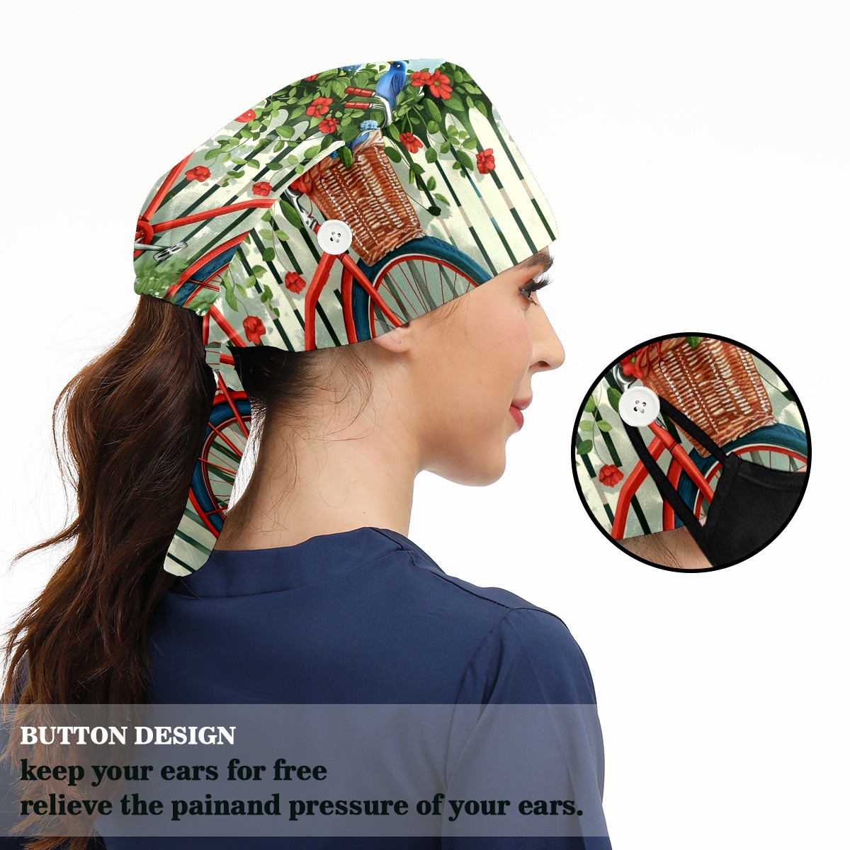 Working Caps with Button & Sweatband Satin Lined Cotton Adjustable Nurse Hats Elastic Band Scrub Cap Surgeon Hat Bicycle