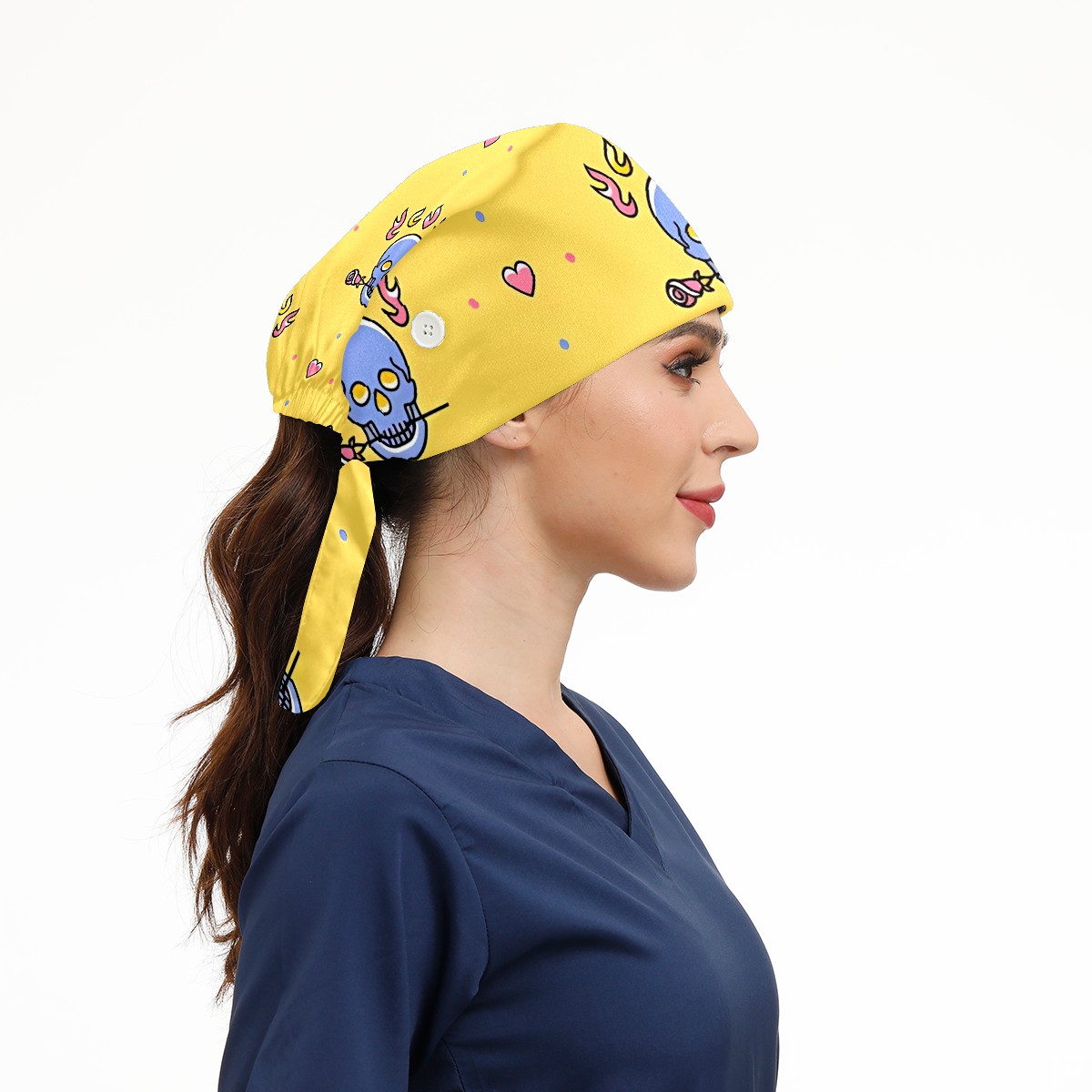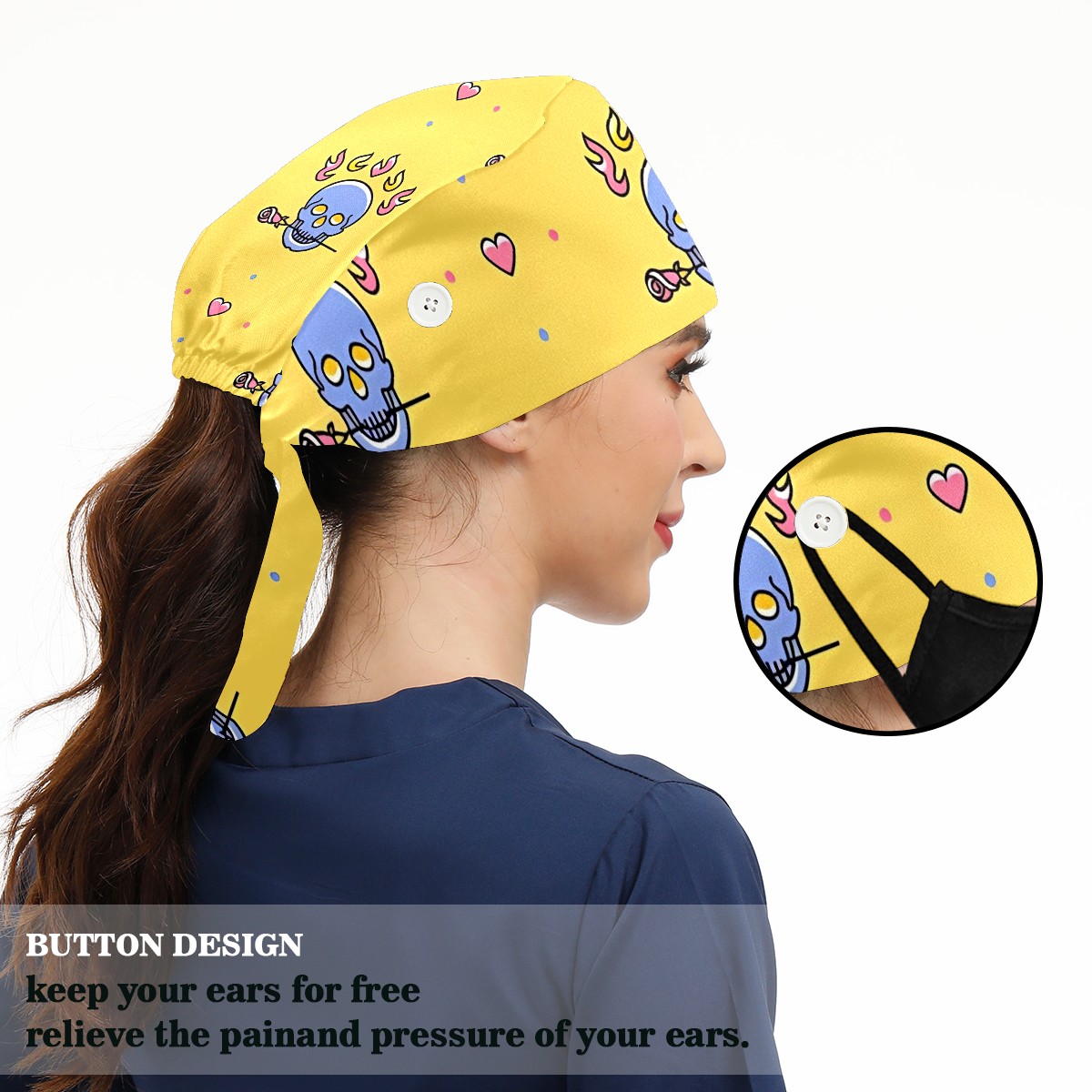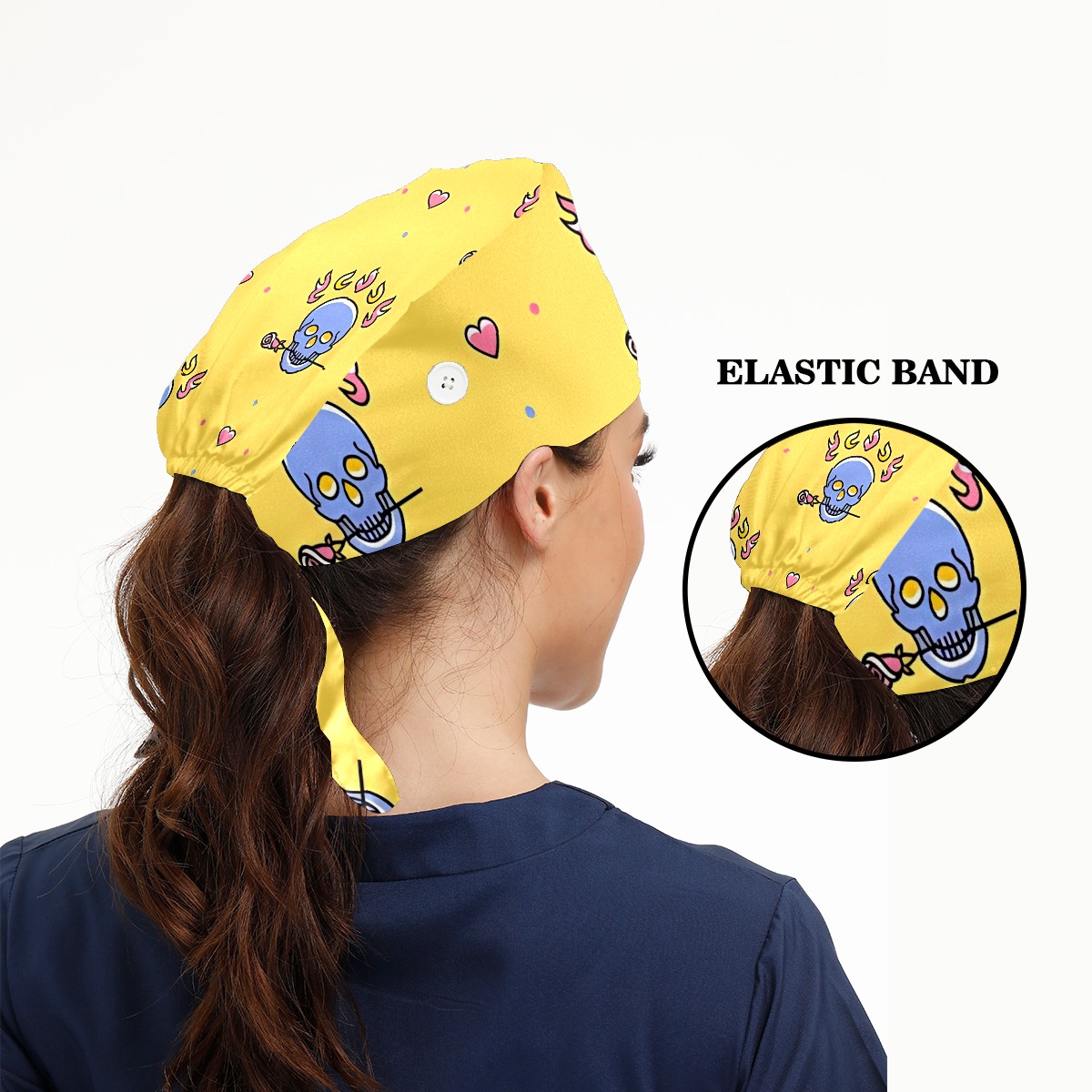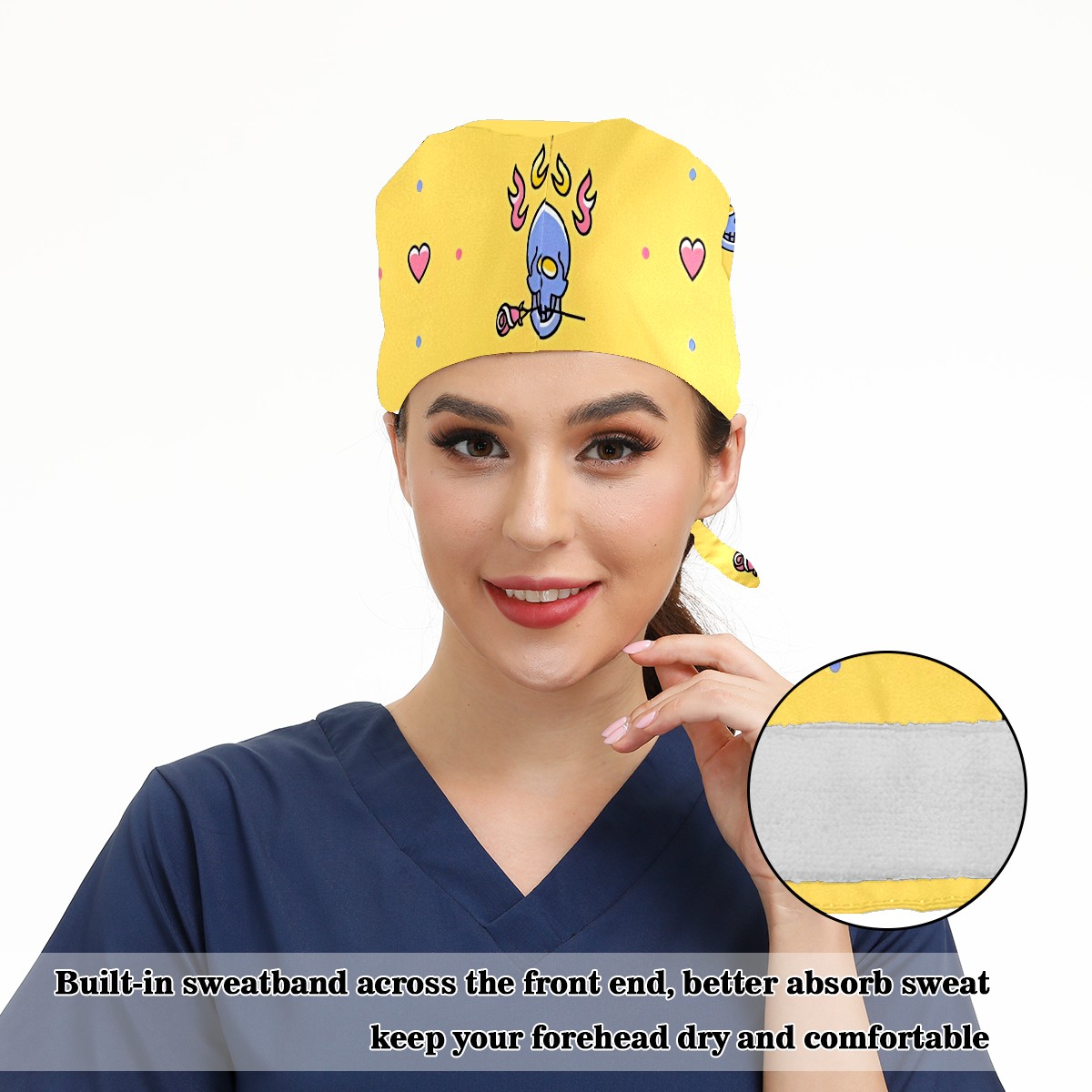 Working Caps with Button & Sweatband Satin Lined Cotton Adjustable Nurse Hats Elastic Band Scrub Cap Surgeon Hat Skull Print