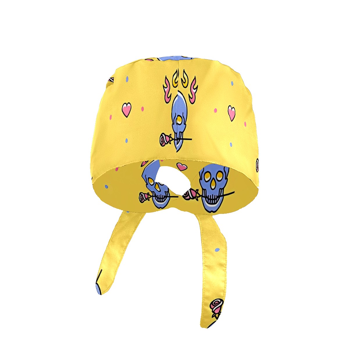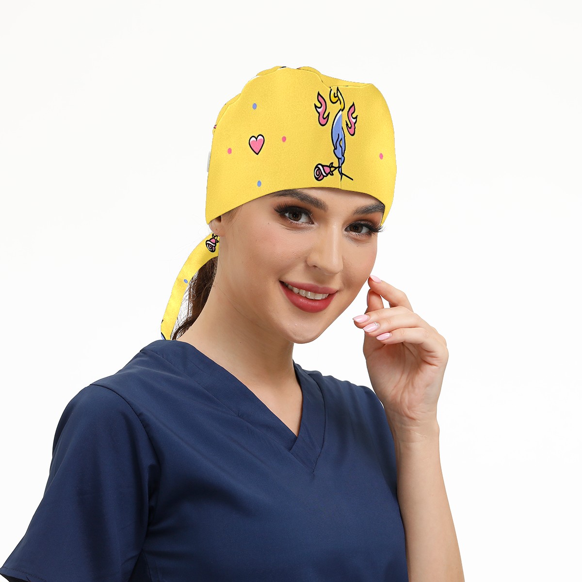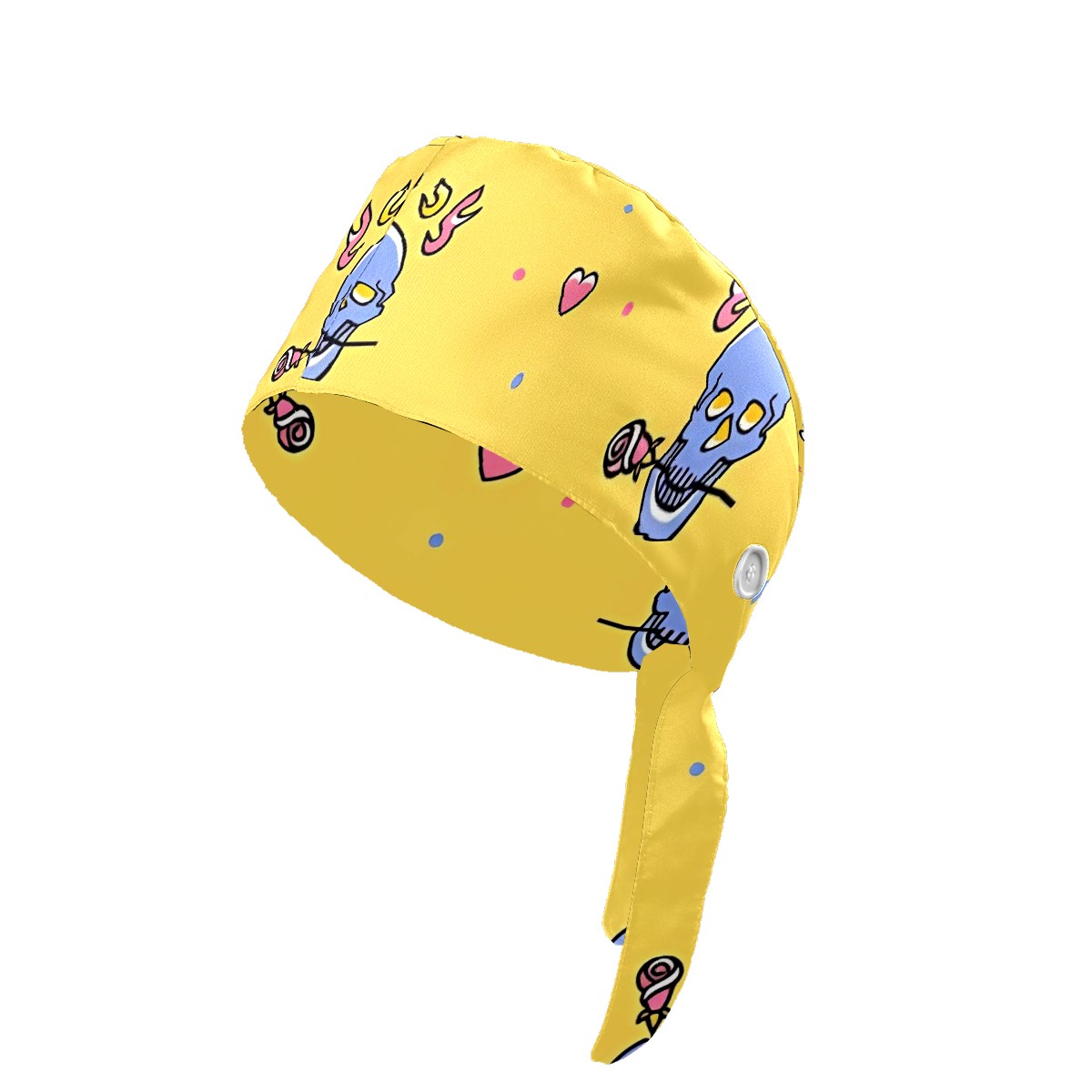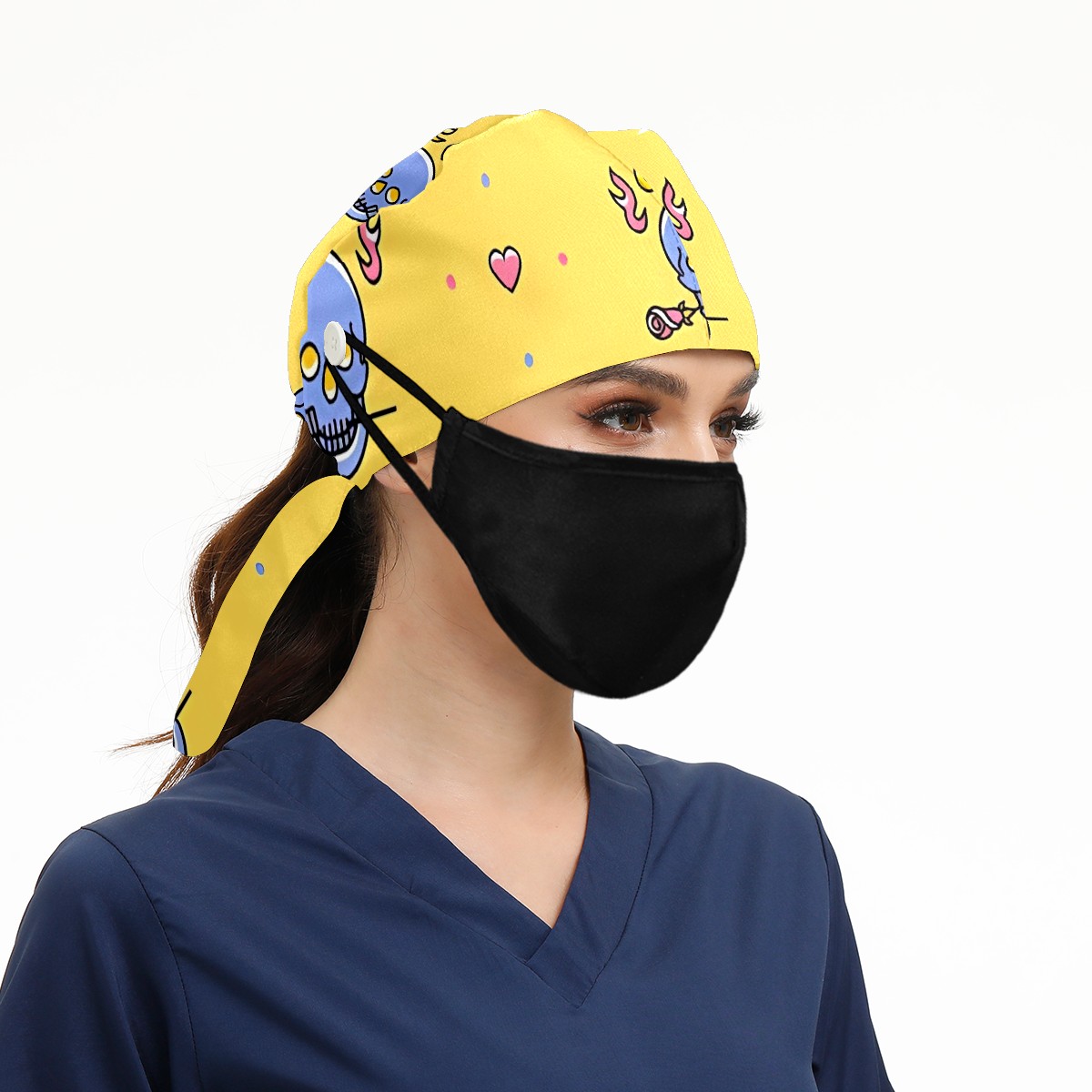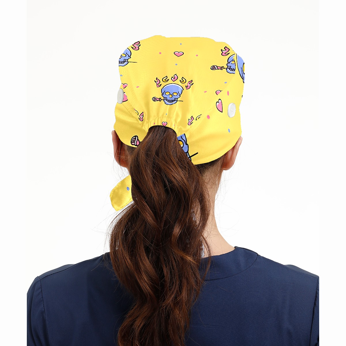 Working Caps with Button & Sweatband Satin Lined Cotton Adjustable Nurse Hats Elastic Band Scrub Cap Surgeon Hat Skull Print