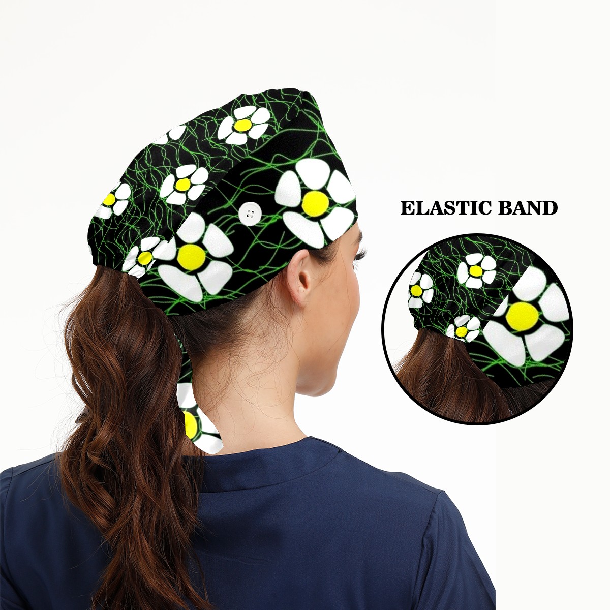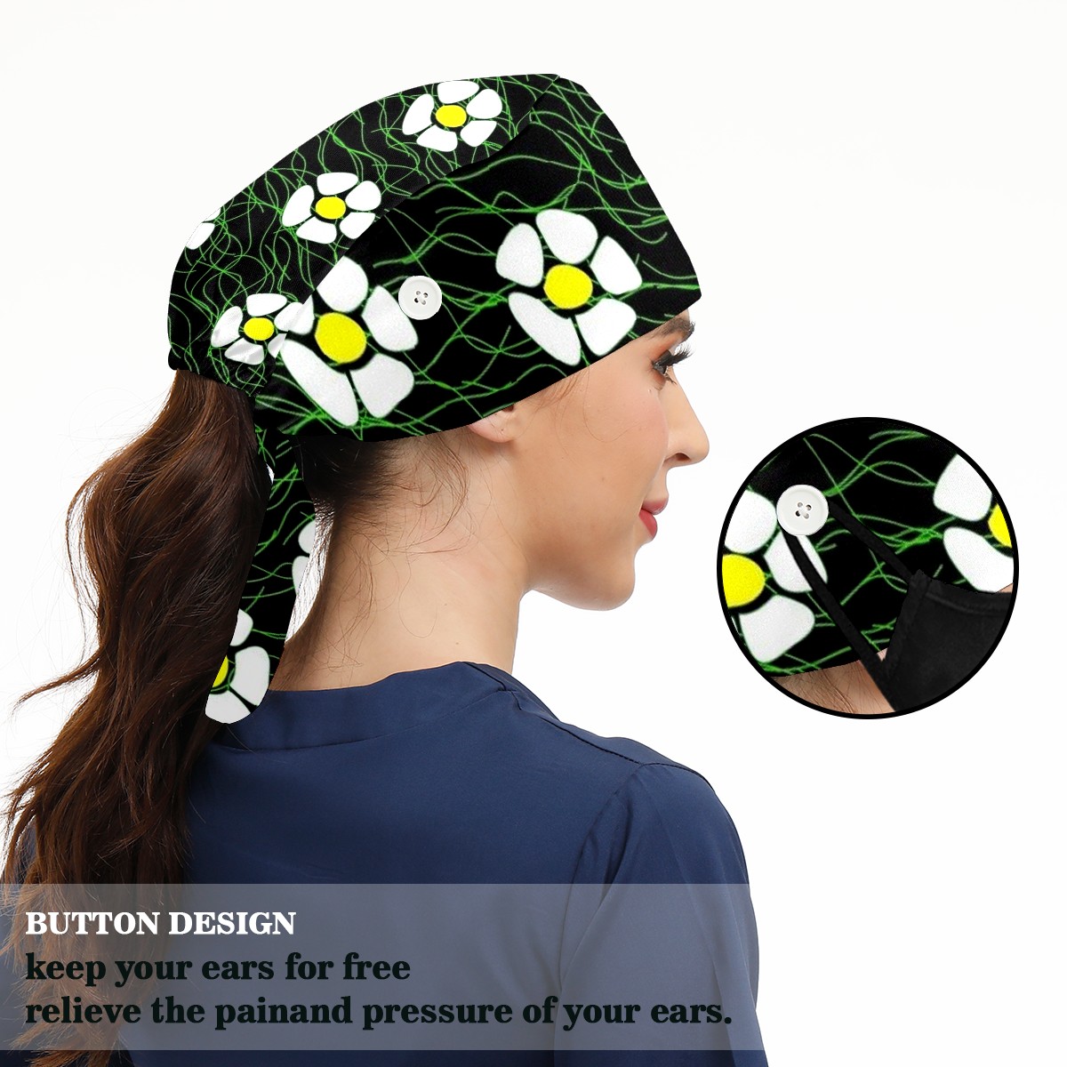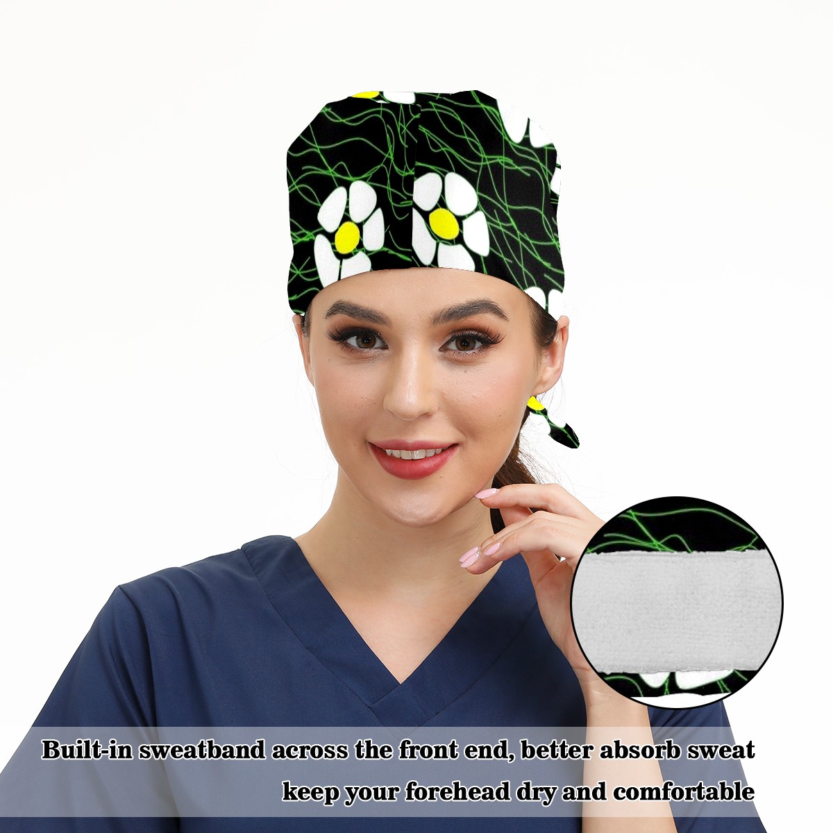 Working Caps with Button & Sweatband Satin Lined Cotton Adjustable Nurse Hats Elastic Band Scrub Cap Surgeon Hat Flower