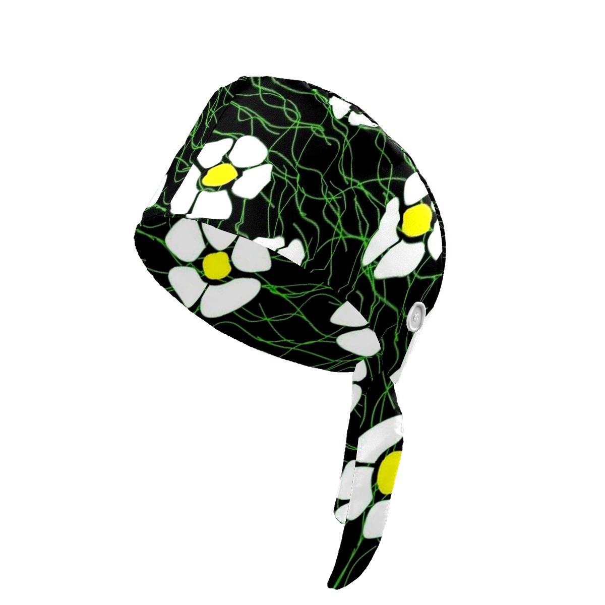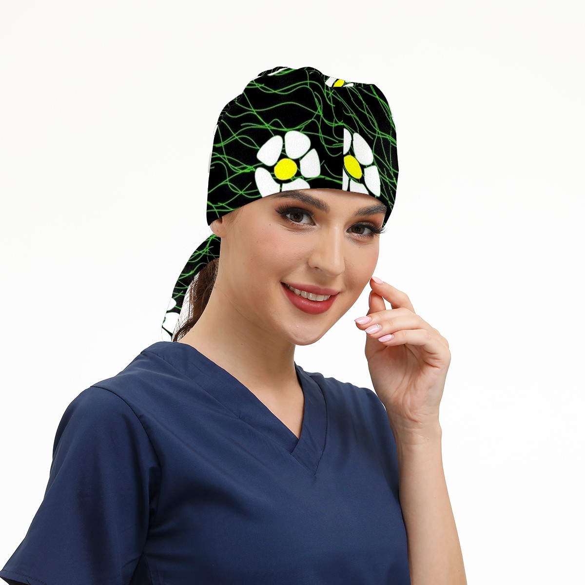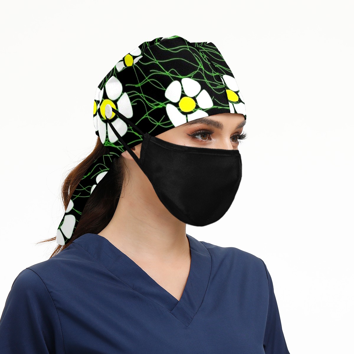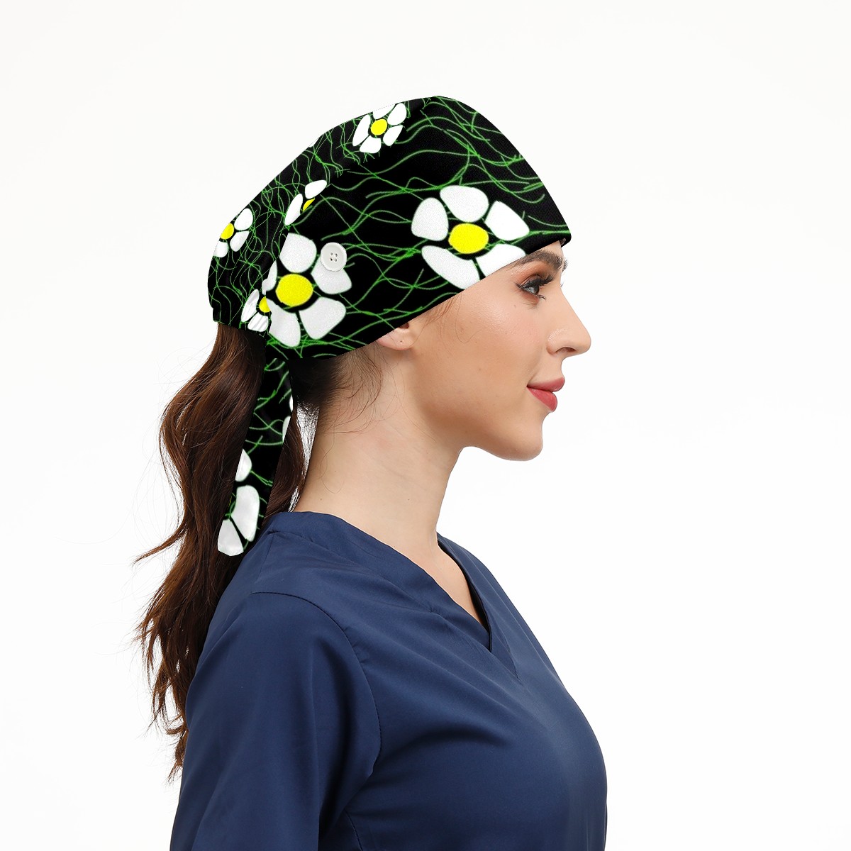 Working Caps with Button & Sweatband Satin Lined Cotton Adjustable Nurse Hats Elastic Band Scrub Cap Surgeon Hat Flower