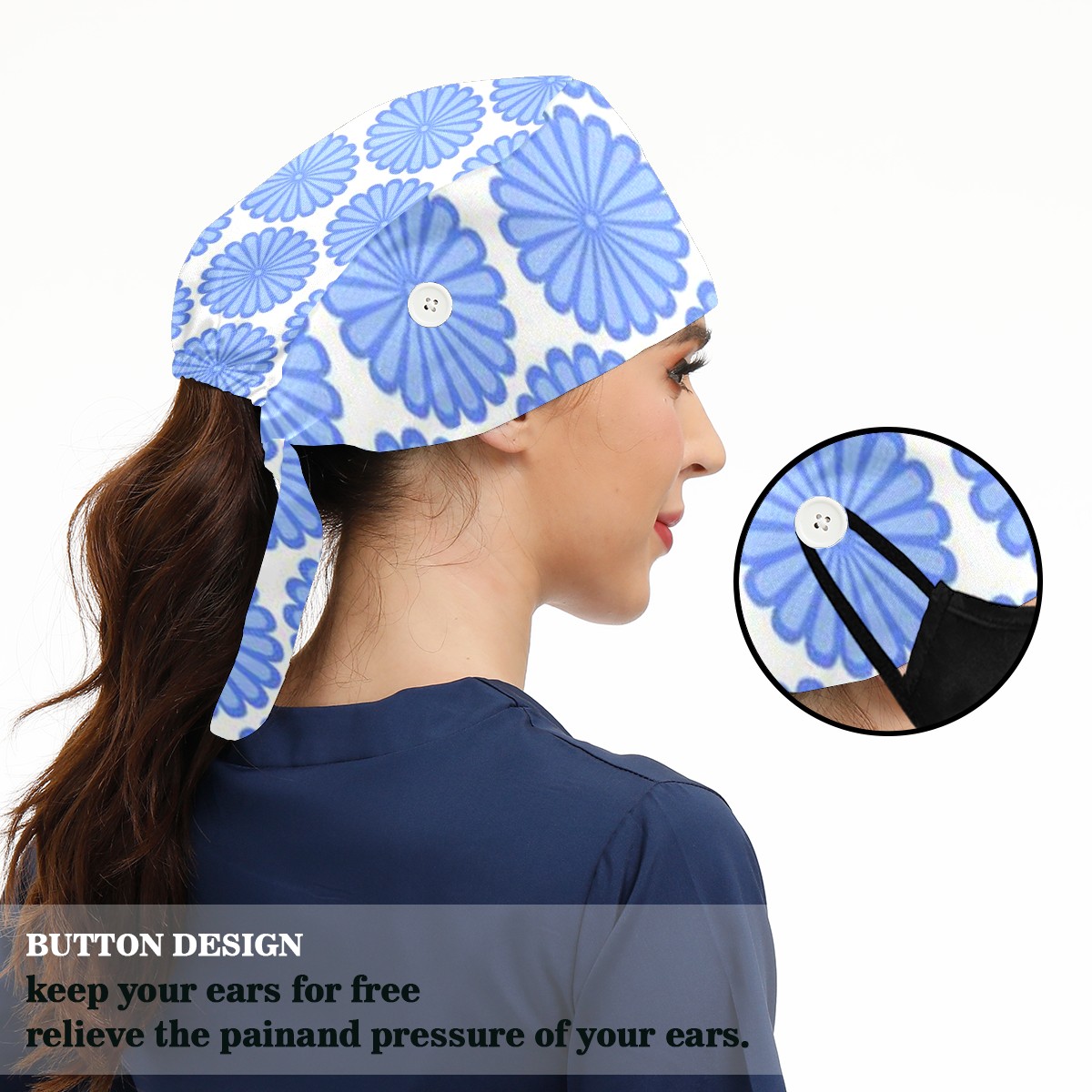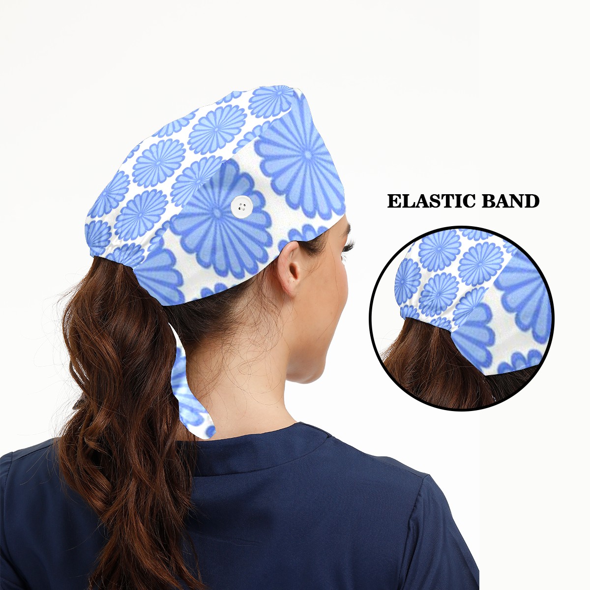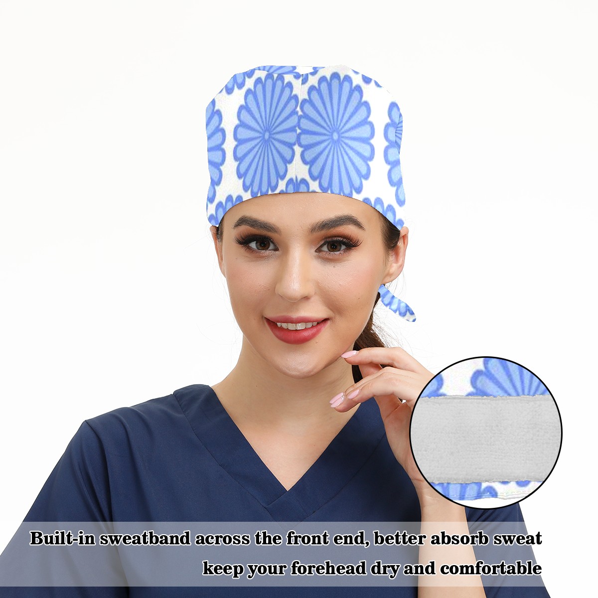 Working Caps with Button & Sweatband Satin Lined Cotton Adjustable Nurse Hats Elastic Band Scrub Cap Surgeon Hat Flower