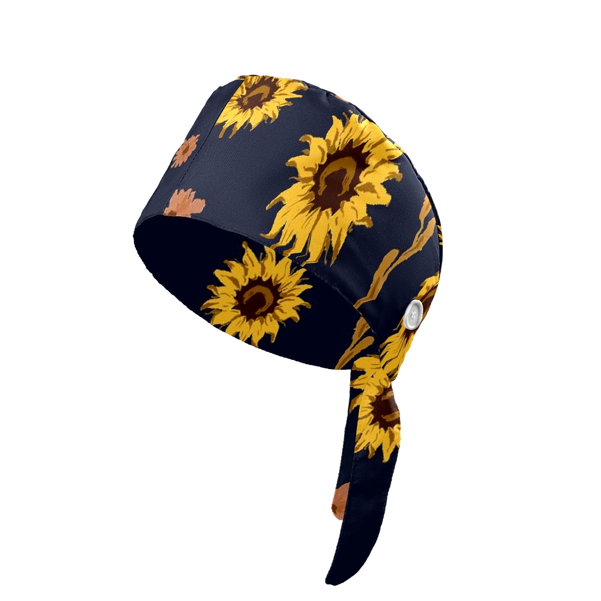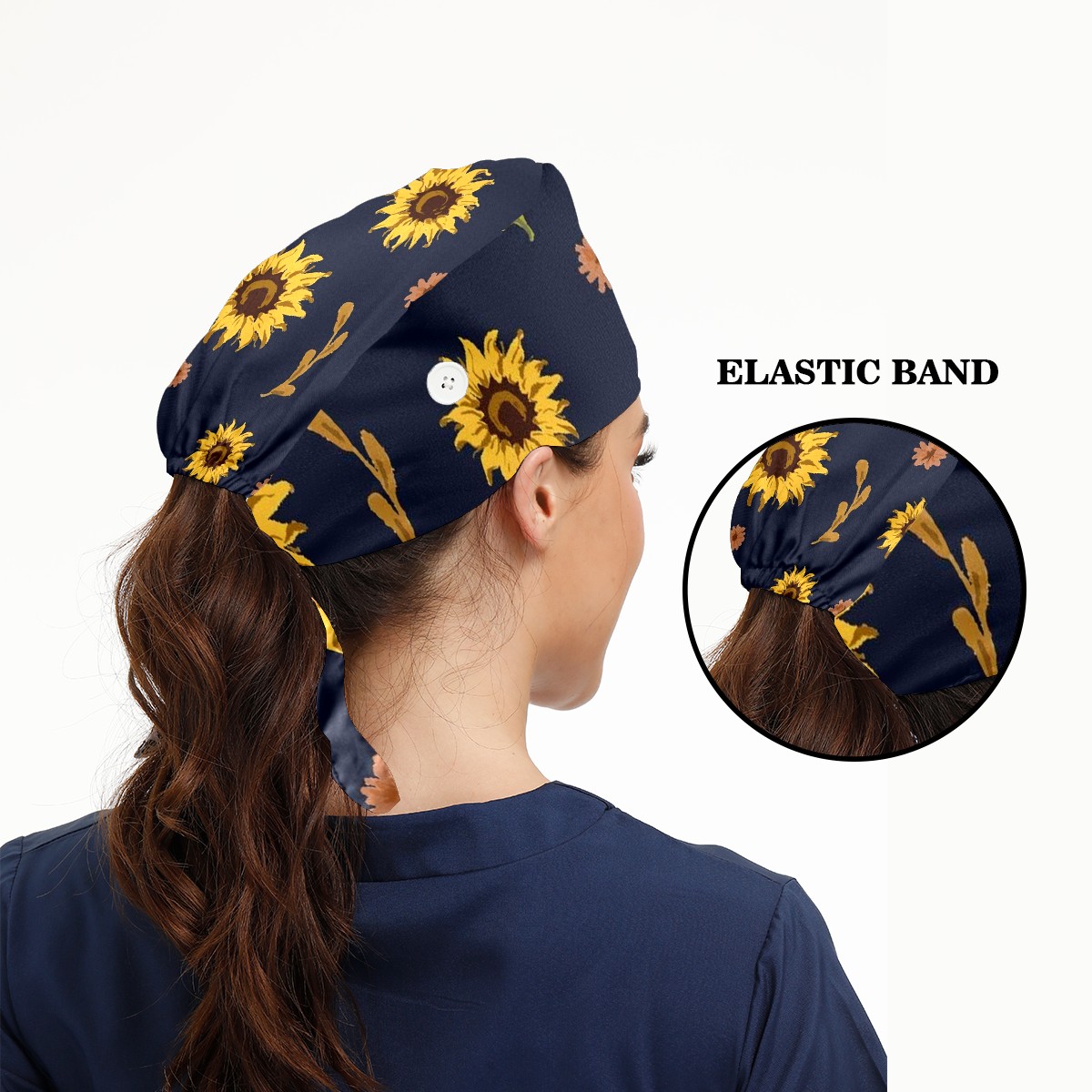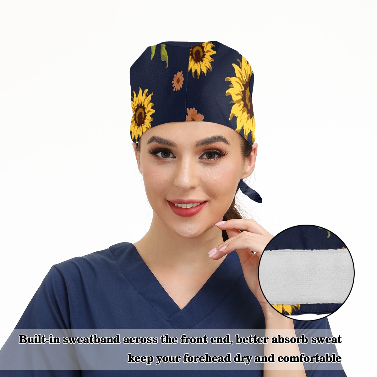 Working Caps with Button & Sweatband Satin Lined Cotton Adjustable Nurse Hats Elastic Band Scrub Cap Surgeon Hat Sunflower