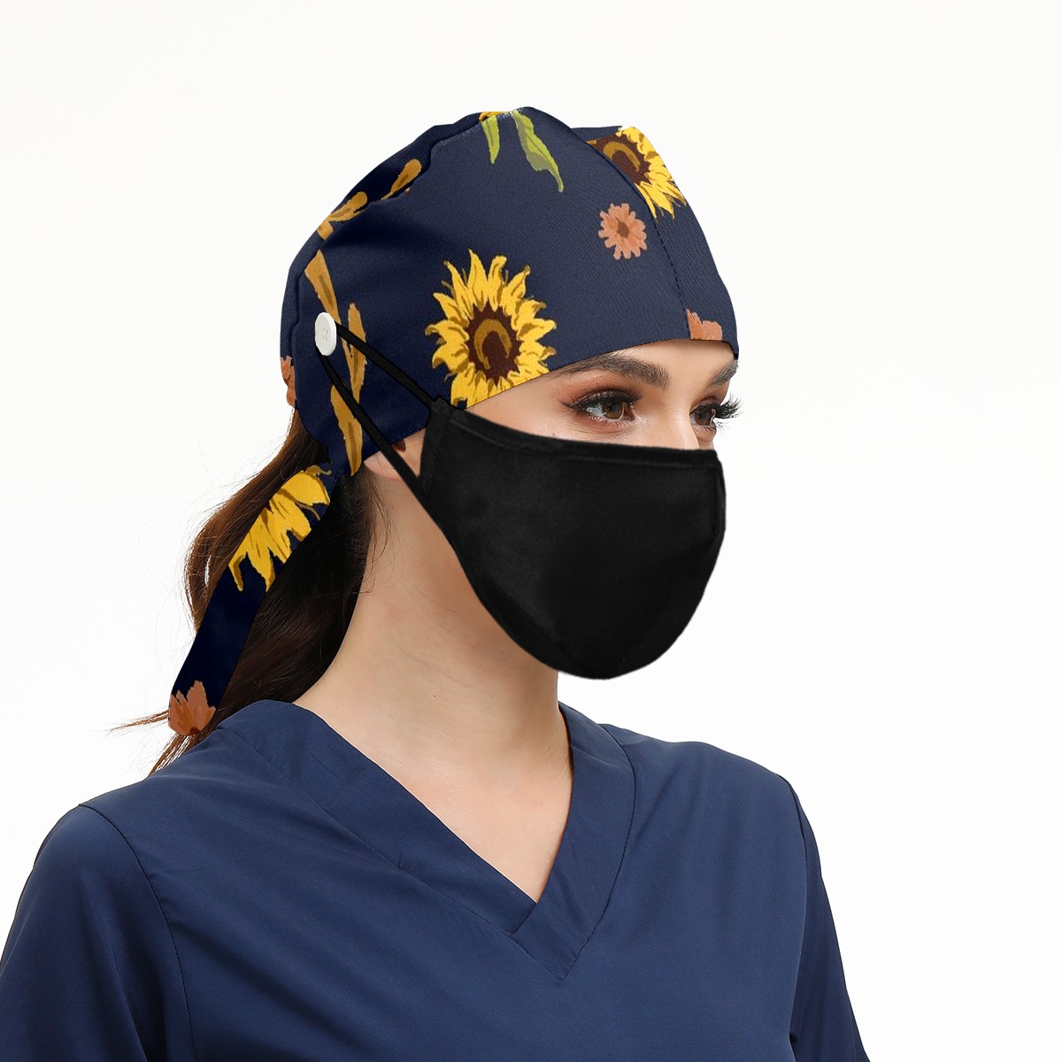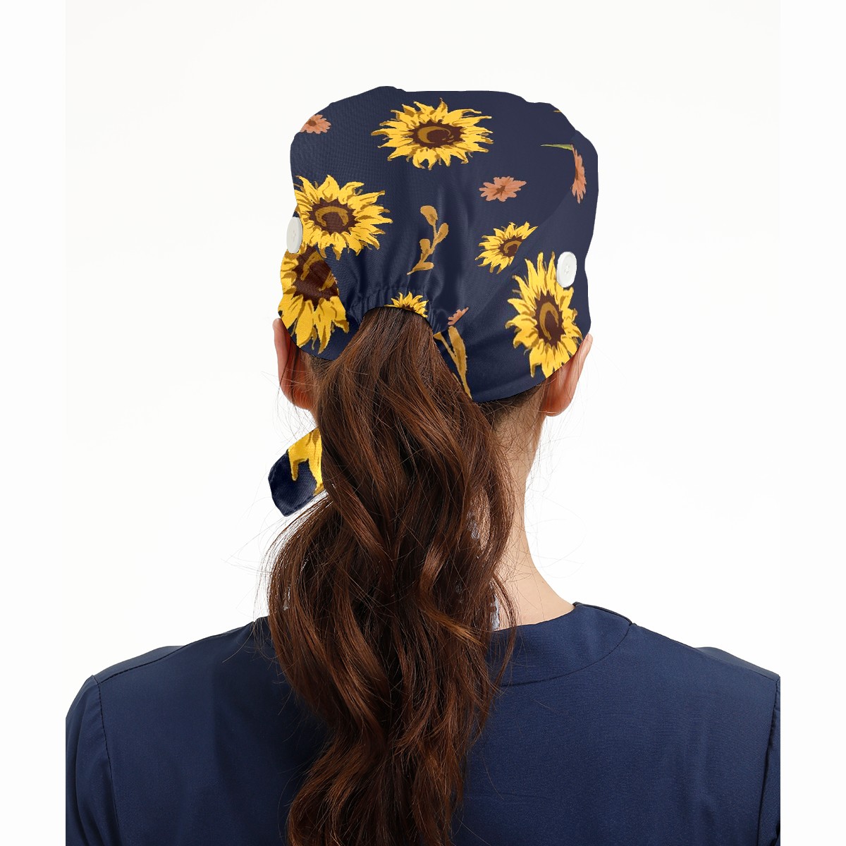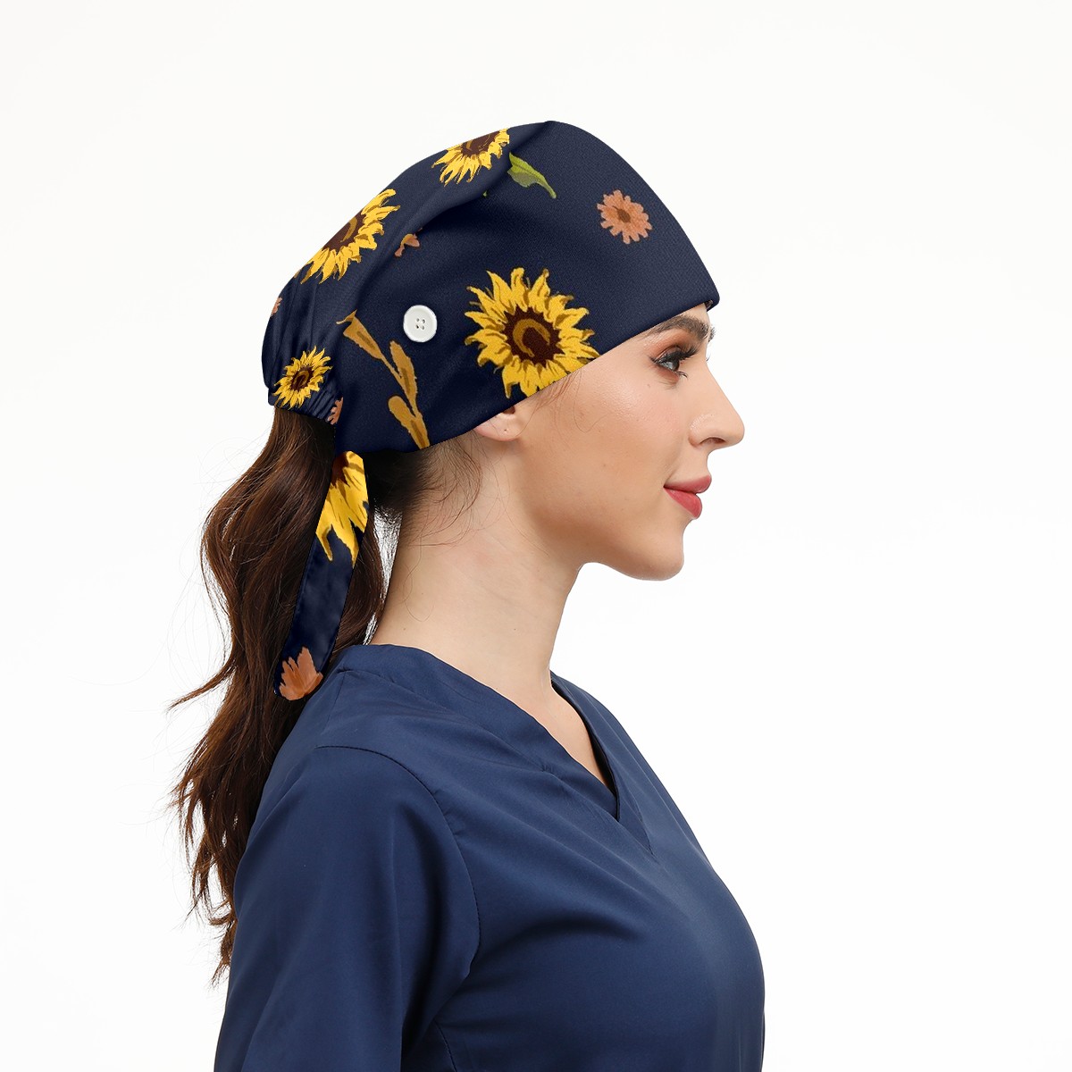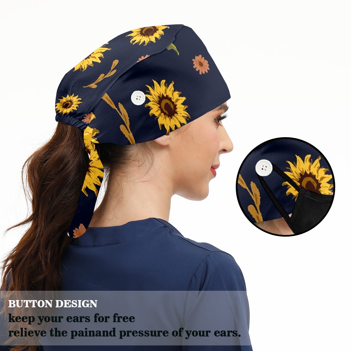 Working Caps with Button & Sweatband Satin Lined Cotton Adjustable Nurse Hats Elastic Band Scrub Cap Surgeon Hat Sunflower
