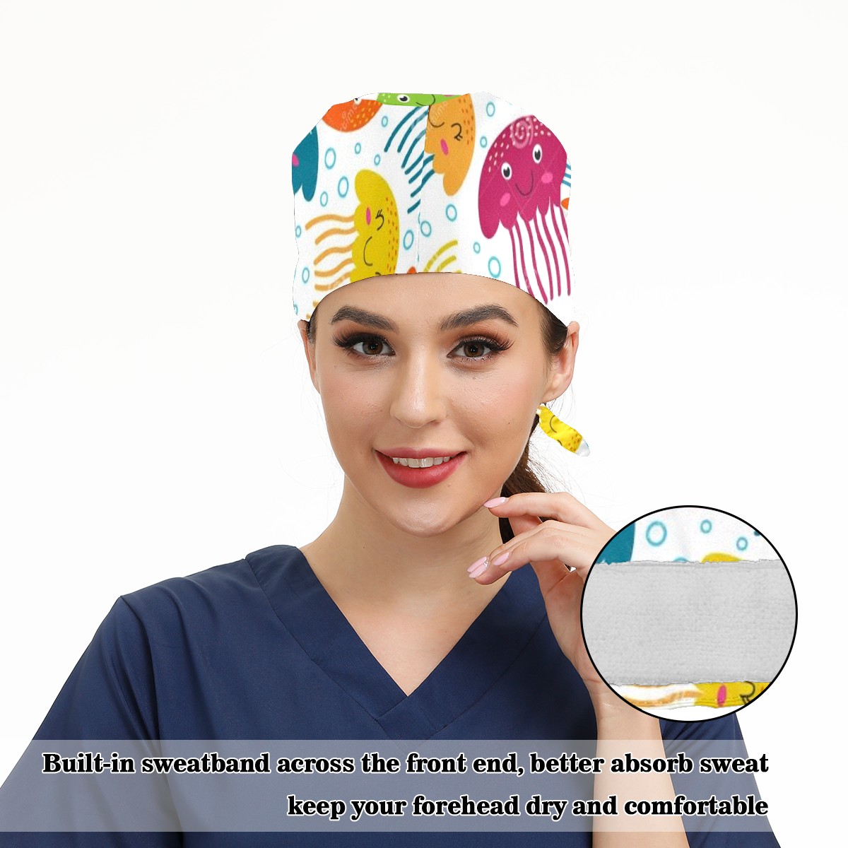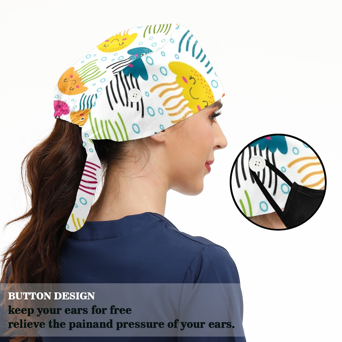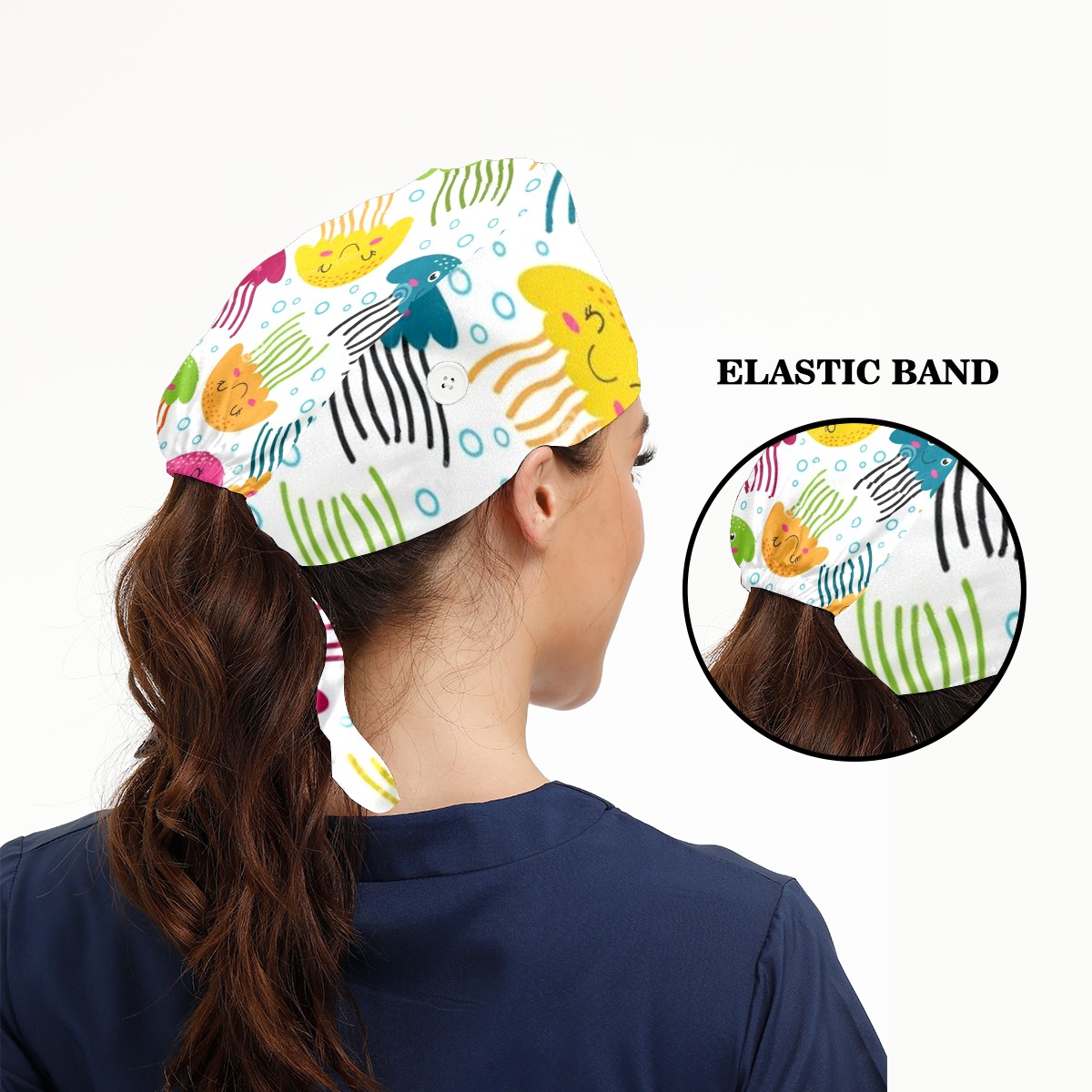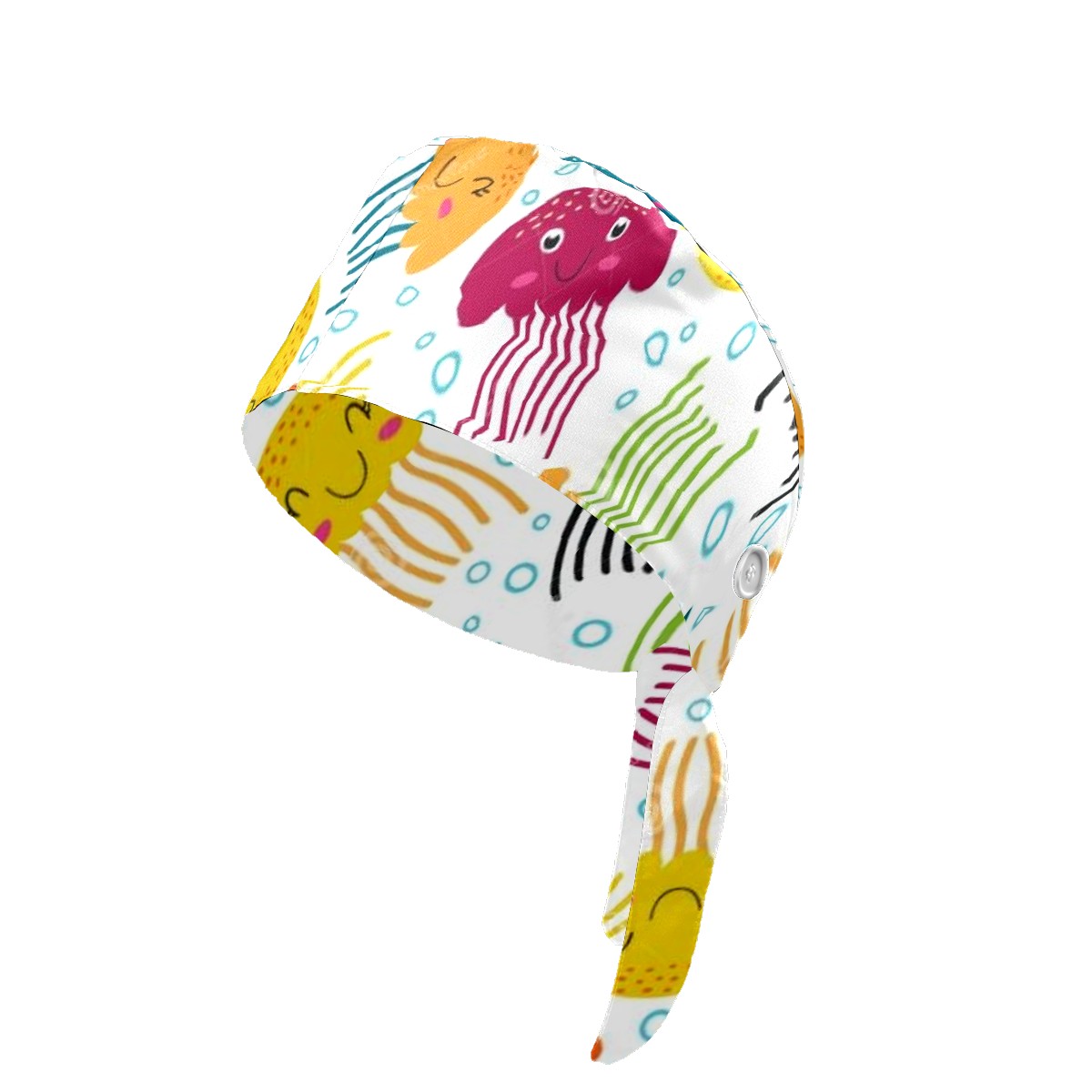 Working Caps with Button & Sweatband Satin Lined Cotton Adjustable Nurse Hats Elastic Band Scrub Cap Surgeon Hat Jellyfish