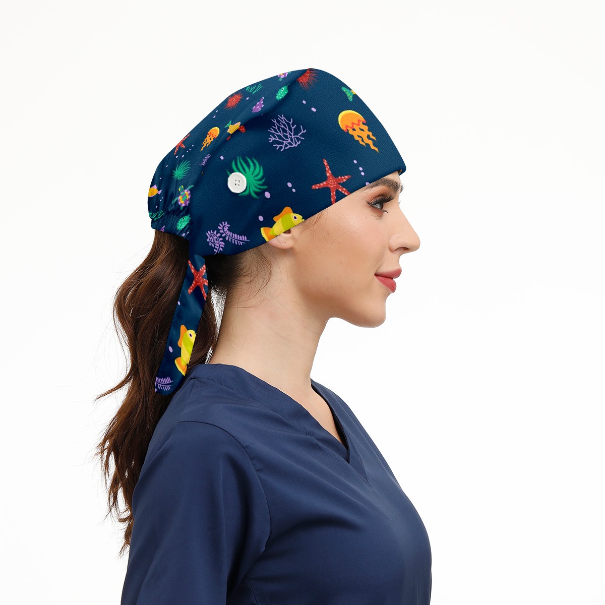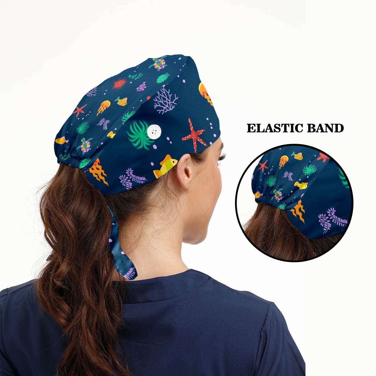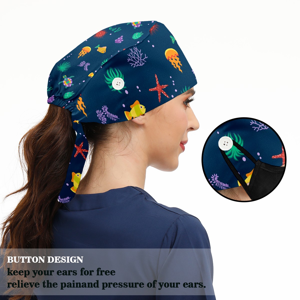 Working Caps with Button & Sweatband Satin Lined Cotton Adjustable Nurse Hats Elastic Band Scrub Cap Surgeon Hat Seabed