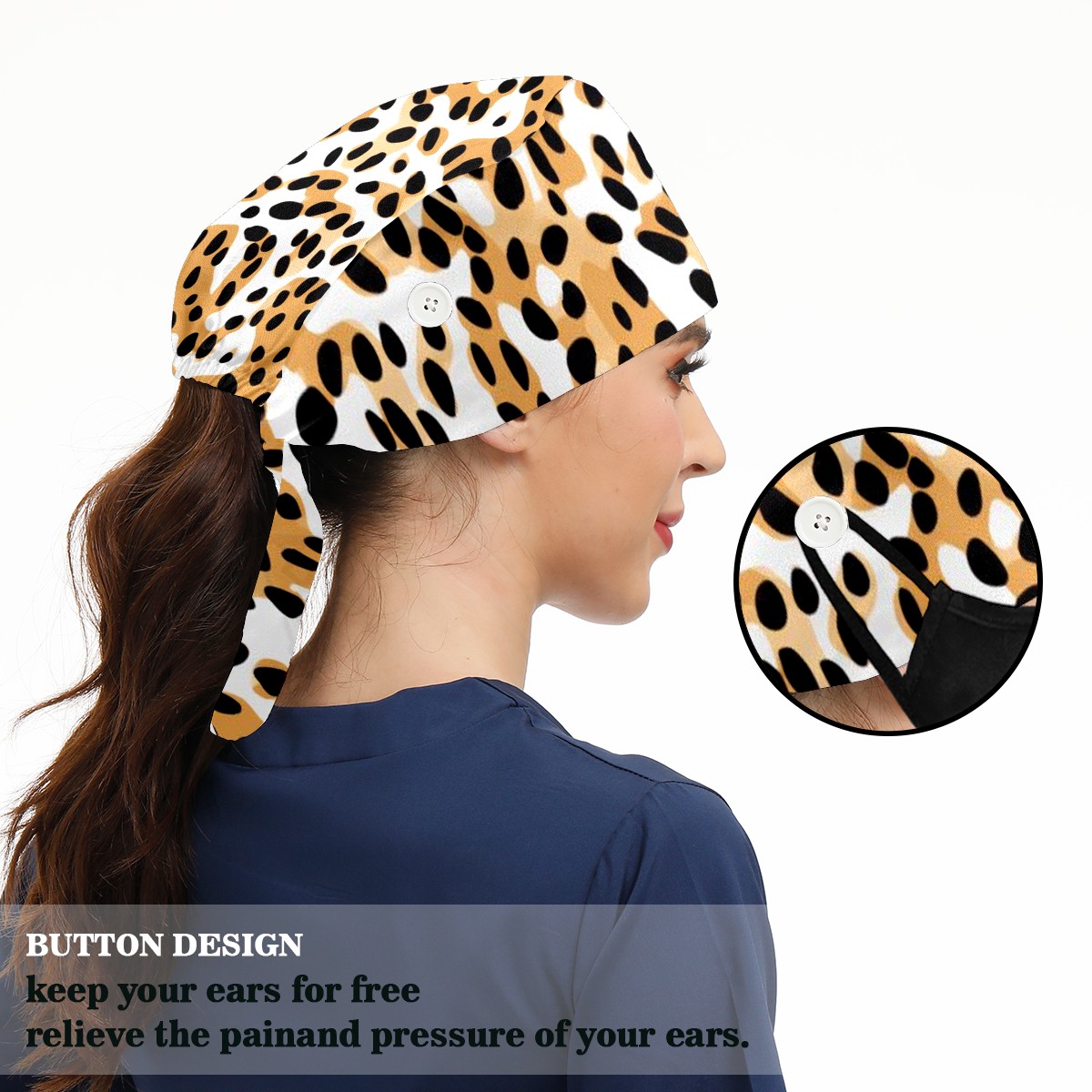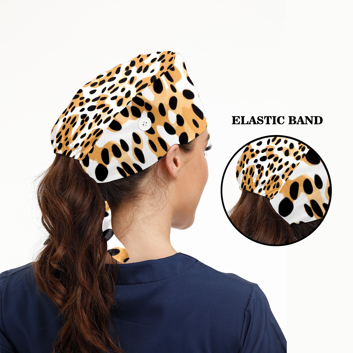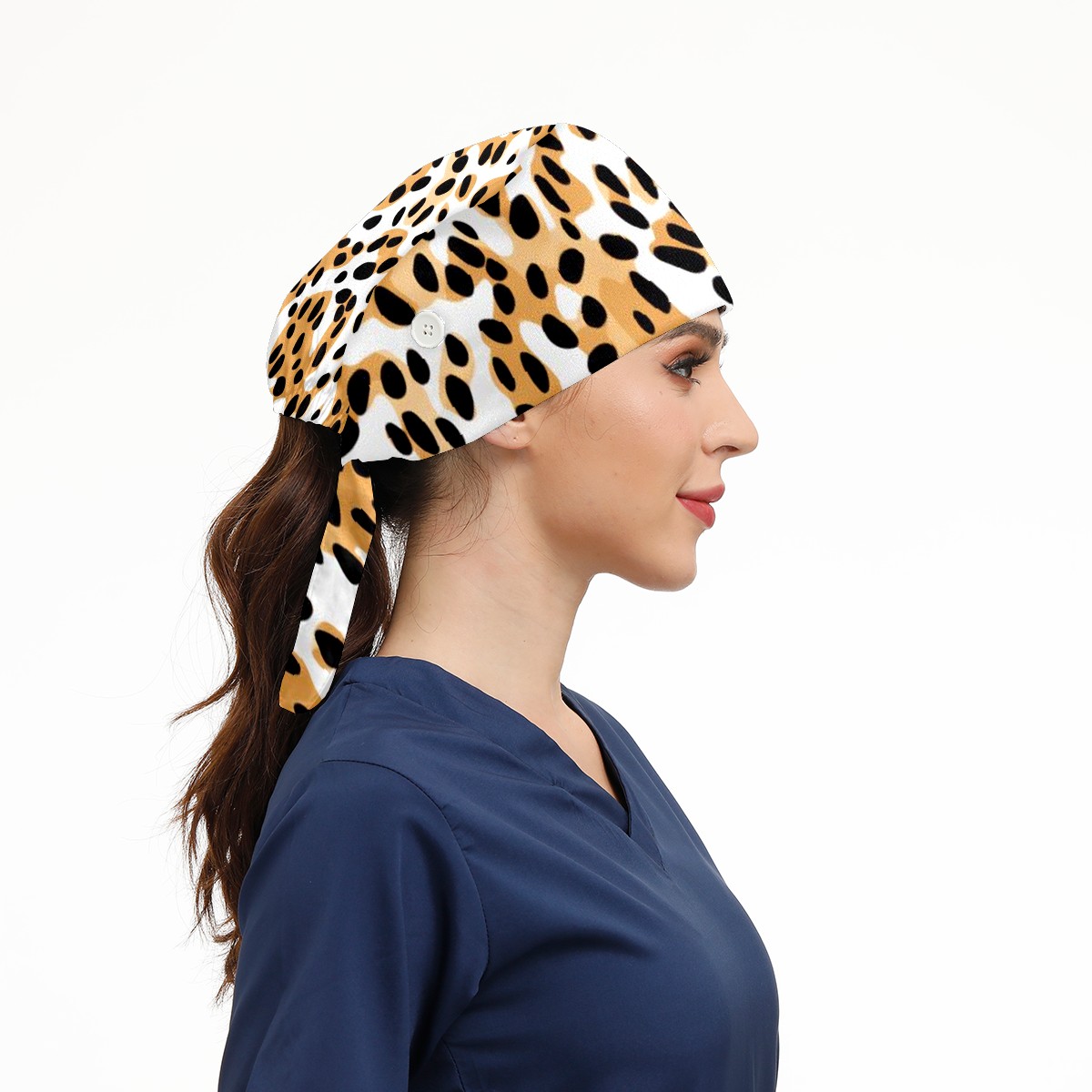 Working Caps with Button & Sweatband Satin Lined Cotton Adjustable Nurse Hats Elastic Band Scrub Cap Surgeon Hat Leopard