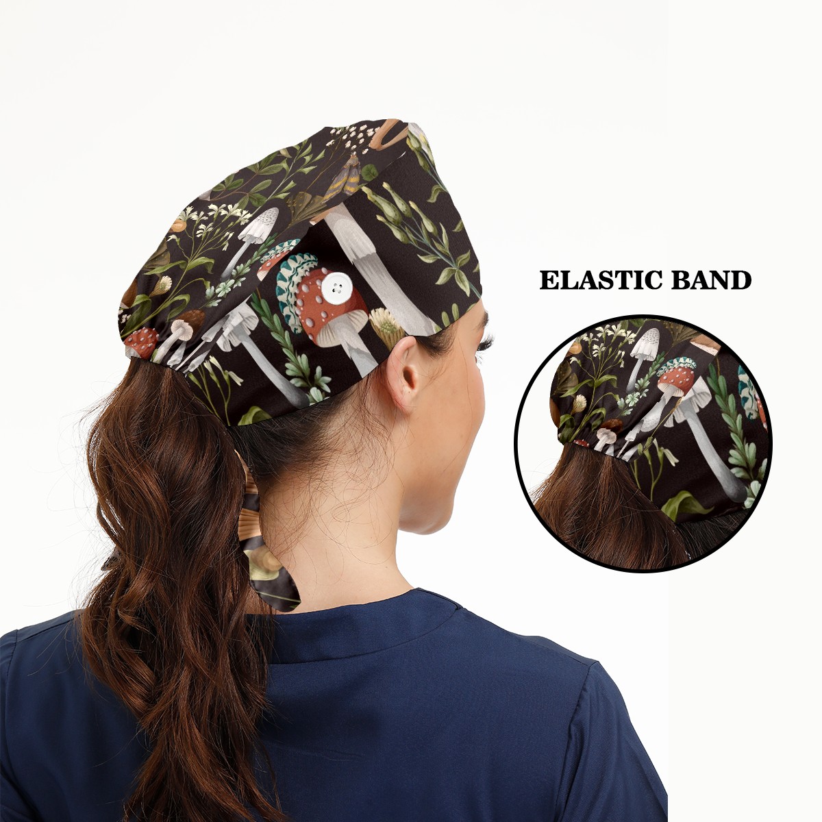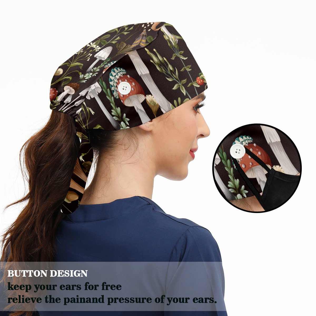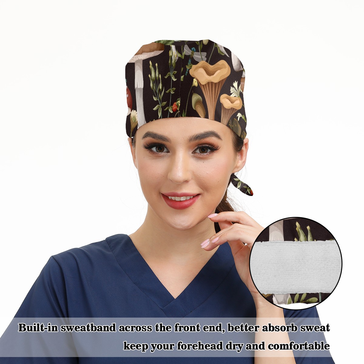 Working Caps with Button & Sweatband Satin Lined Cotton Adjustable Nurse Hats Elastic Band Scrub Cap Surgeon Hat Autumn Mushroom Berry Bug