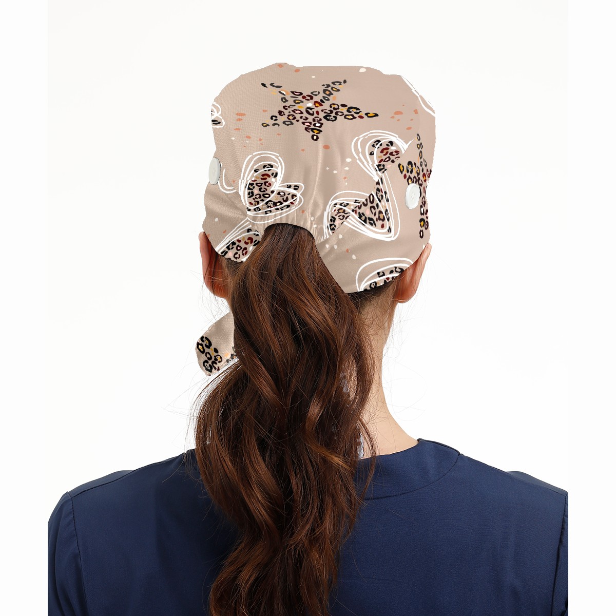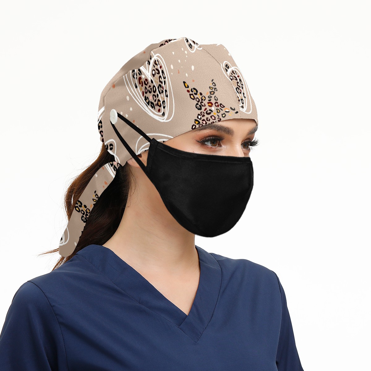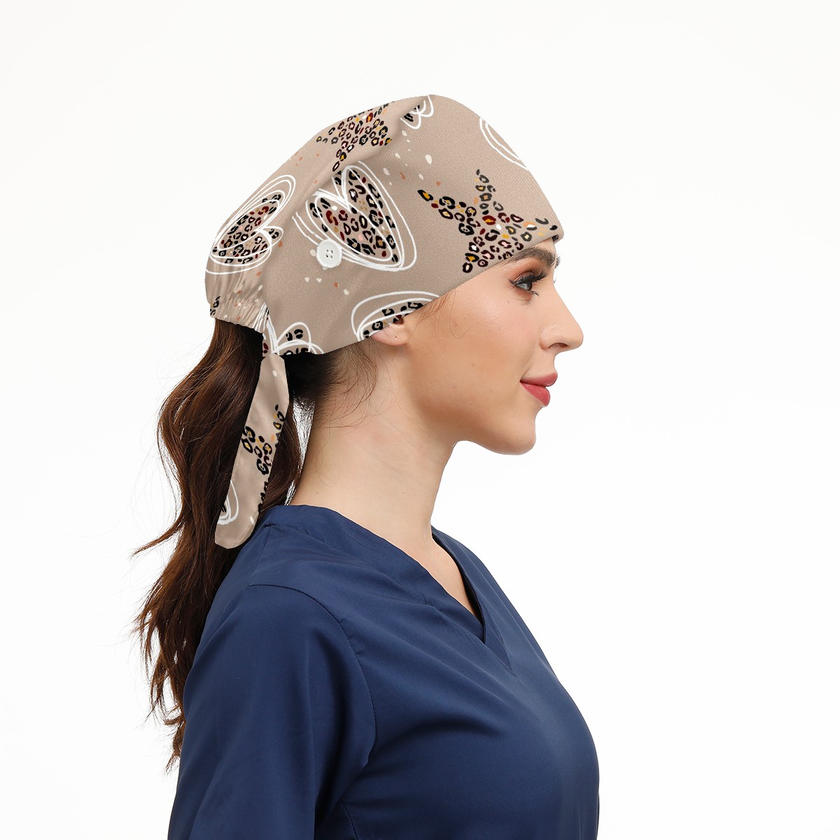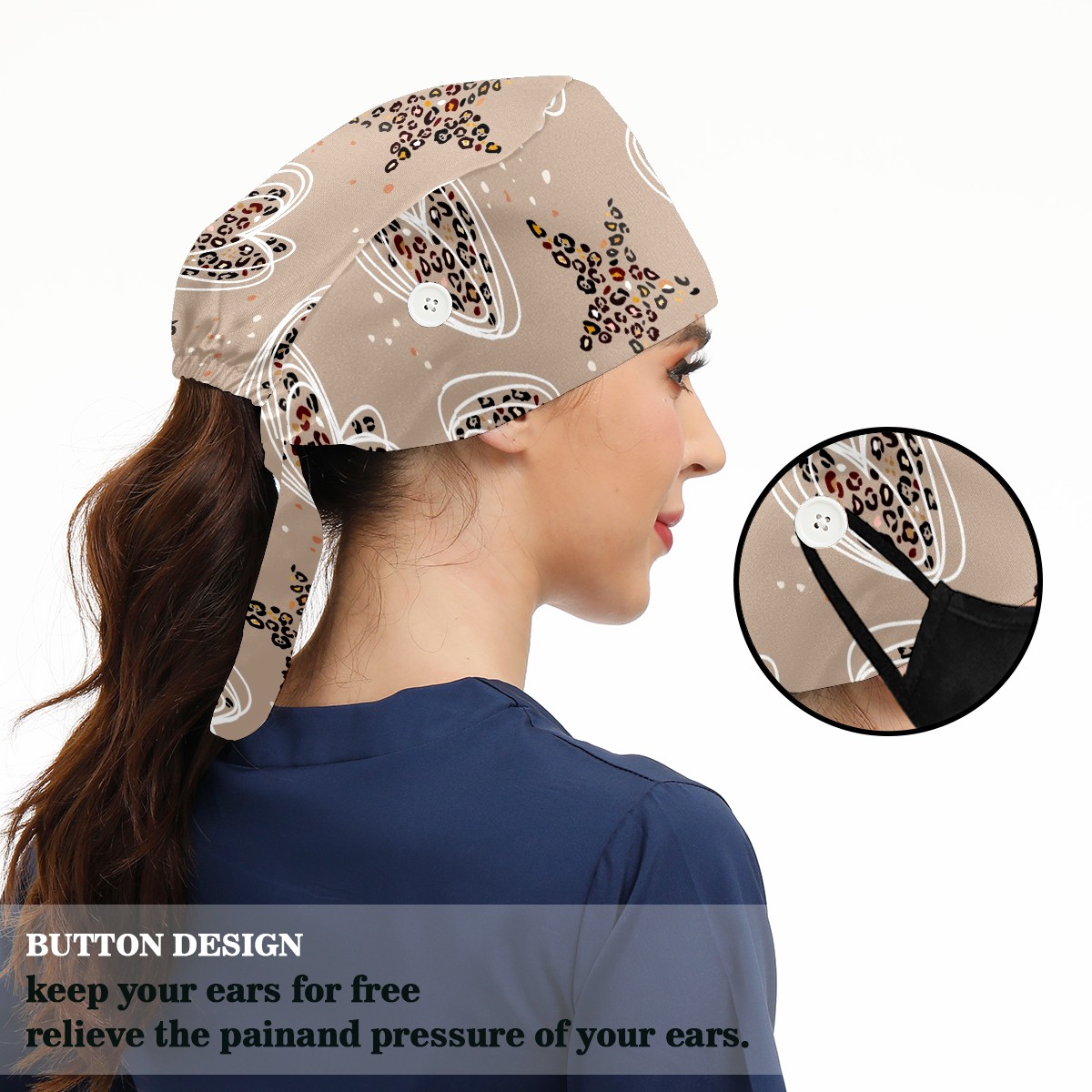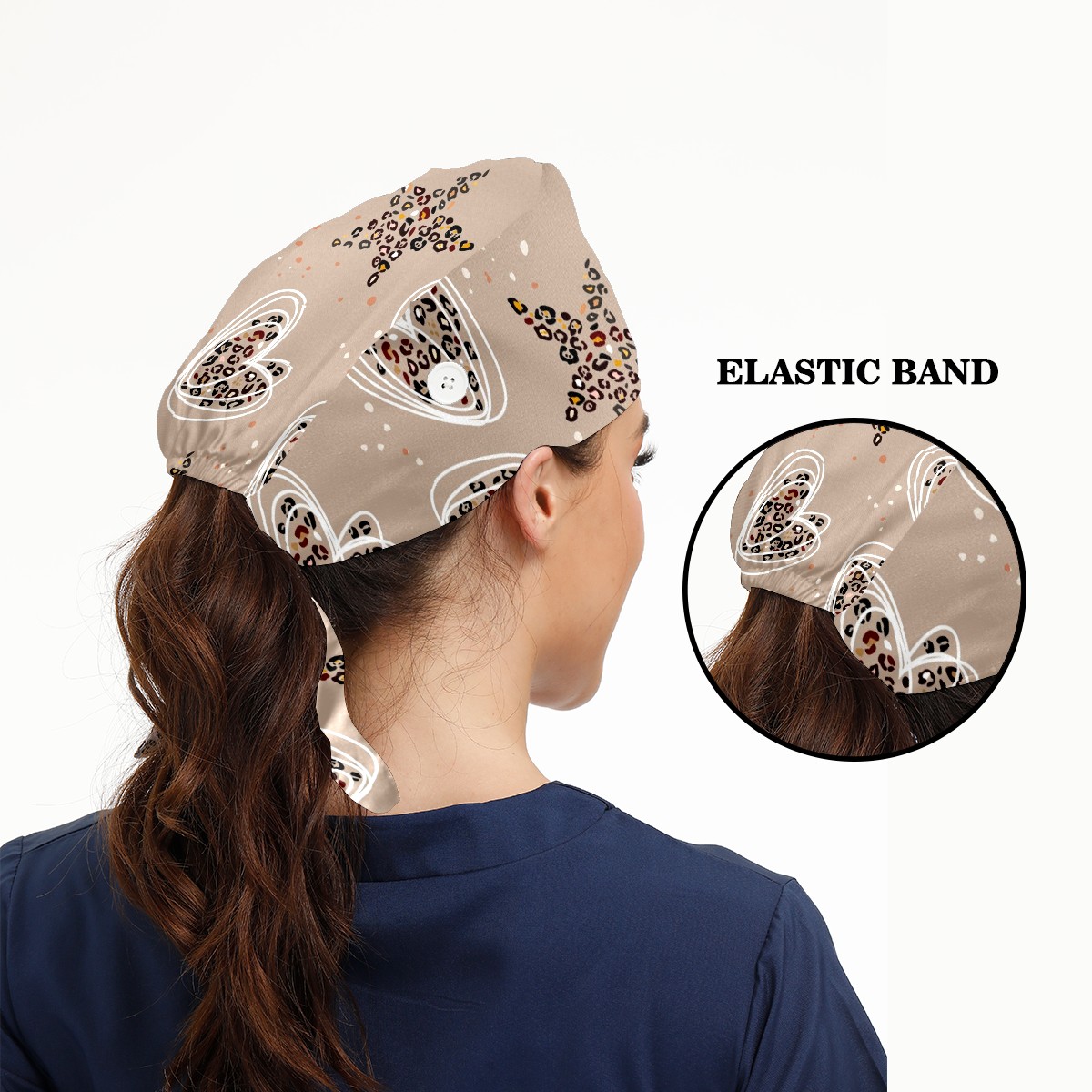 Working Caps with Button & Sweatband Satin Lined Cotton Adjustable Nurse Hats Elastic Band Scrub Cap Surgeon Hat Heart Star Leopard