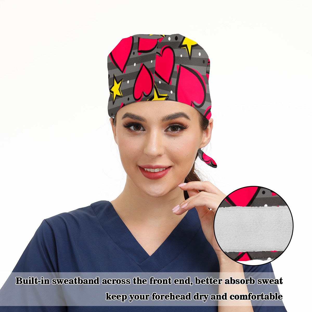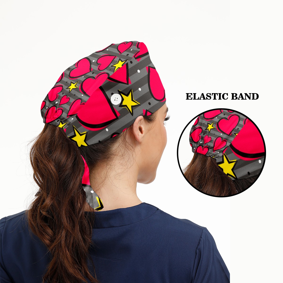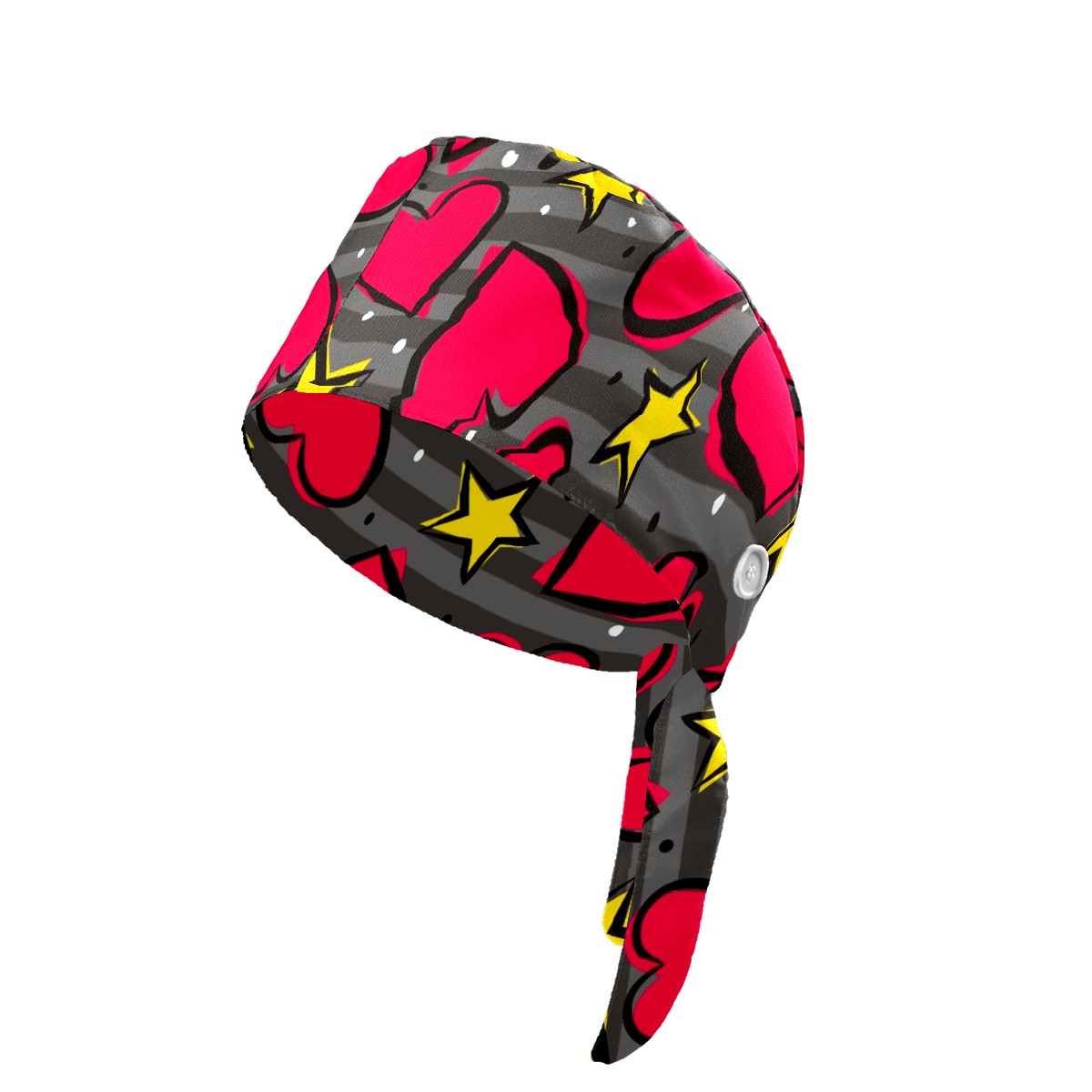 Working Caps with Button & Sweatband Satin Lined Cotton Adjustable Nurse Hats Elastic Band Scrub Cap Surgeon Hat Heart And Star On Striped Gray Background