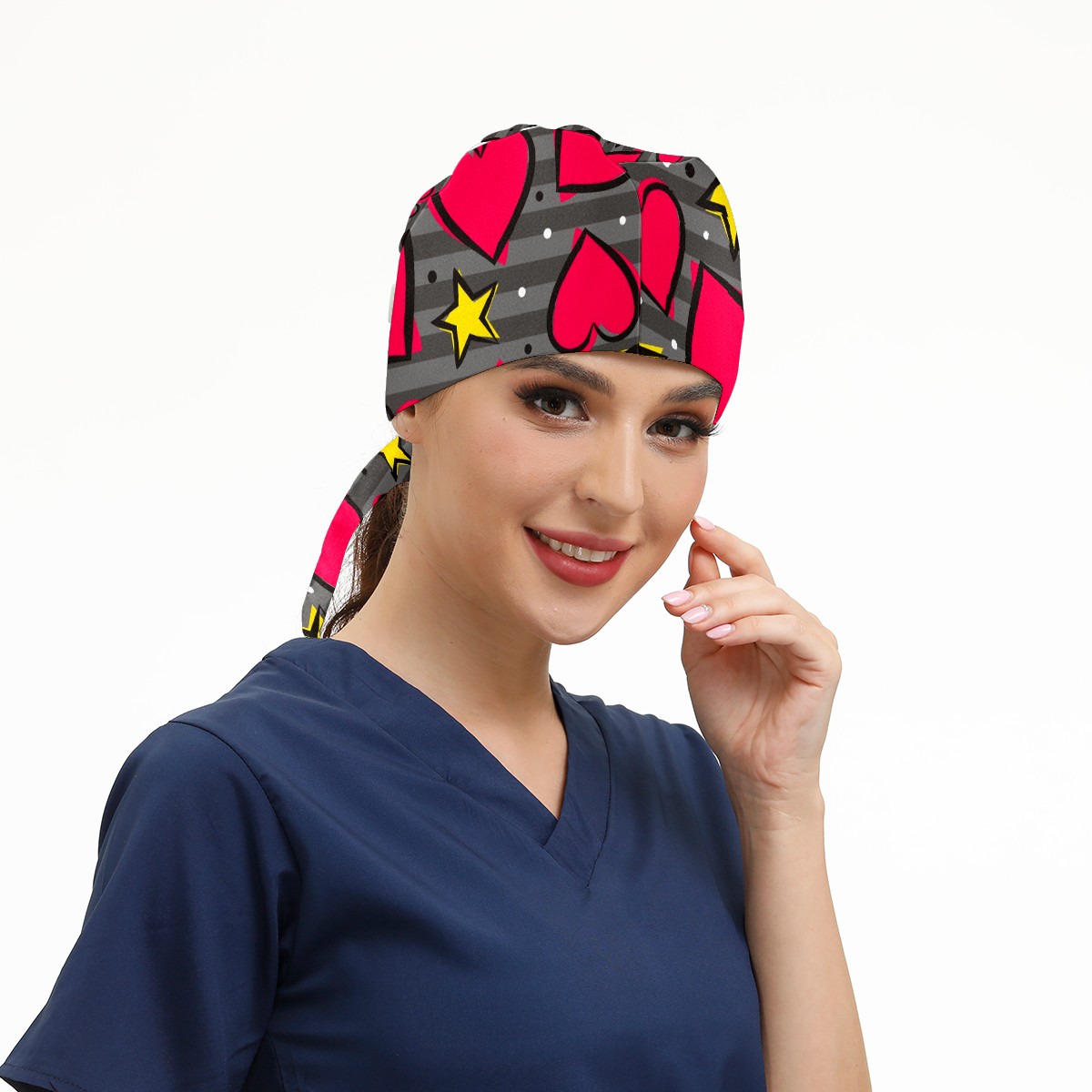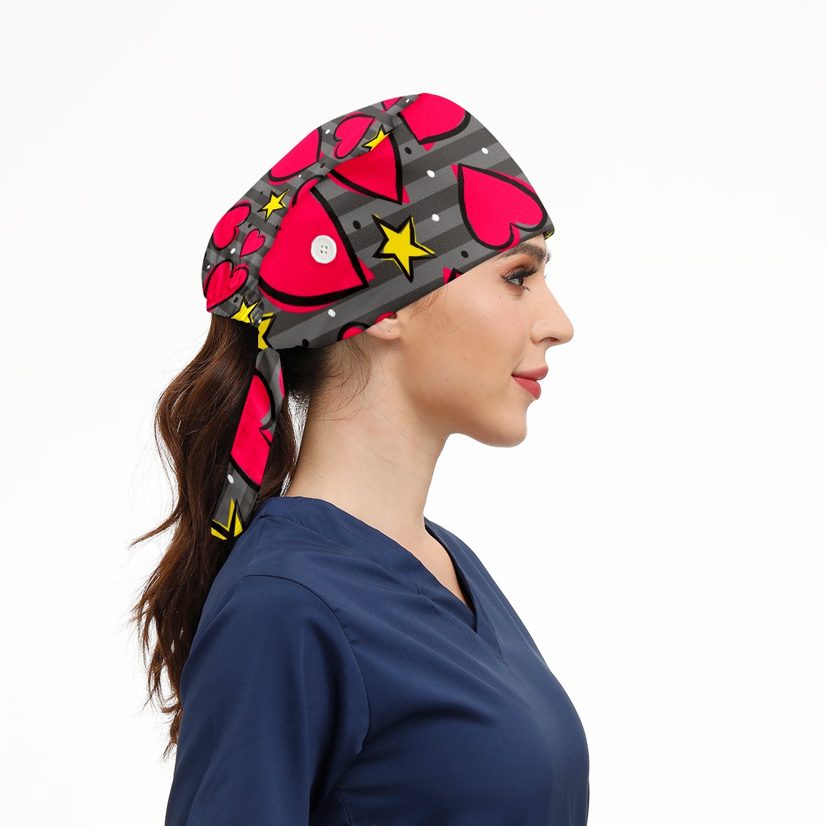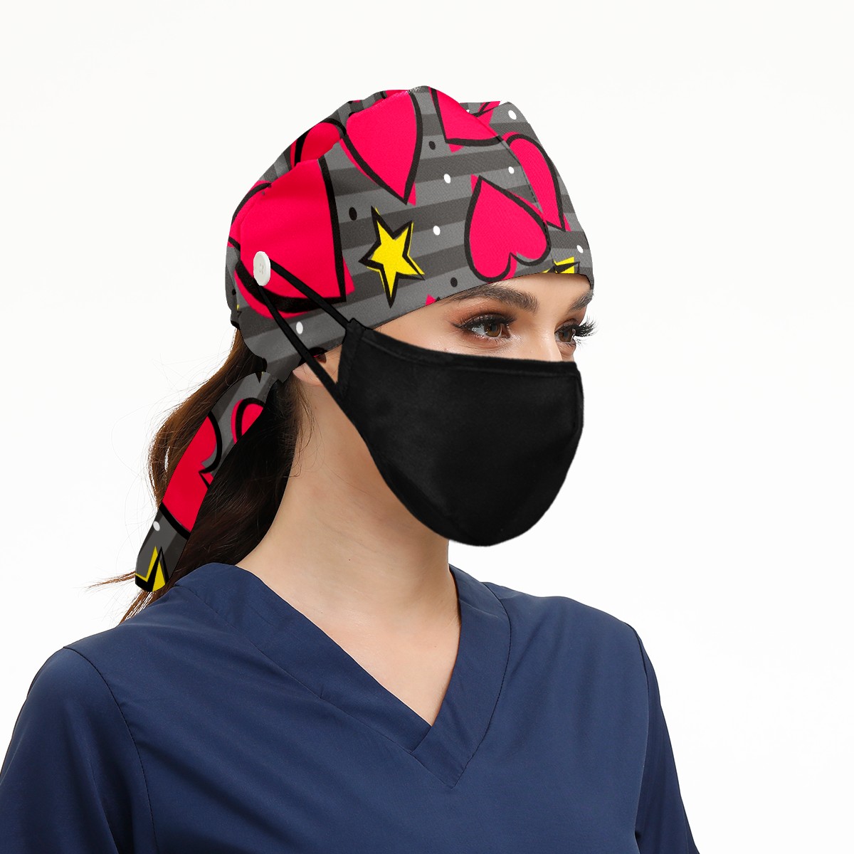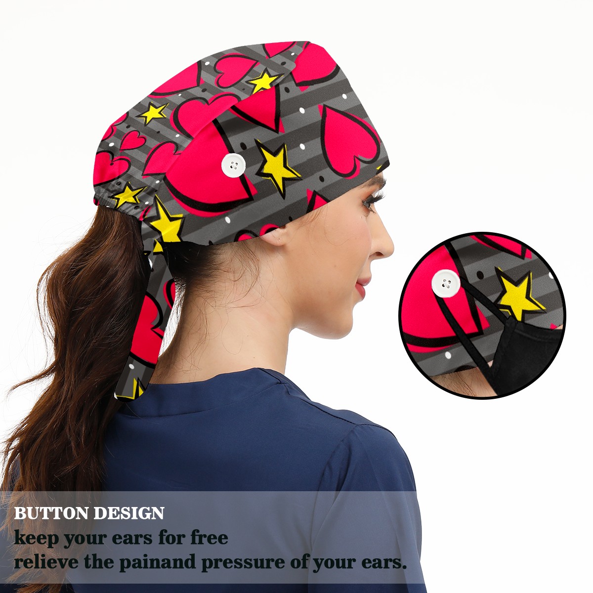 Working Caps with Button & Sweatband Satin Lined Cotton Adjustable Nurse Hats Elastic Band Scrub Cap Surgeon Hat Heart And Star On Striped Gray Background
