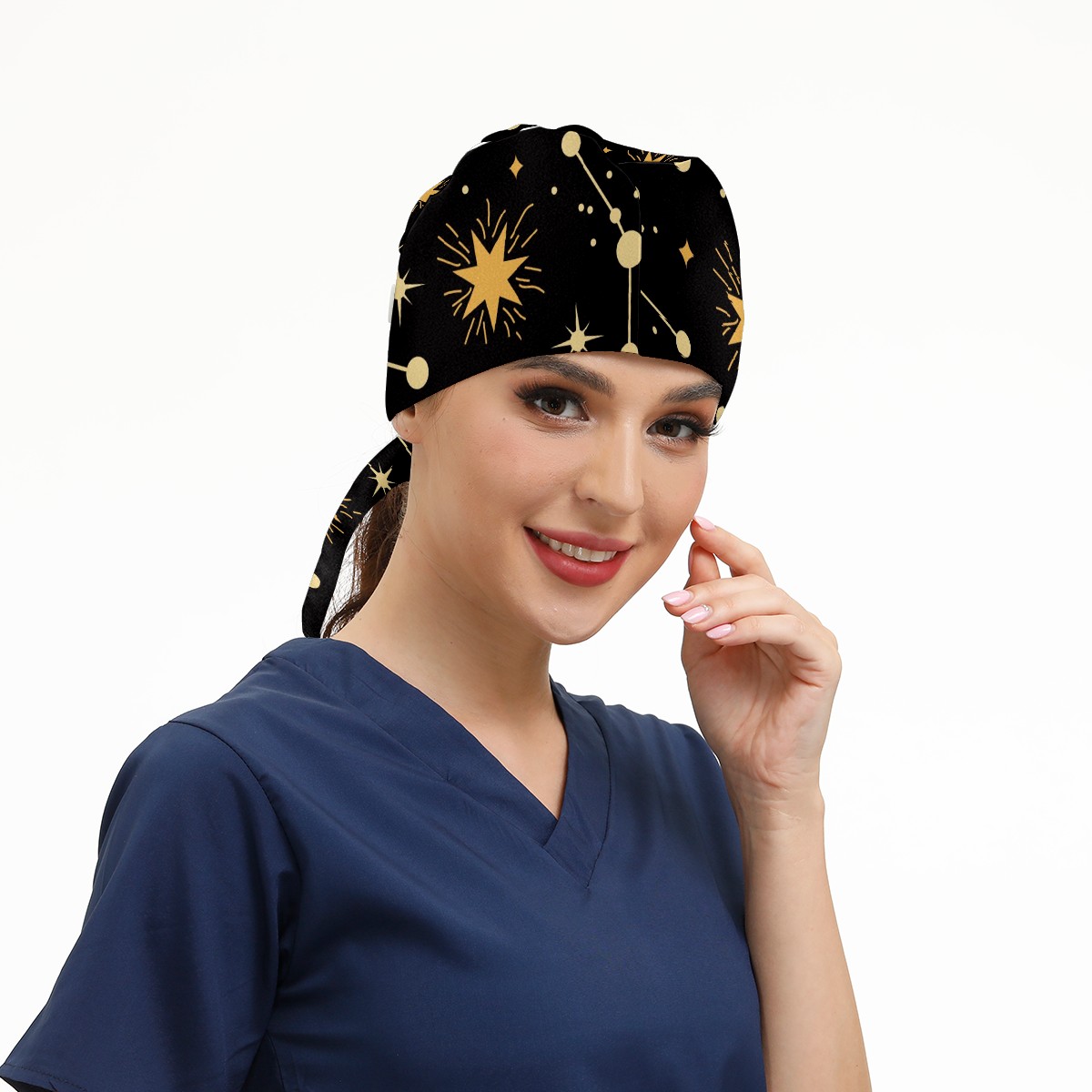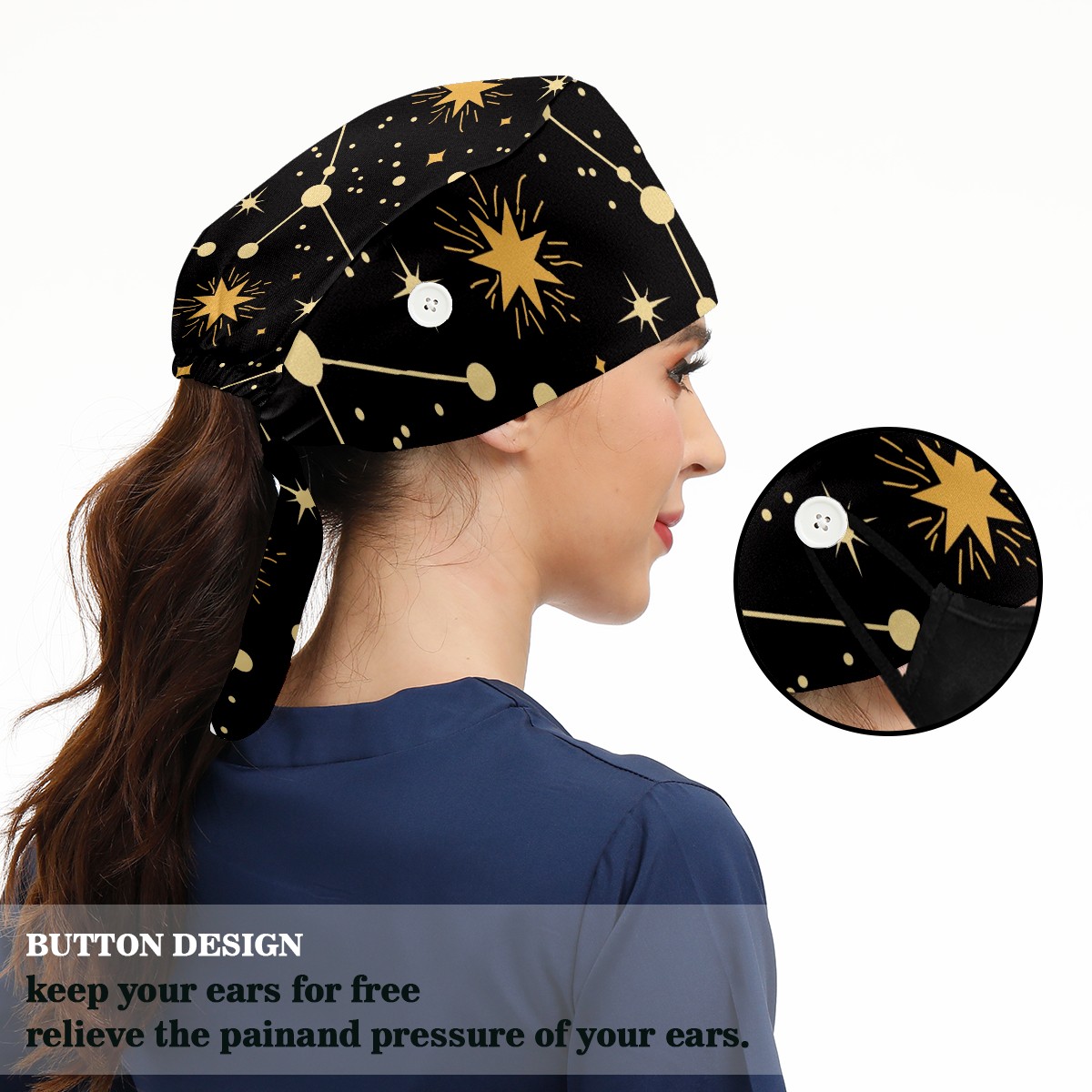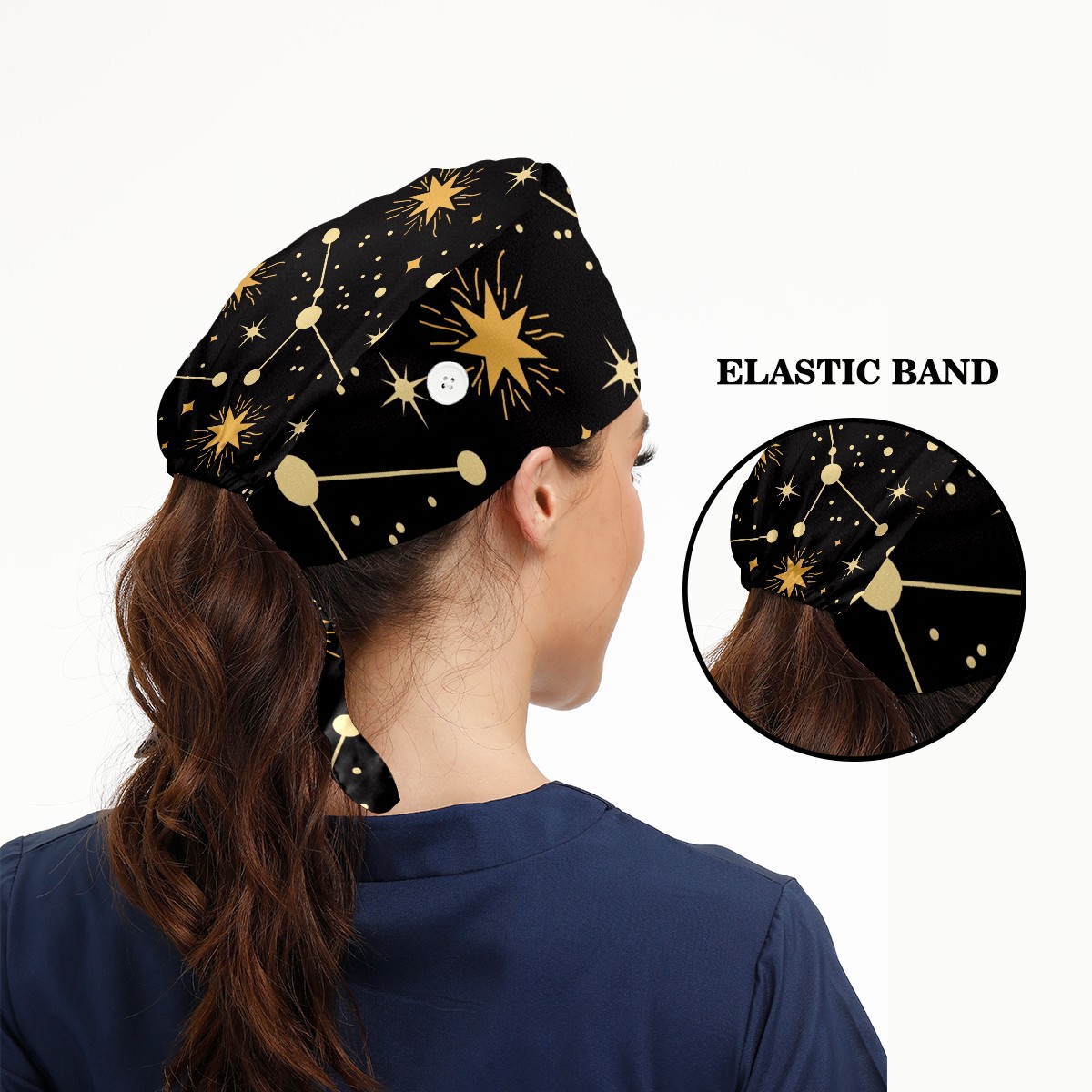 Working Caps with Button & Sweatband Satin Lined Cotton Adjustable Nurse Hats Elastic Band Scrub Cap Surgeon Hat Astrology Stars Constellation