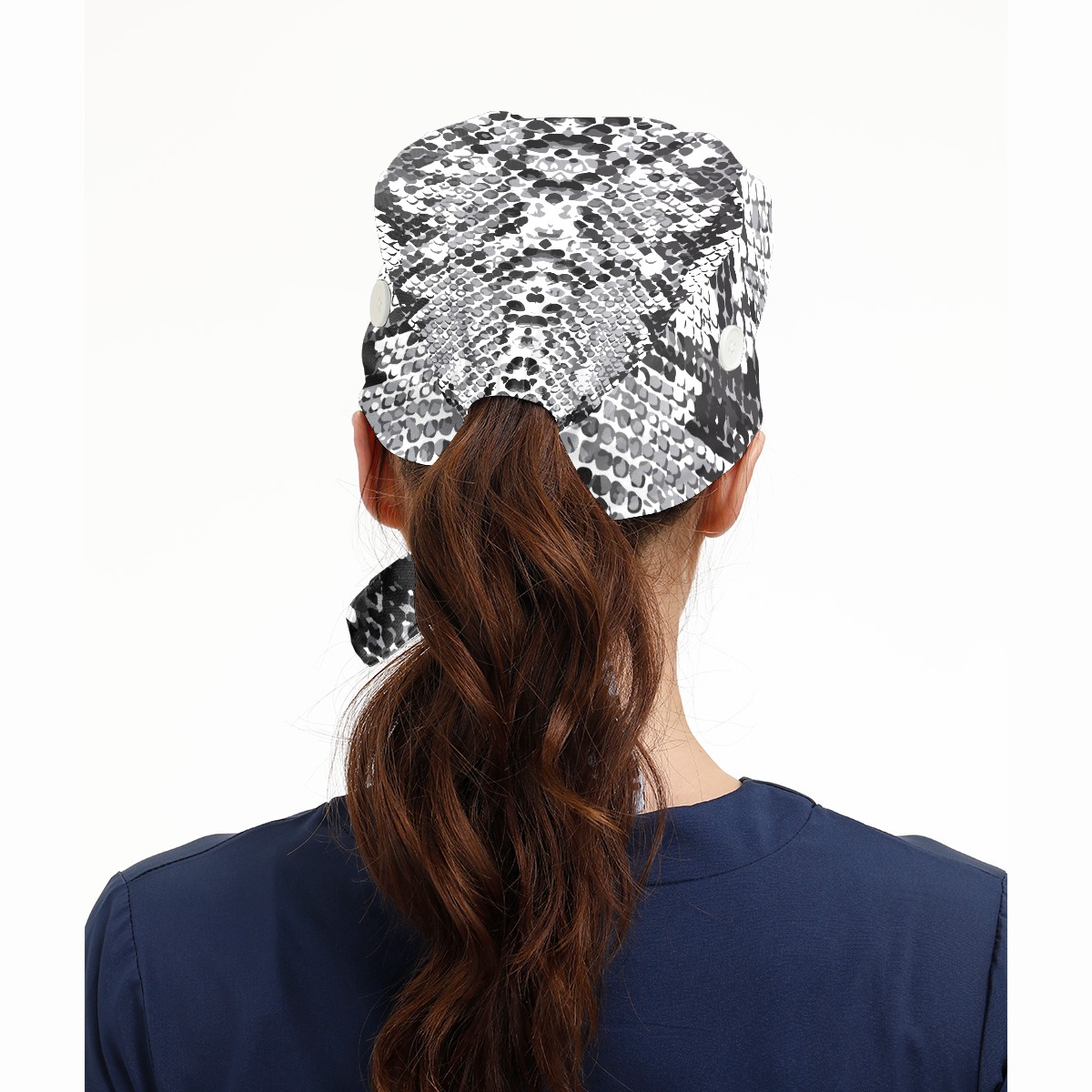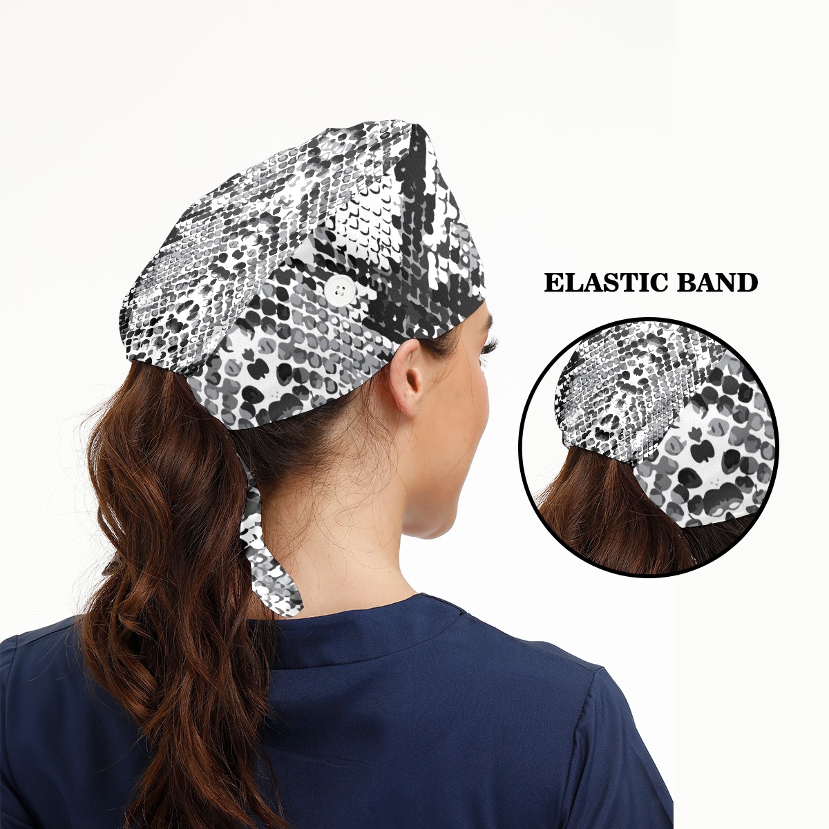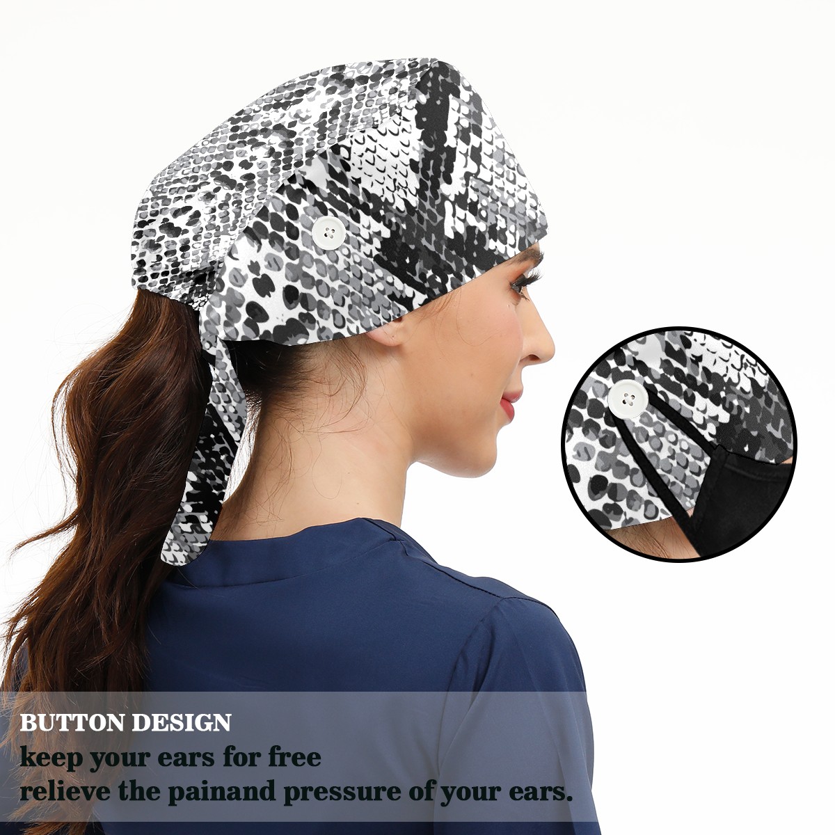 Working Caps with Button & Sweatband Satin Lined Cotton Adjustable Nurse Hats Elastic Band Scrub Cap Surgeon Hat White Snake Skin
