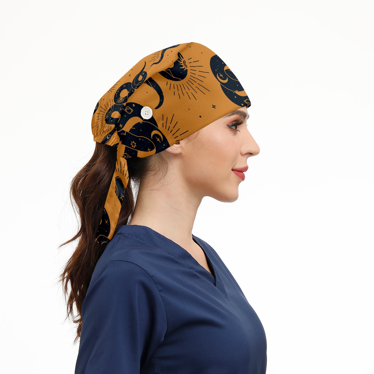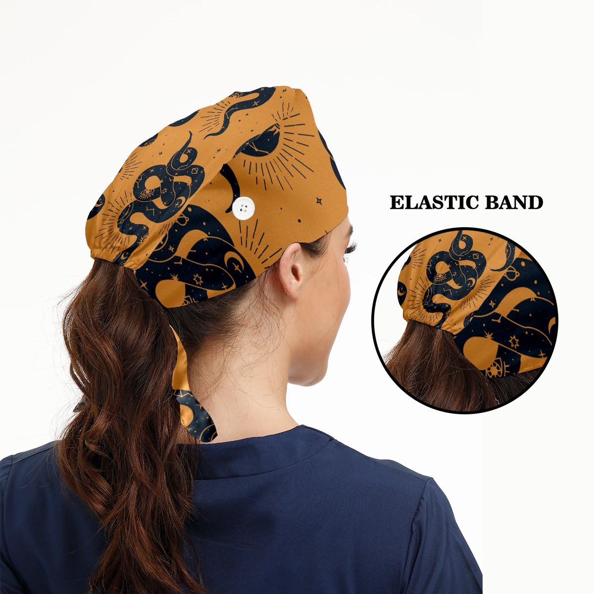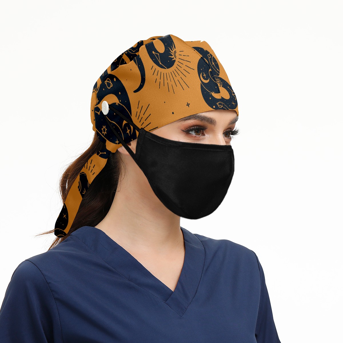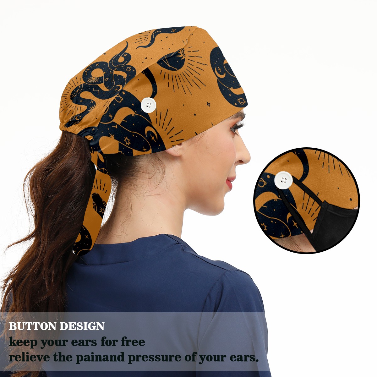 Working Caps with Button & Sweatband Satin Lined Cotton Adjustable Nurse Hats Elastic Band Scrub Cap Surgeon Hat Magic Astrology Snake Sun Moon Eyes