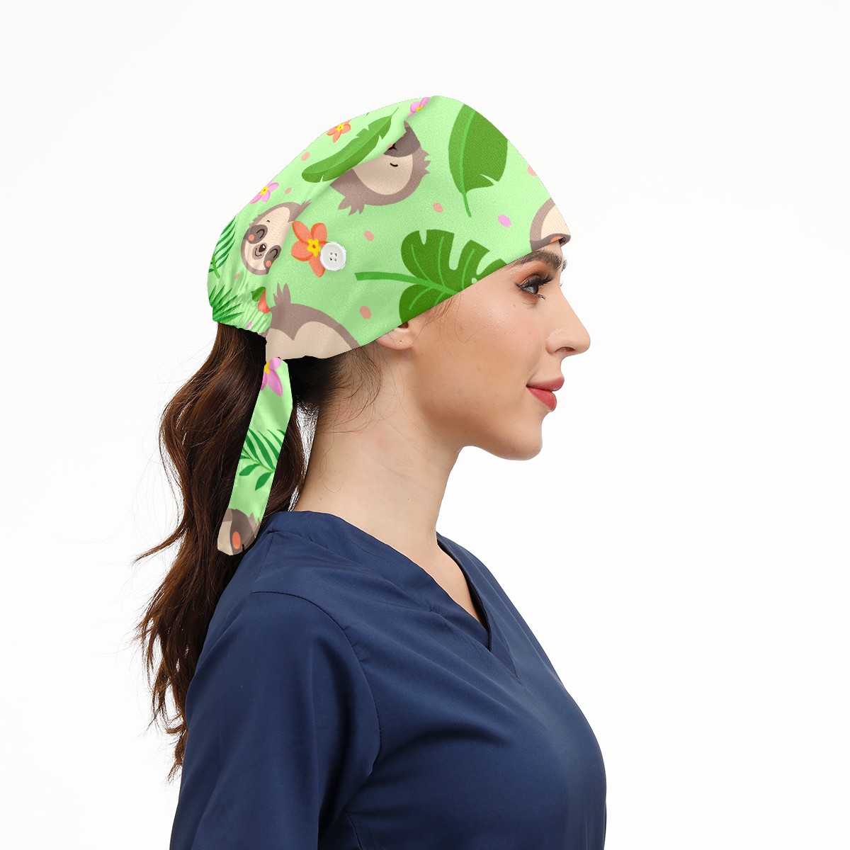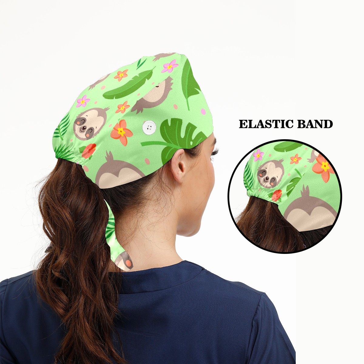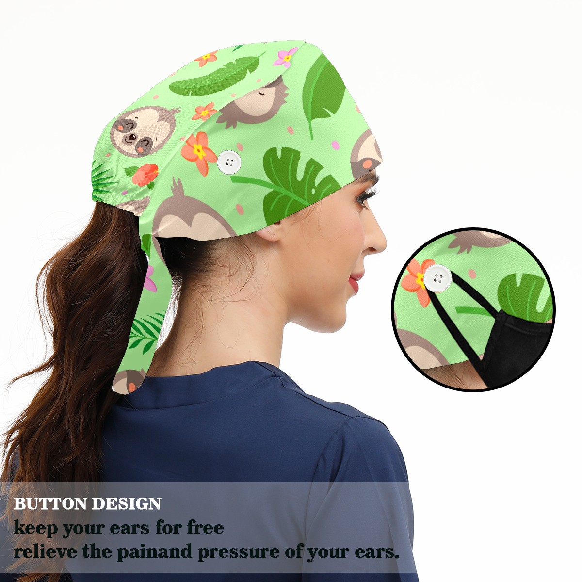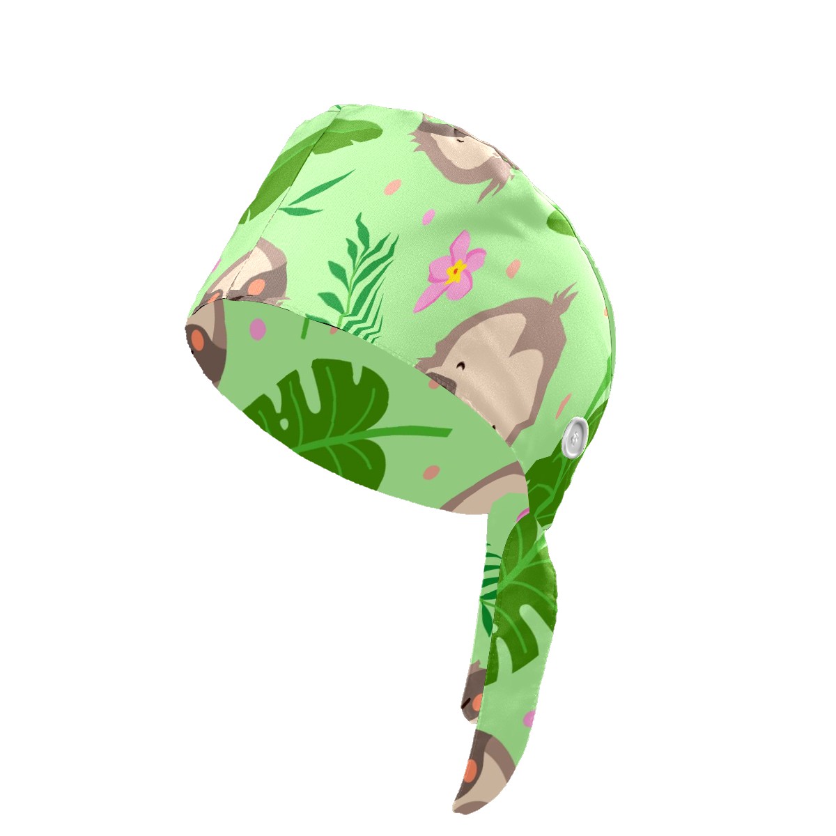 Working Caps with Button & Sweatband Satin Lined Cotton Adjustable Nurse Hats Elastic Band Scrub Cap Surgeon Hat Cute Sloth Tropical Palm Leaves