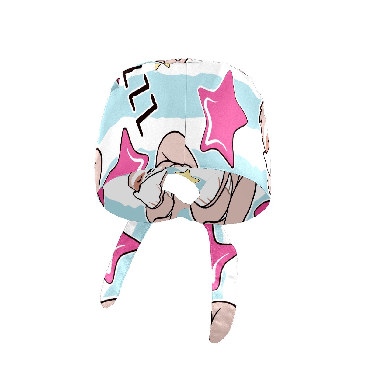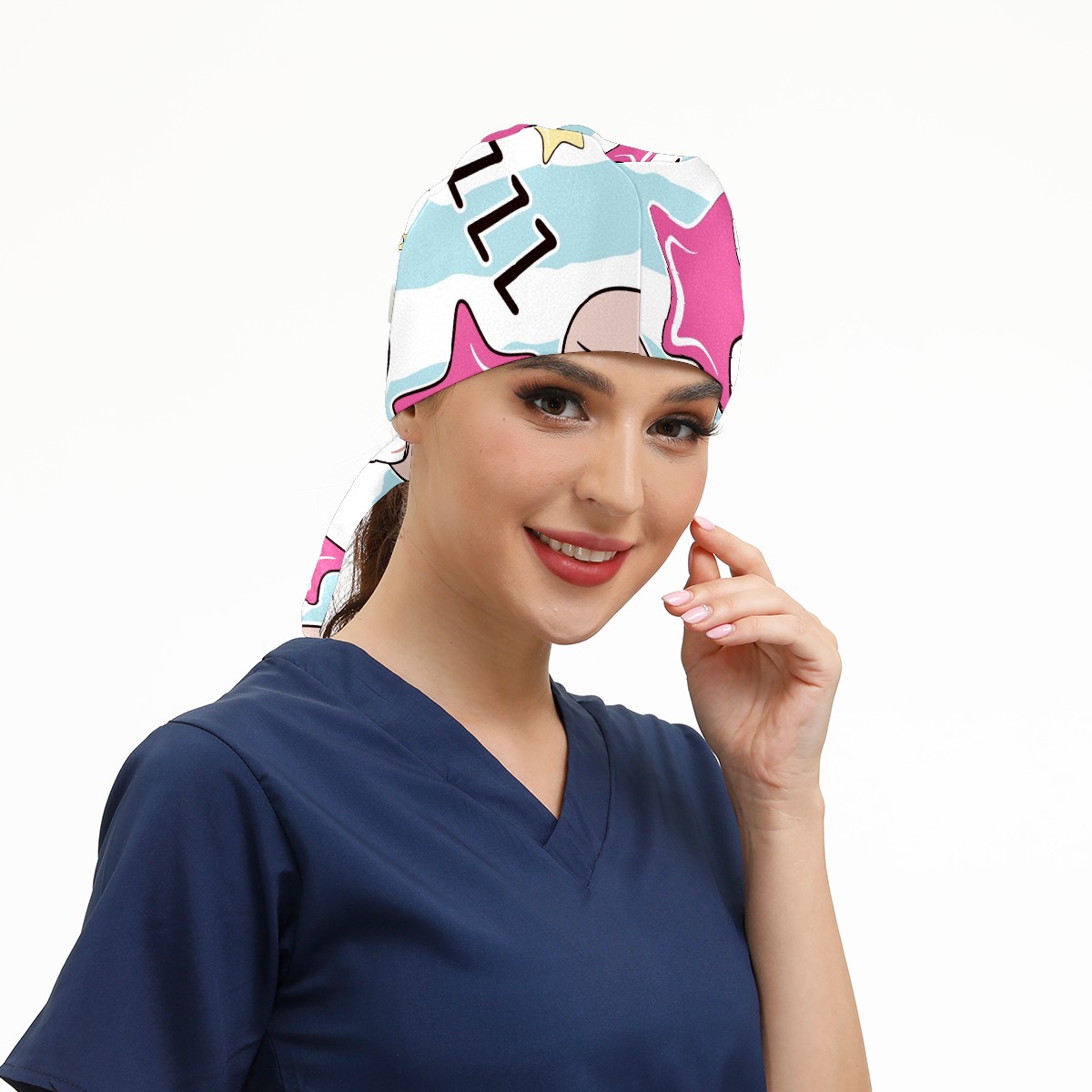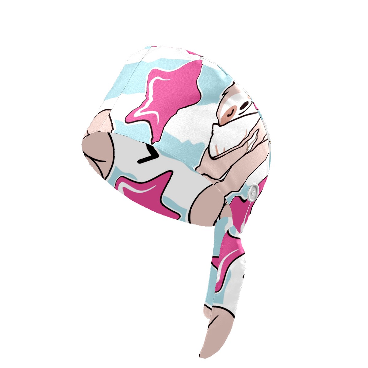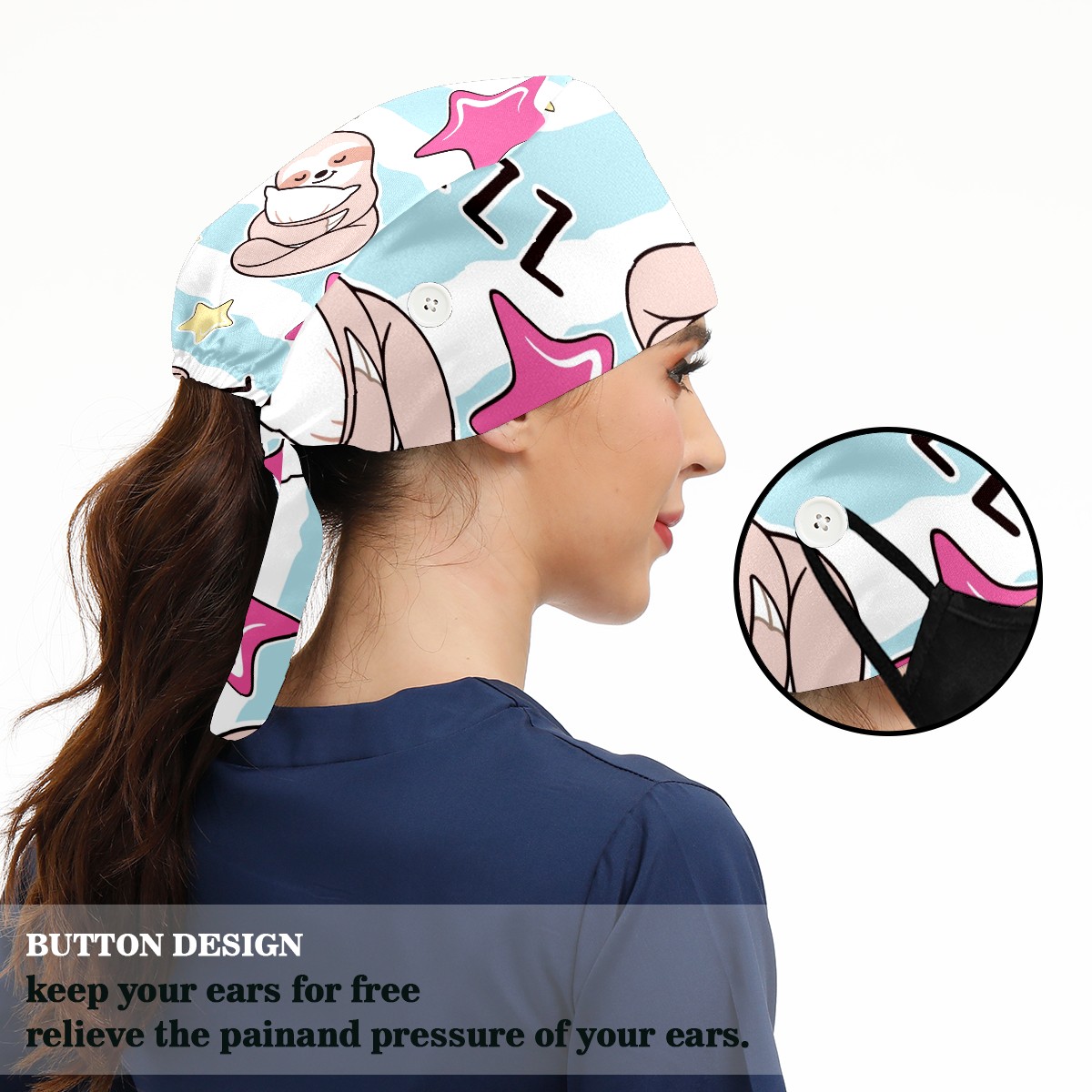 Working Caps with Button & Sweatband Satin Lined Cotton Adjustable Nurse Hats Elastic Band Scrub Cap Surgeon Hat Cute Sloth Star