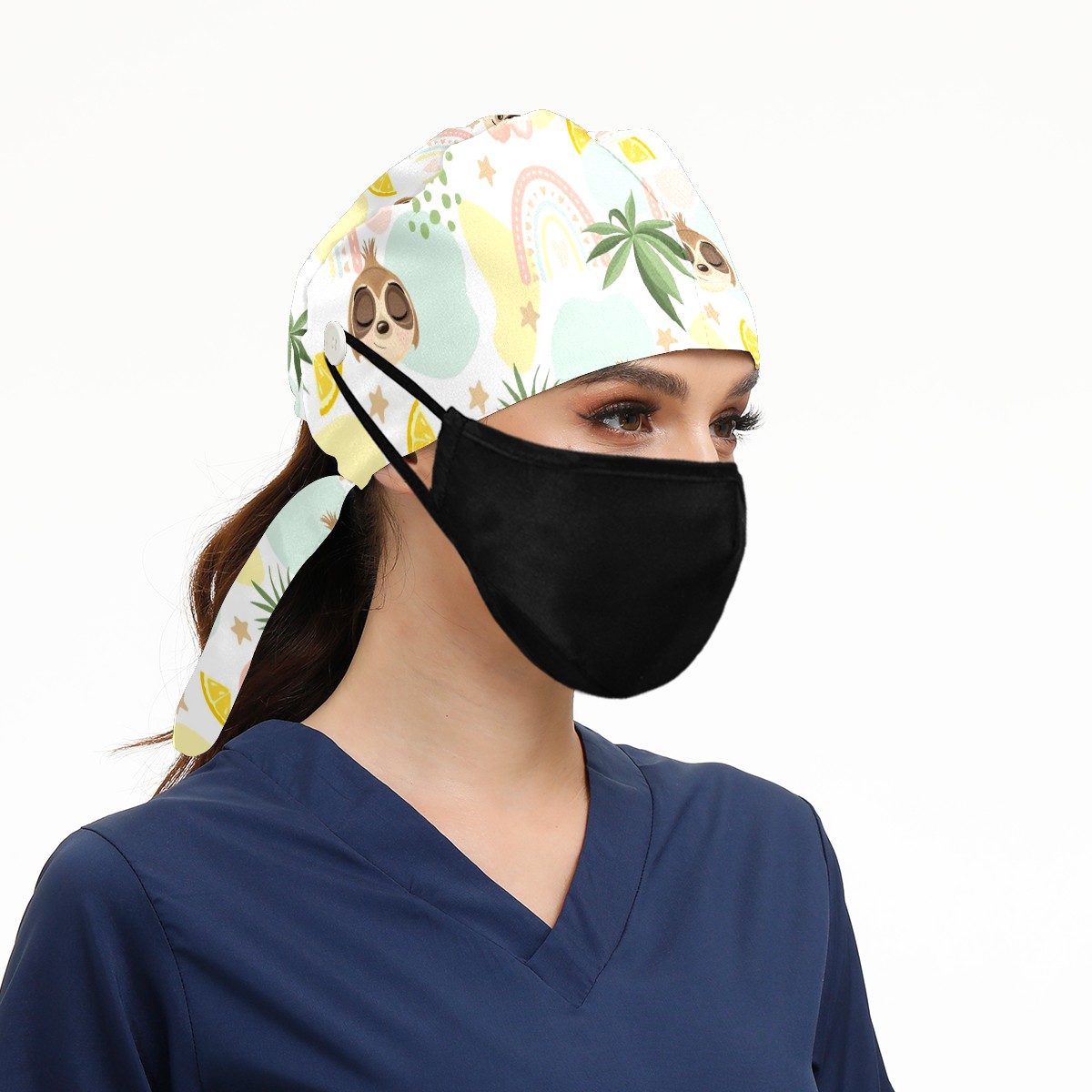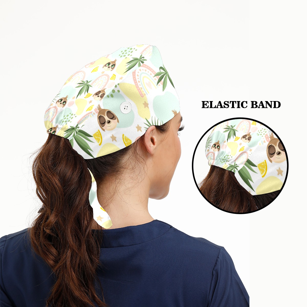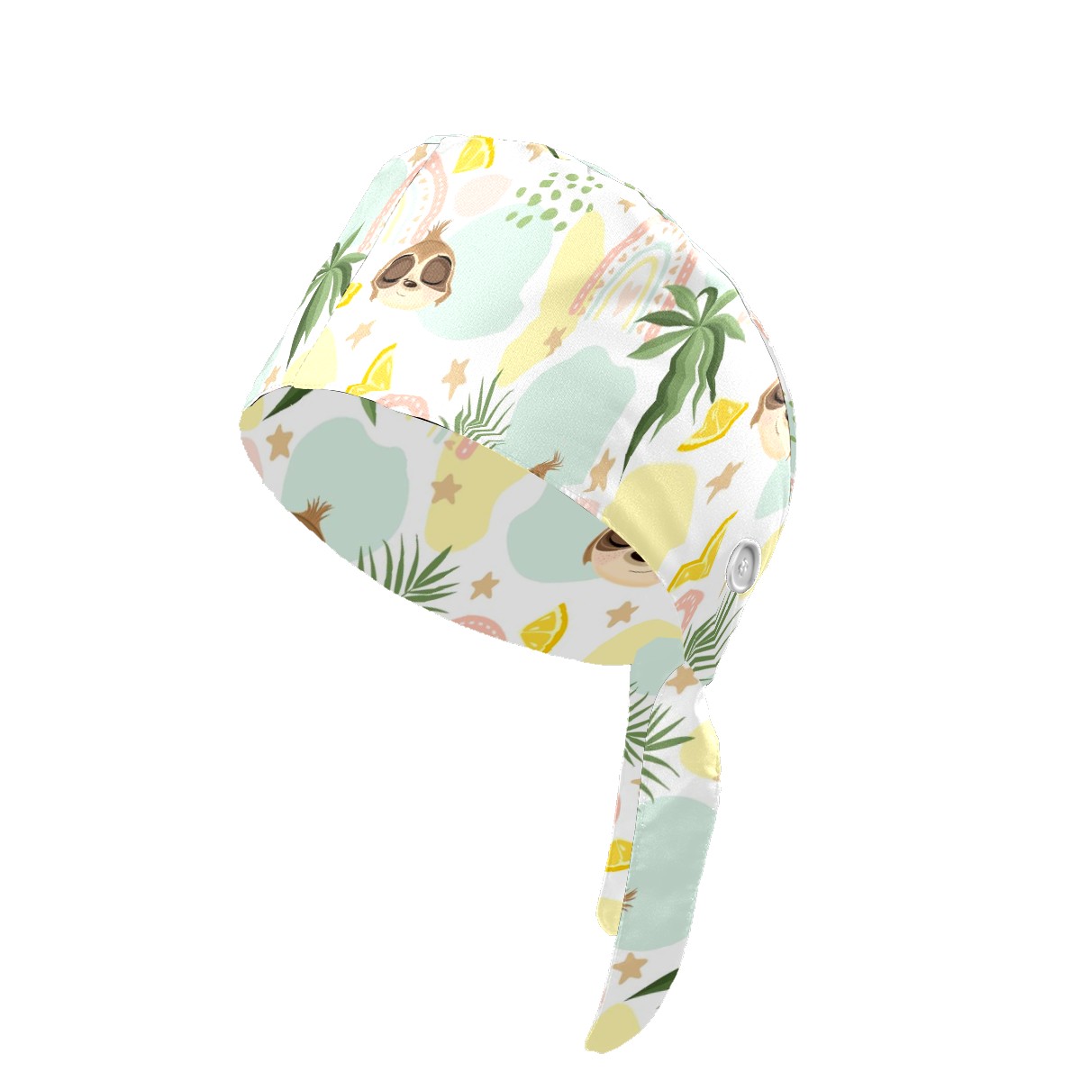 Working Caps with Button & Sweatband Satin Lined Cotton Adjustable Nurse Hats Elastic Band Scrub Cap Surgeon Hat Cute Sloth On Summer Background
