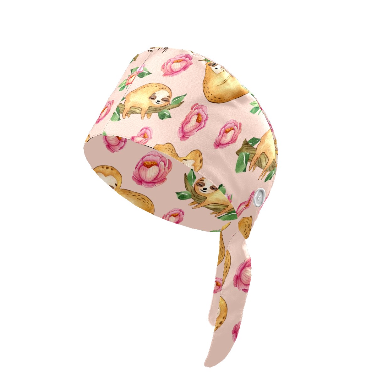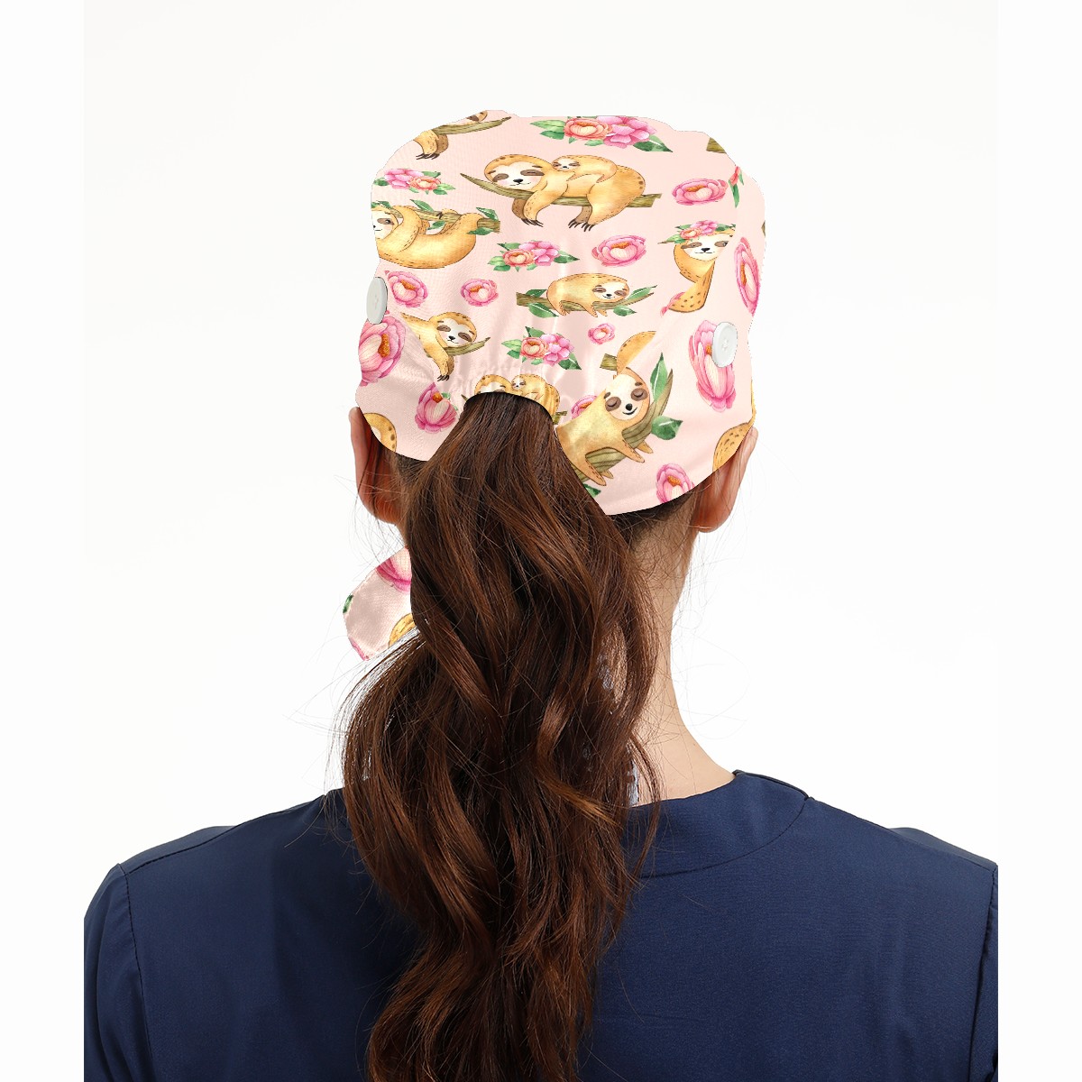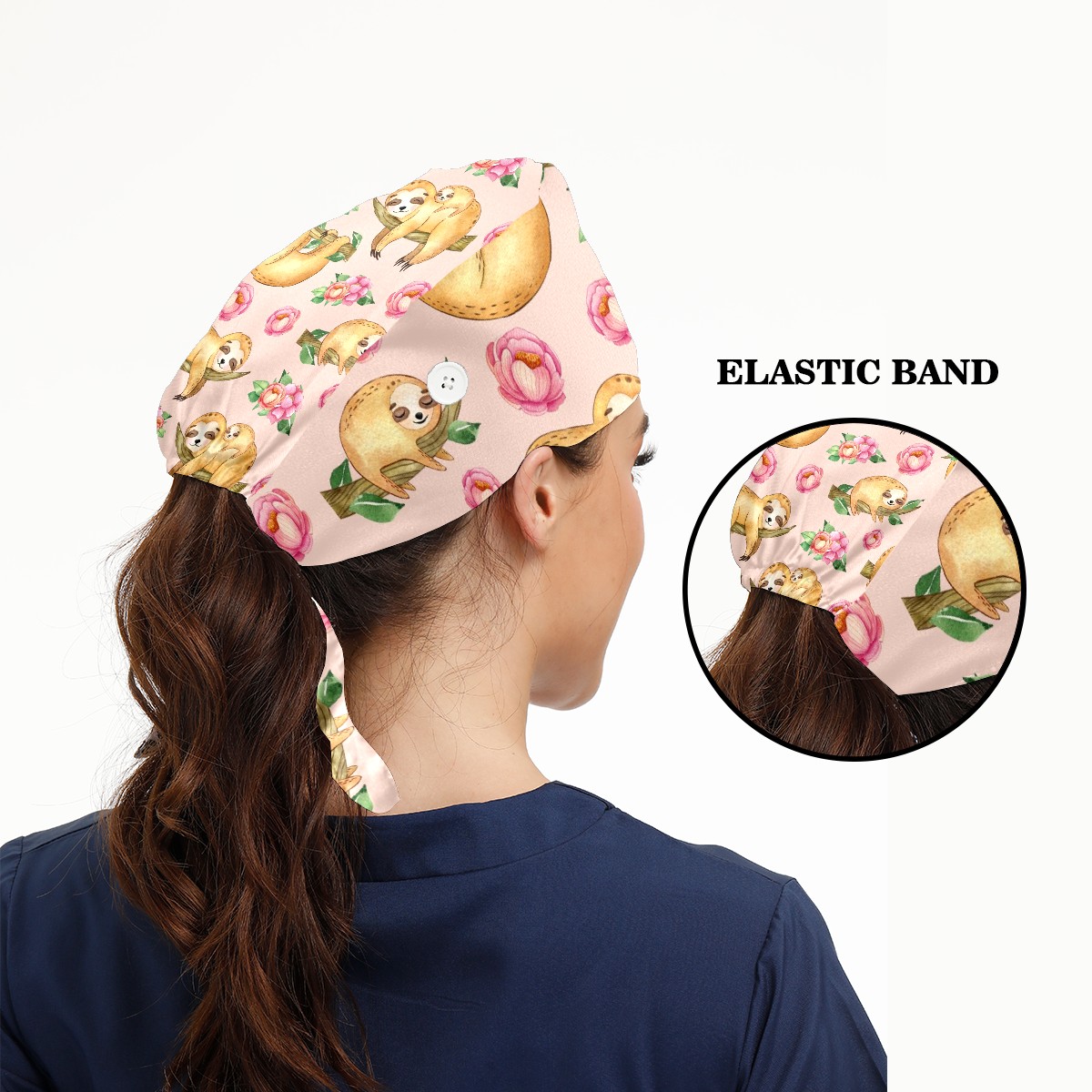 Working Caps with Button & Sweatband Satin Lined Cotton Adjustable Nurse Hats Elastic Band Scrub Cap Surgeon Hat Cute Sloth Flower