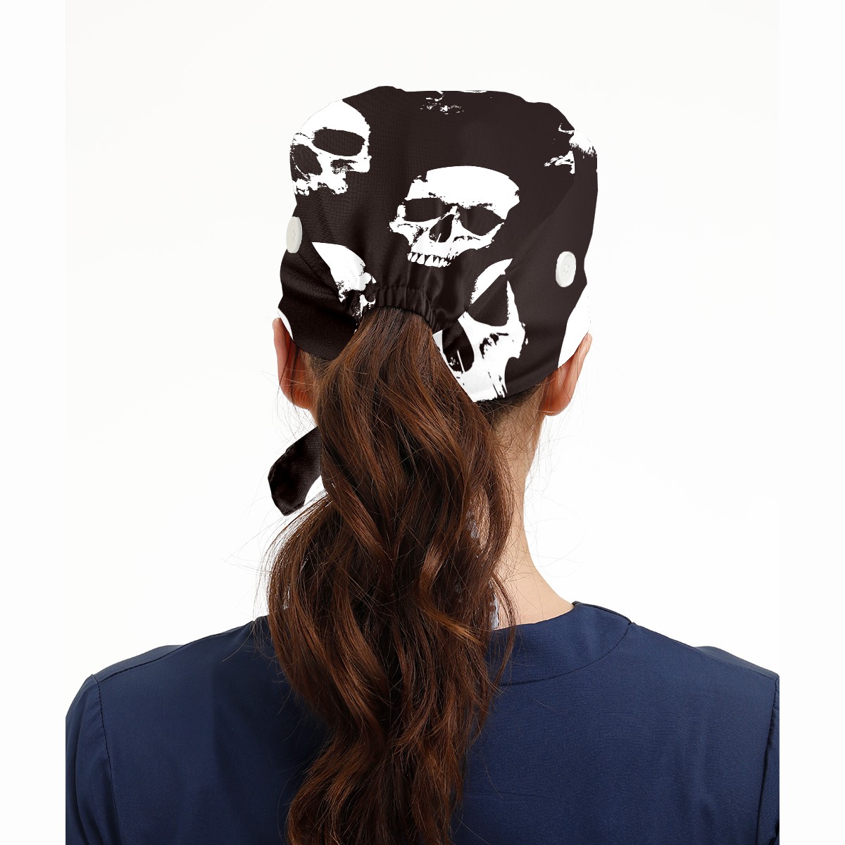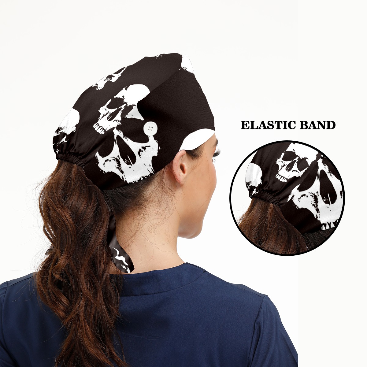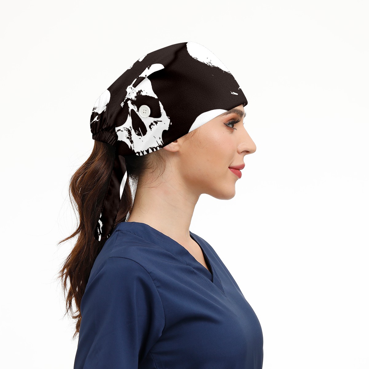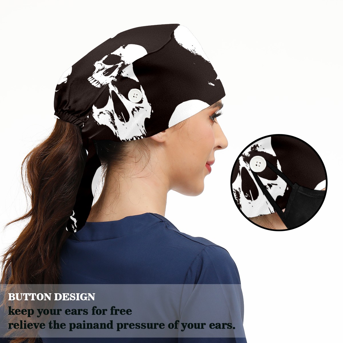 Working Caps with Button & Sweatband Satin Lined Cotton Adjustable Nurse Hats Elastic Band Scrub Cap Surgeon Hat Smiling Skulls In Retro Style