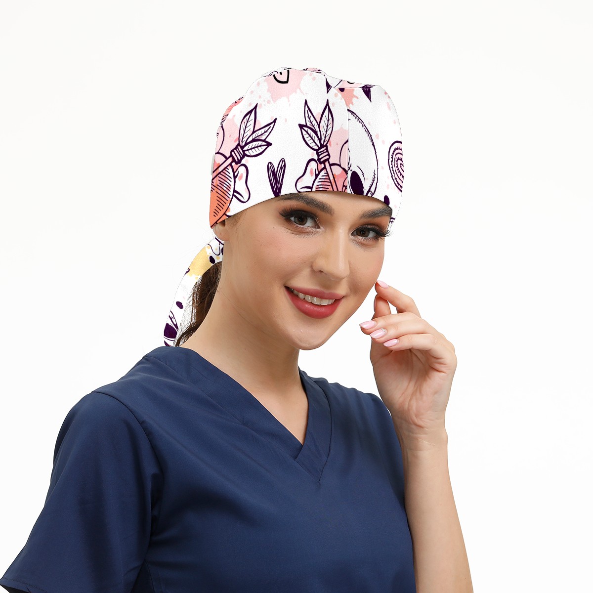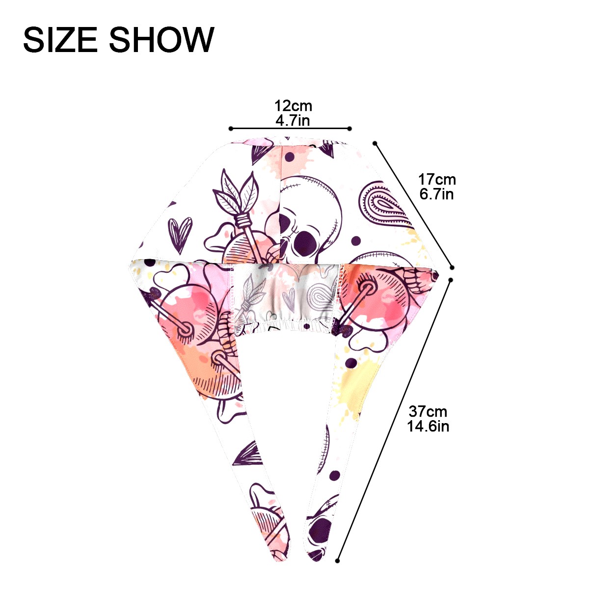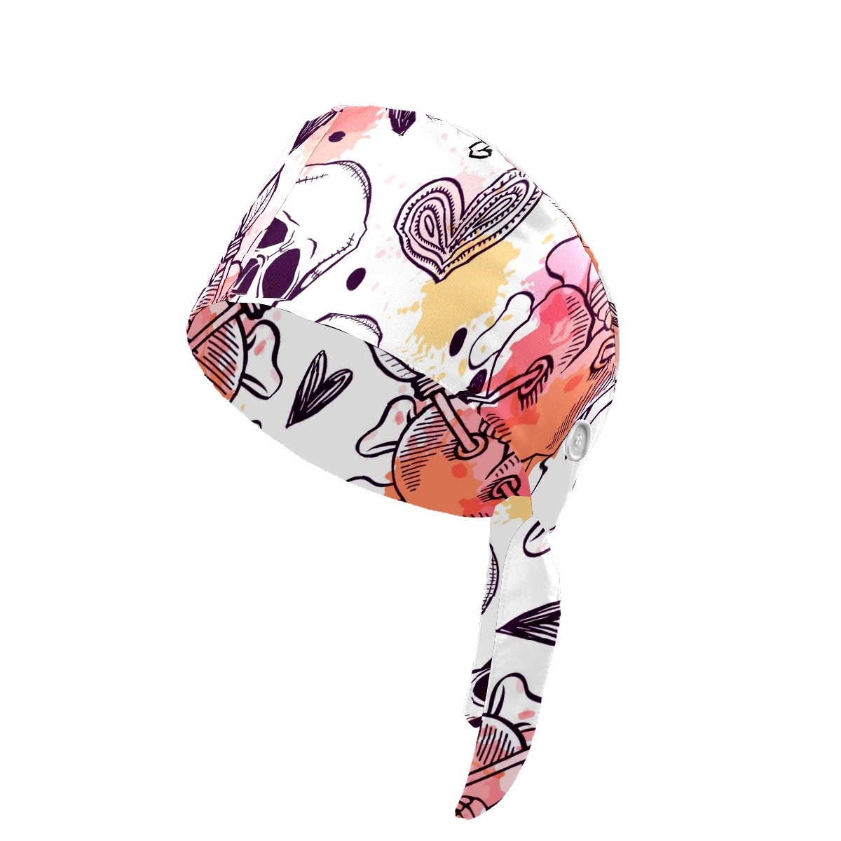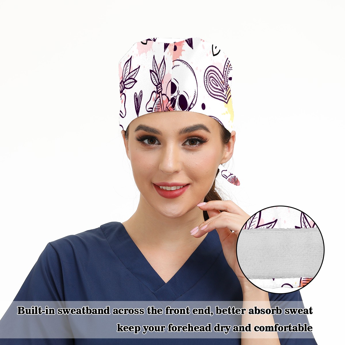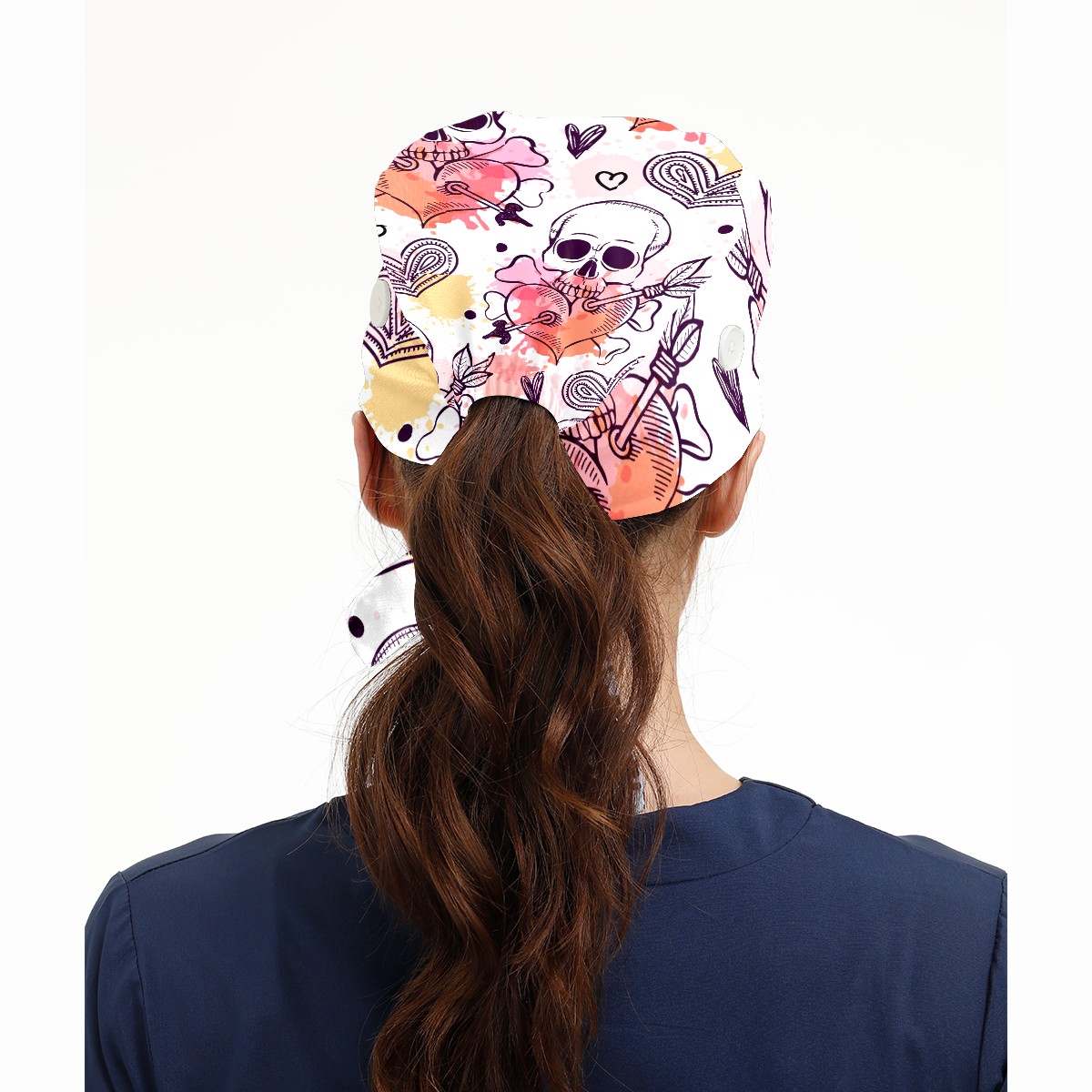 Working Caps with Button & Sweatband Satin Lined Cotton Adjustable Nurse Hats Elastic Band Scrub Cap Surgeon Hat Skull And Heart