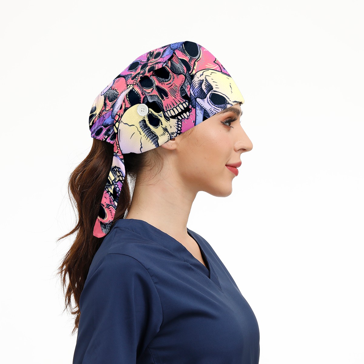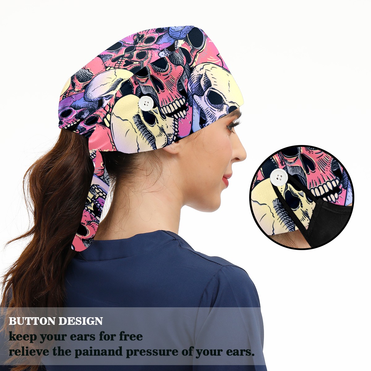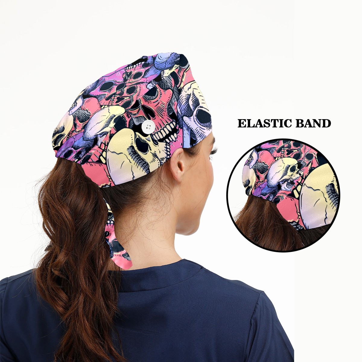 Working Caps with Button & Sweatband Satin Lined Cotton Adjustable Nurse Hats Elastic Band Scrub Cap Surgeon Hat Pink Purple Human Skull