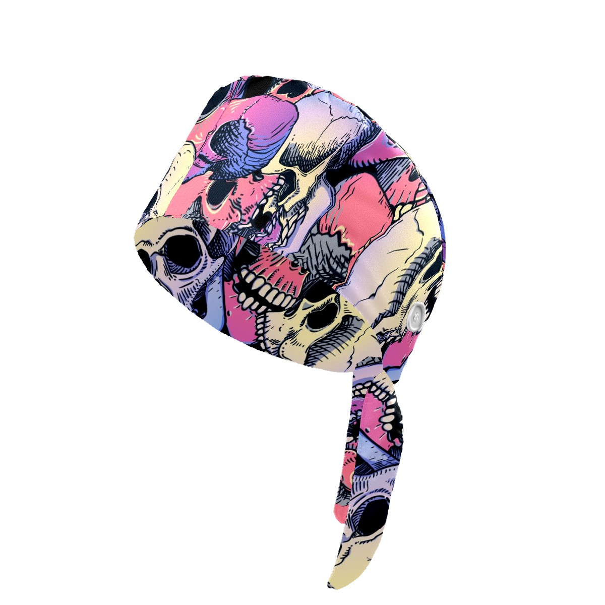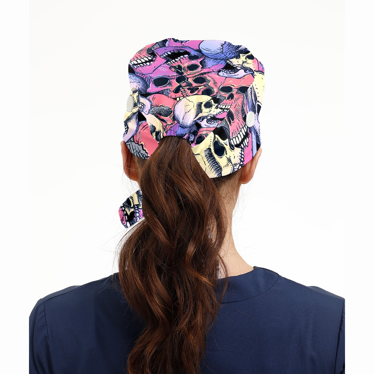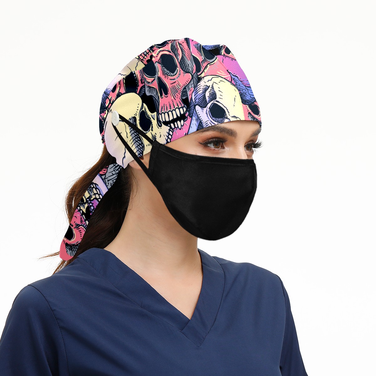 Working Caps with Button & Sweatband Satin Lined Cotton Adjustable Nurse Hats Elastic Band Scrub Cap Surgeon Hat Pink Purple Human Skull
