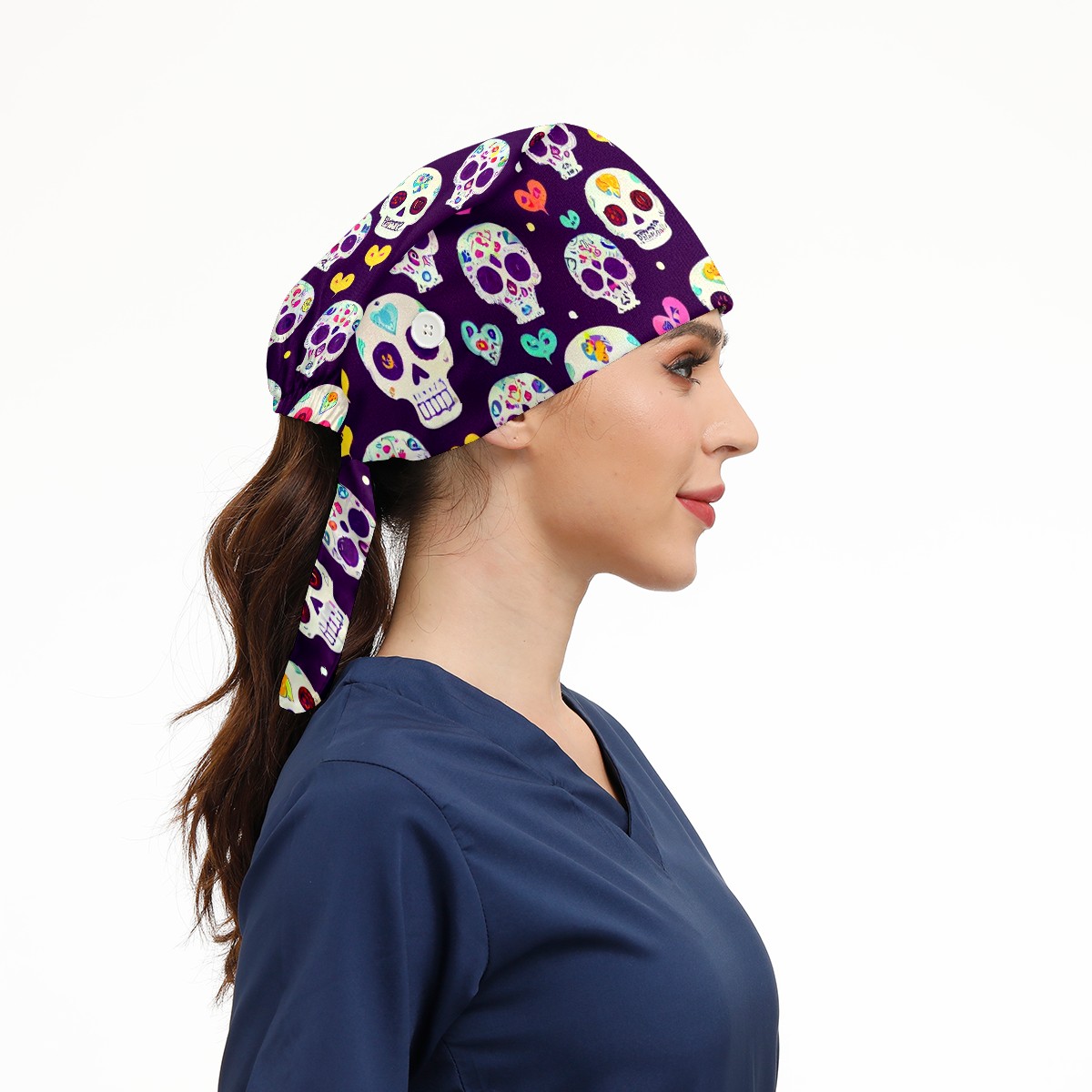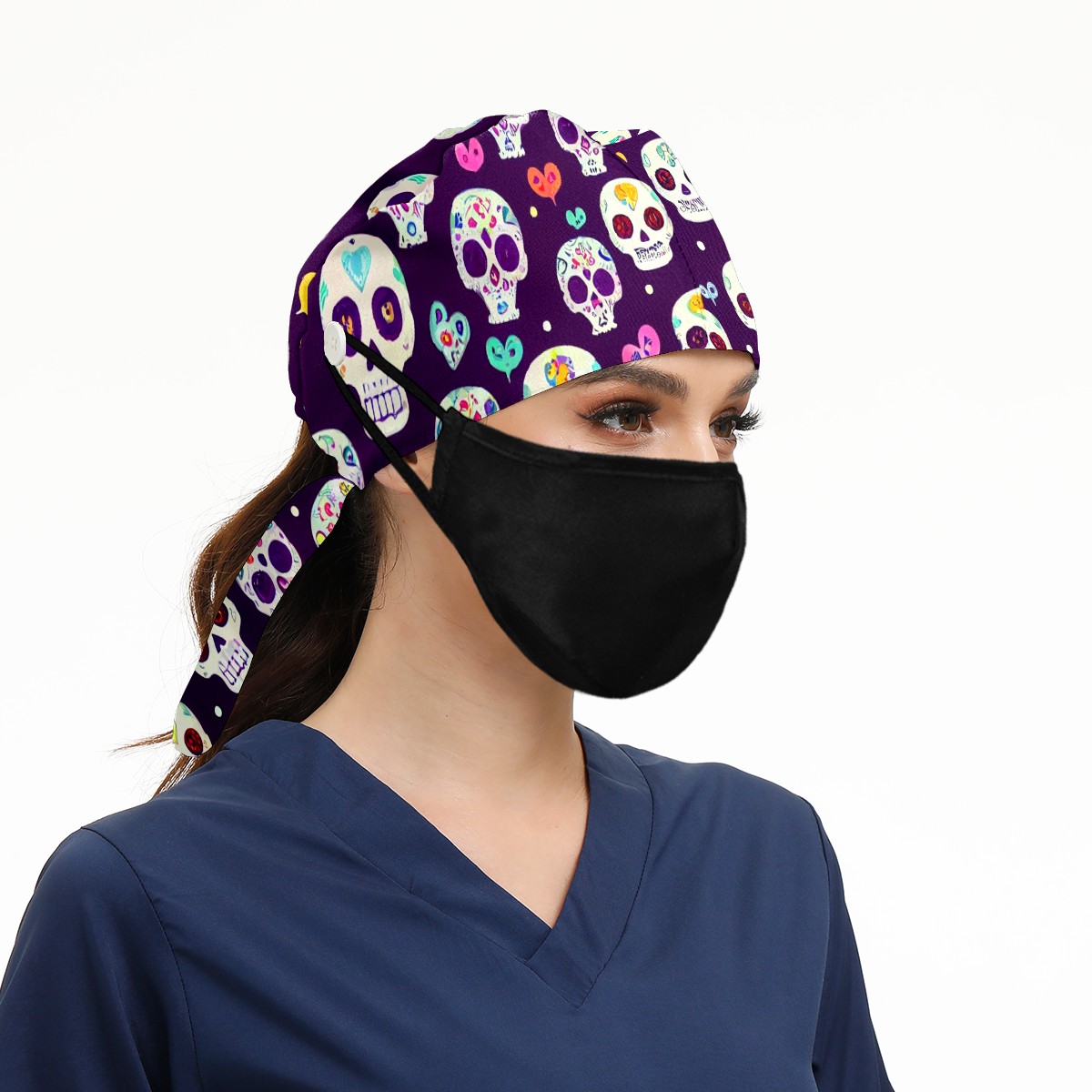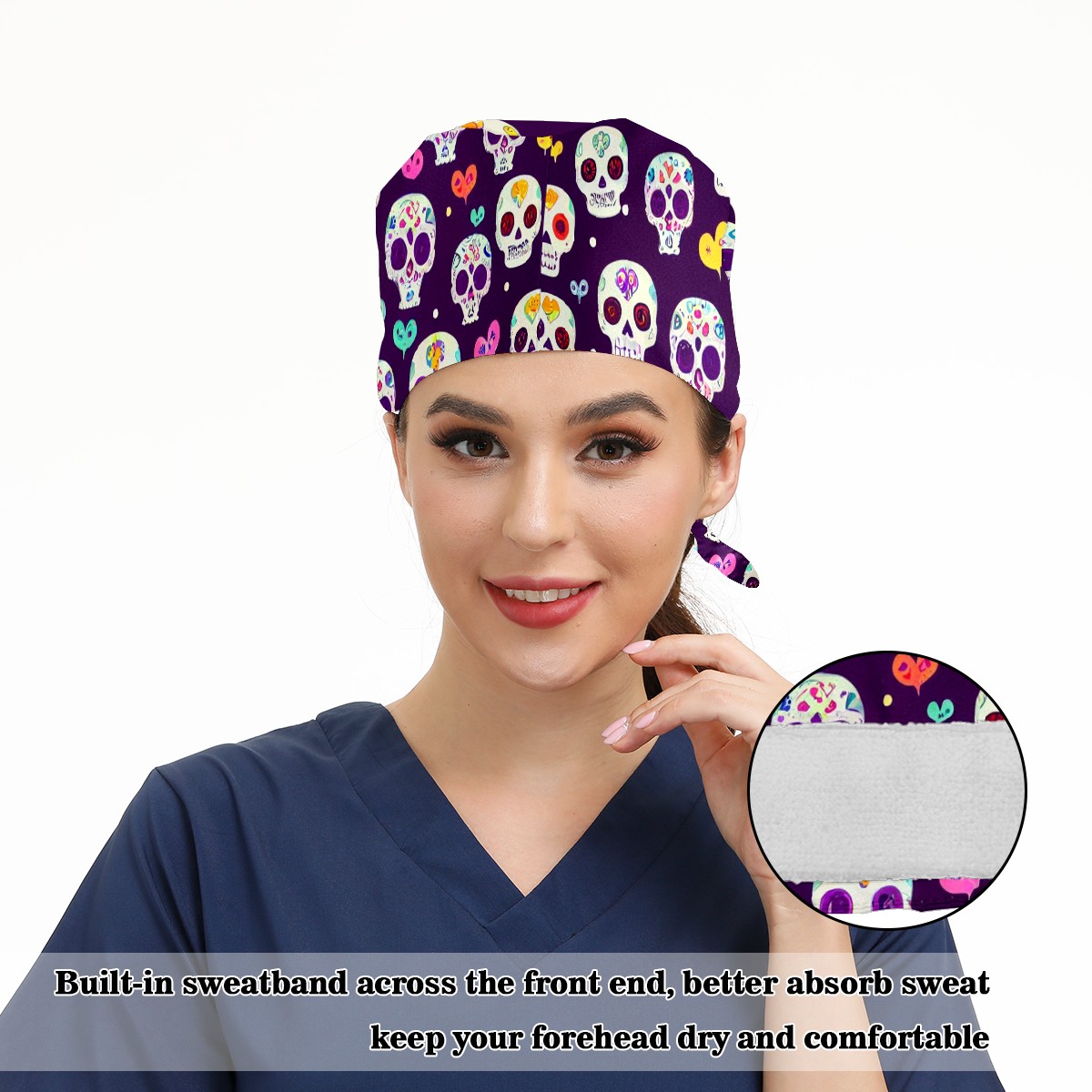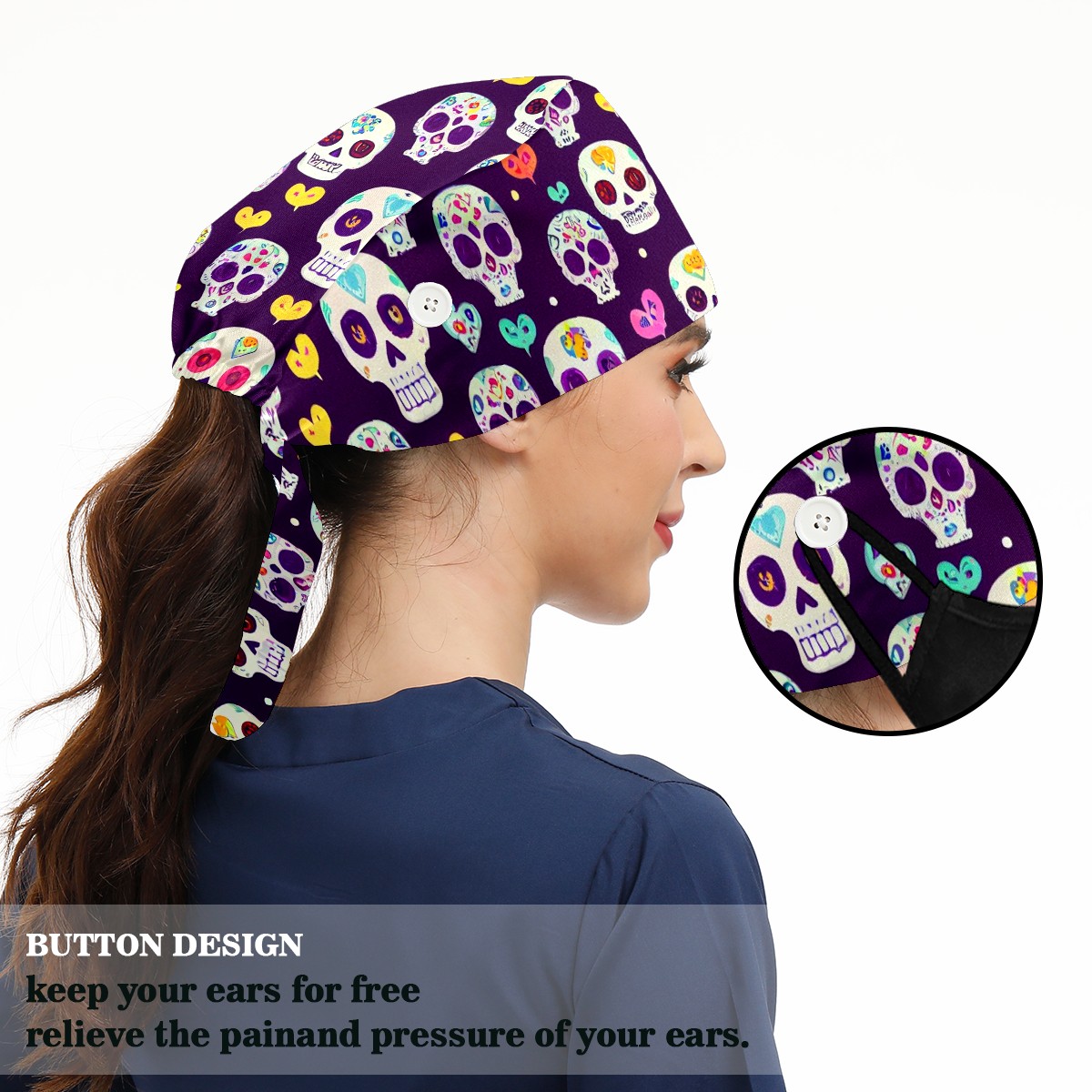 Working Caps with Button & Sweatband Satin Lined Cotton Adjustable Nurse Hats Elastic Band Scrub Cap Surgeon Hat Skull And Flowers Graffiti