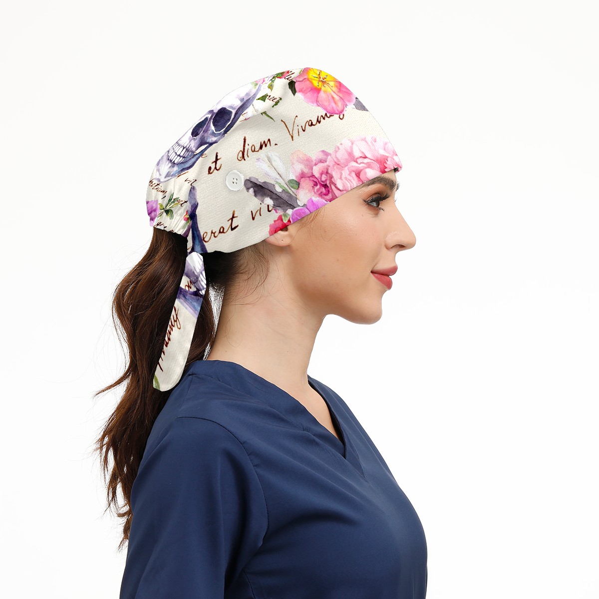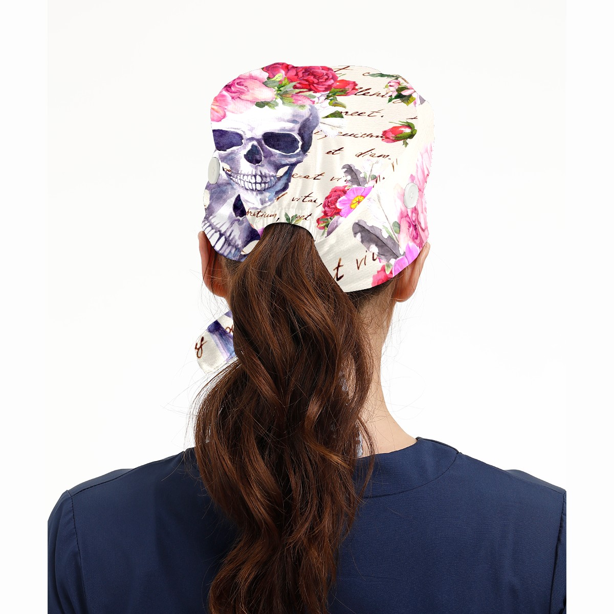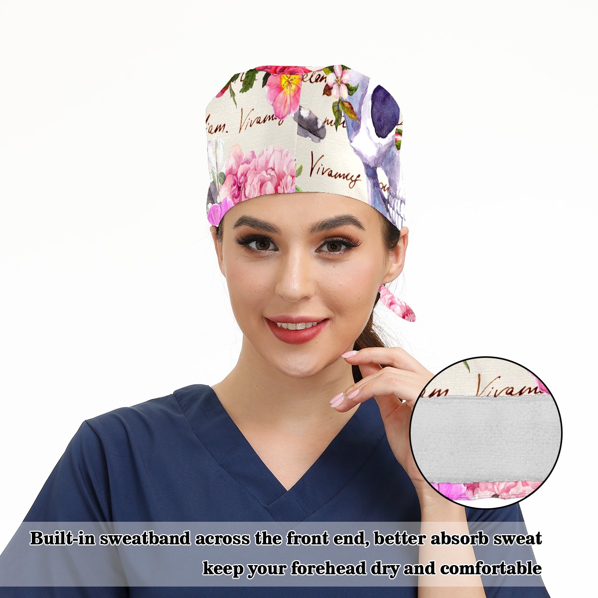 Working Caps with Button & Sweatband Satin Lined Cotton Adjustable Nurse Hats Elastic Band Scrub Cap Surgeon Hat Human Skulls With Flowers