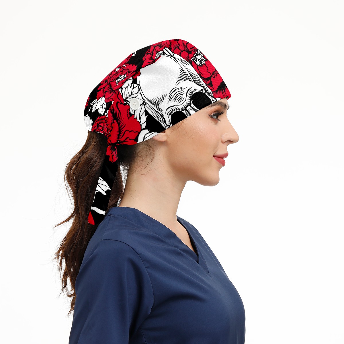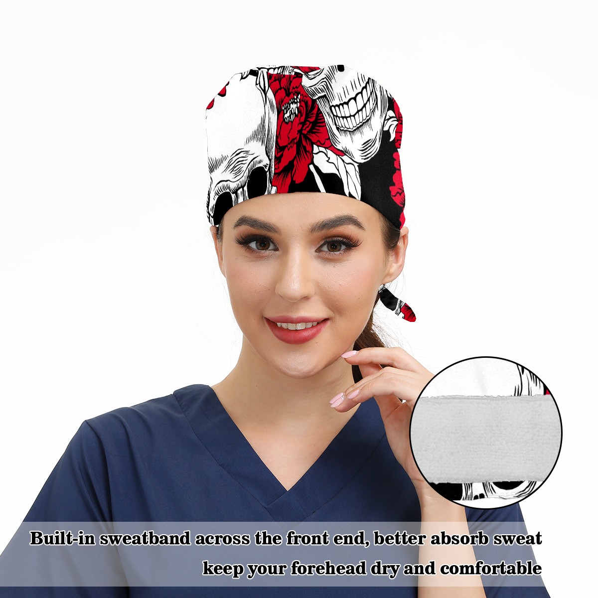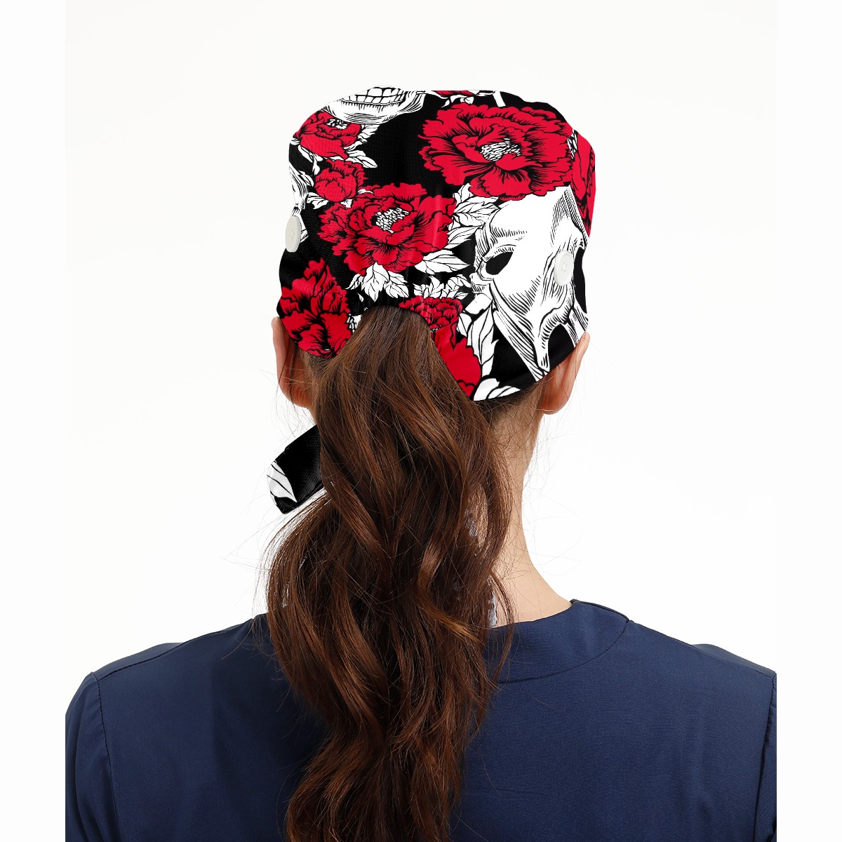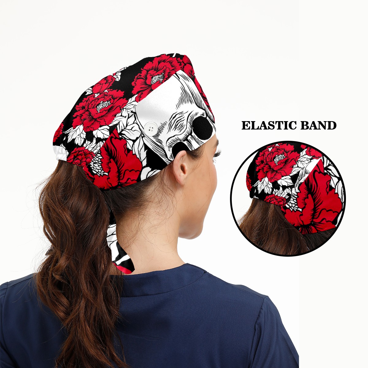 Working Caps with Button & Sweatband Satin Lined Cotton Adjustable Nurse Hats Elastic Band Scrub Cap Surgeon Hat Skull And Flower Peony