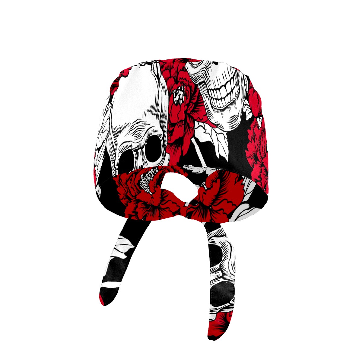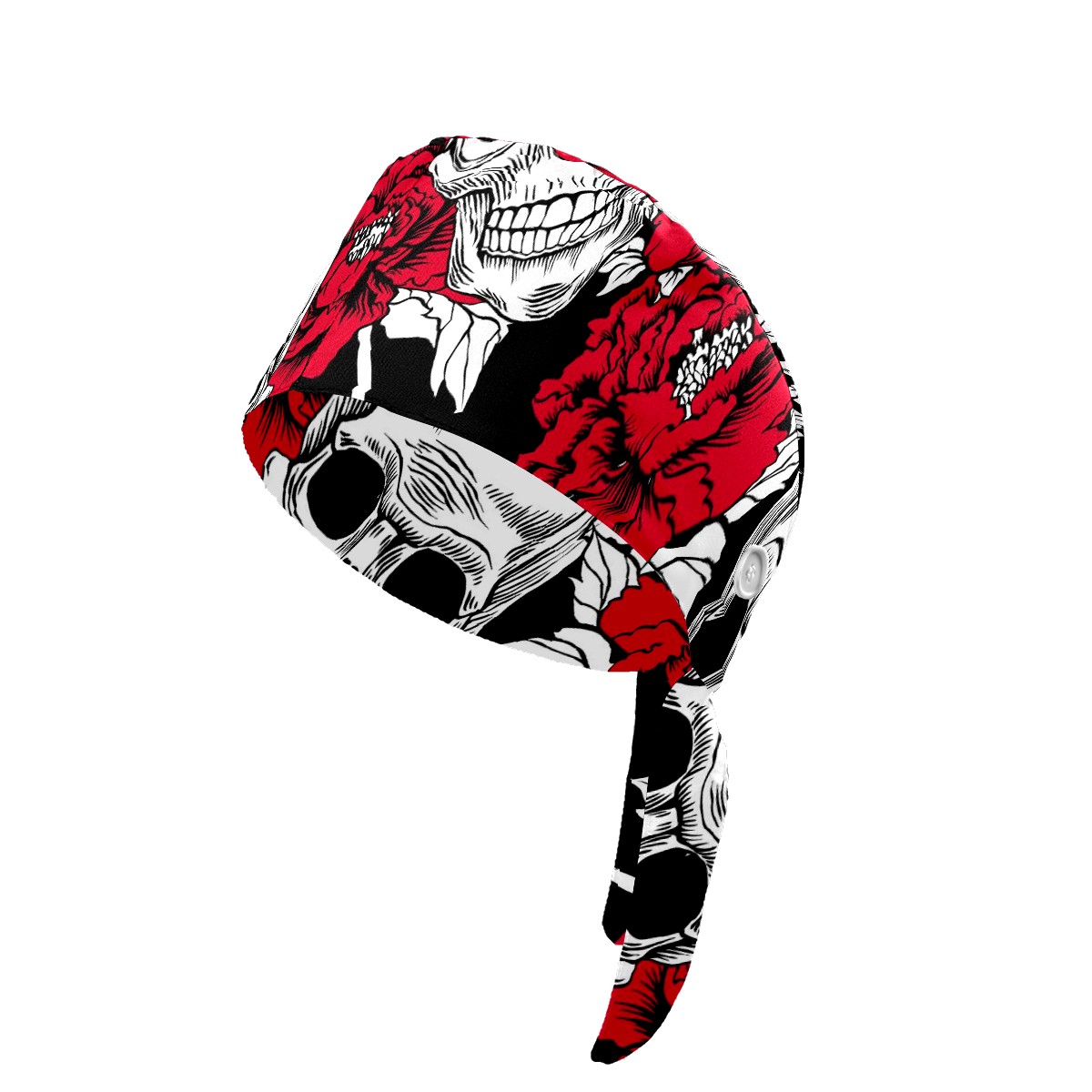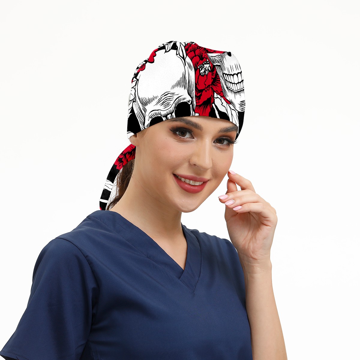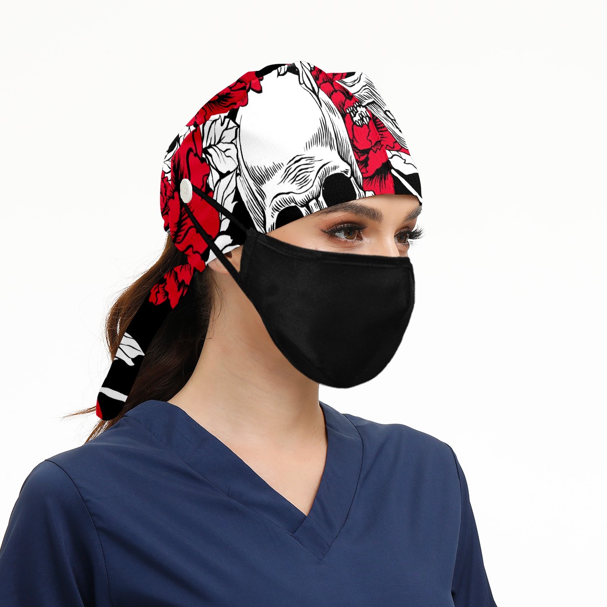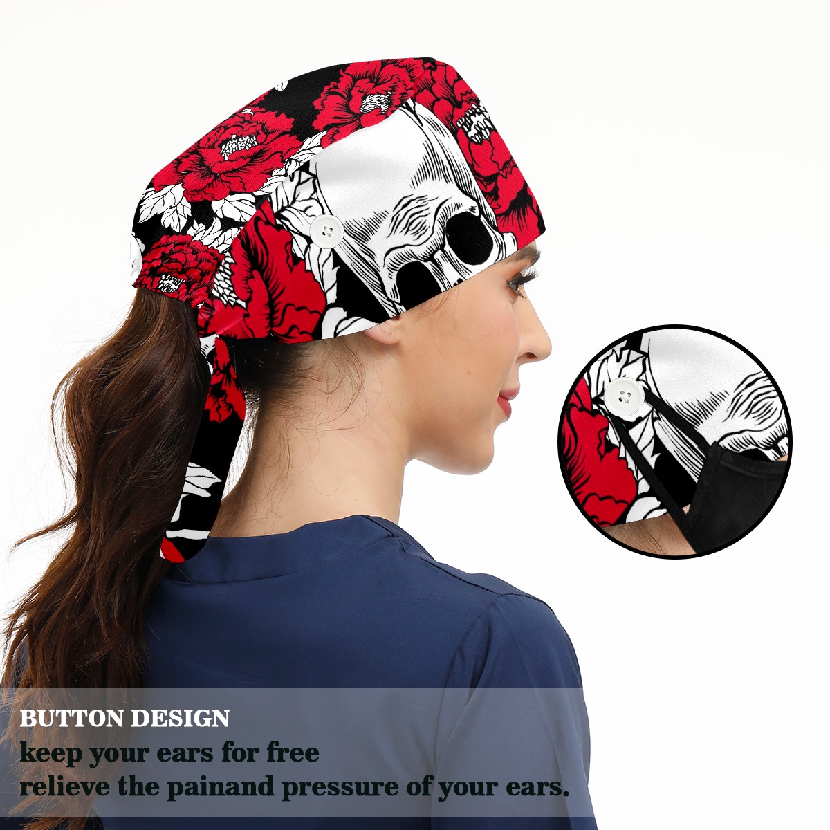 Working Caps with Button & Sweatband Satin Lined Cotton Adjustable Nurse Hats Elastic Band Scrub Cap Surgeon Hat Skull And Flower Peony