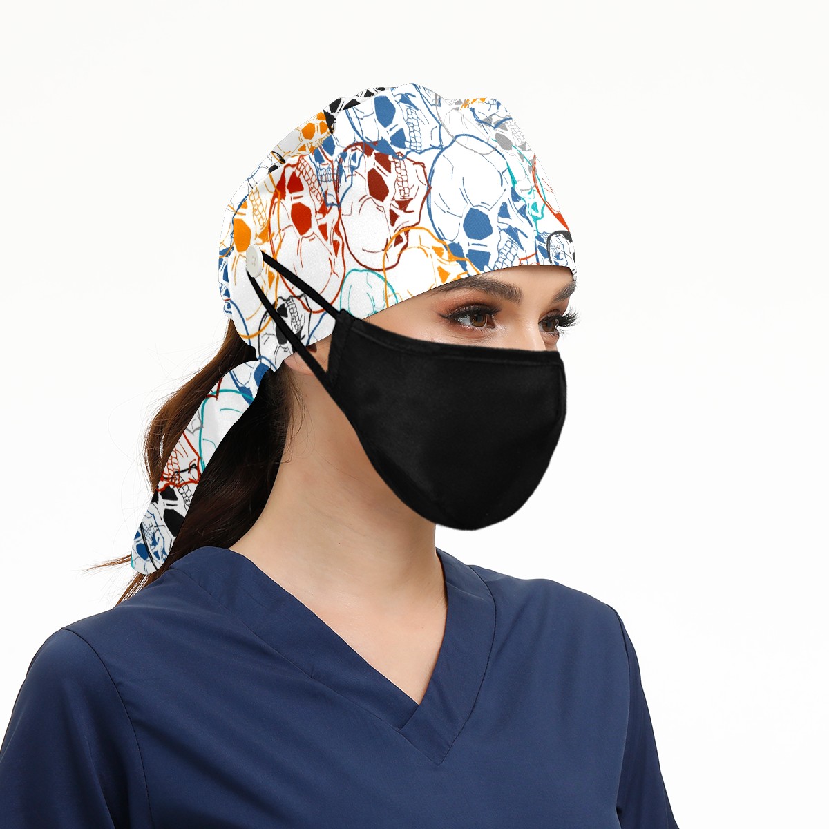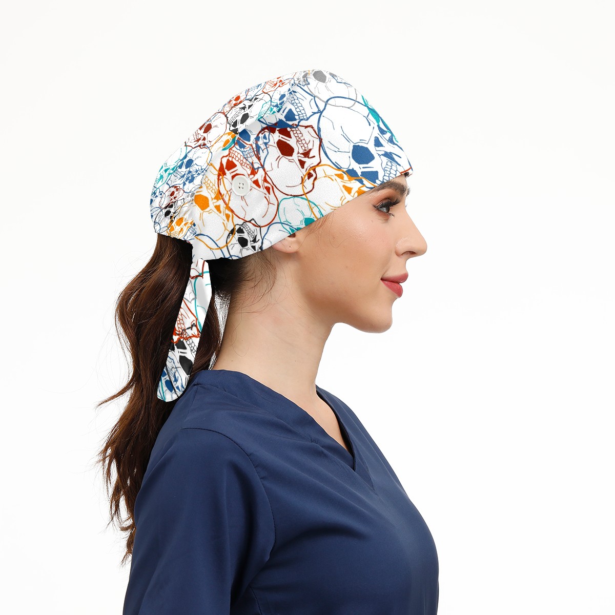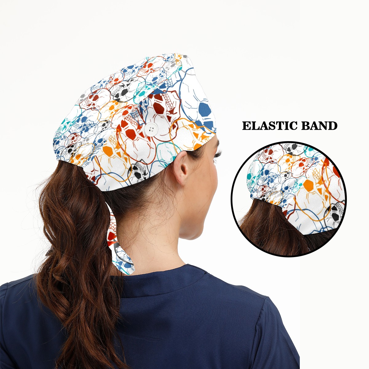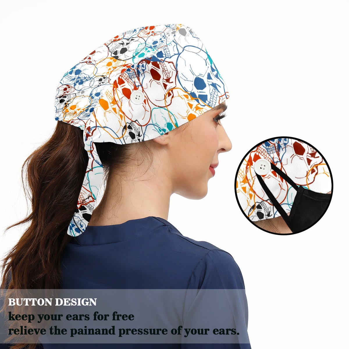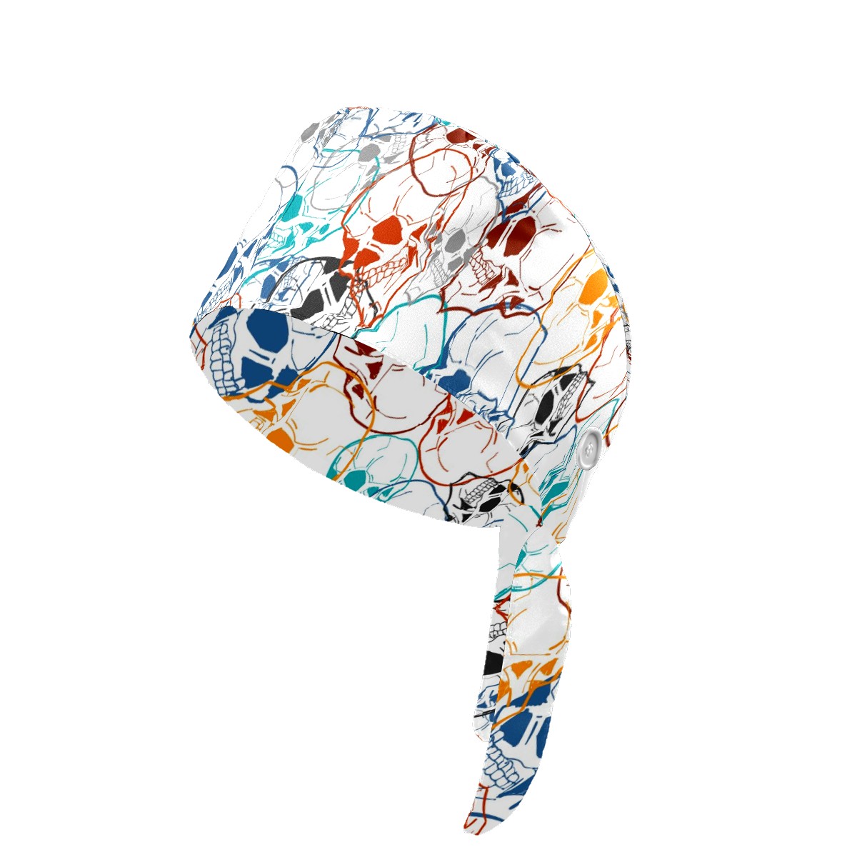 Working Caps with Button & Sweatband Satin Lined Cotton Adjustable Nurse Hats Elastic Band Scrub Cap Surgeon Hat Colorful Skull Background