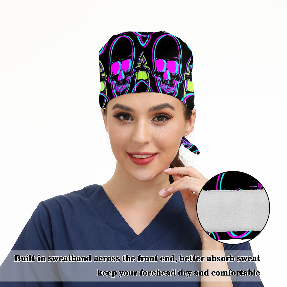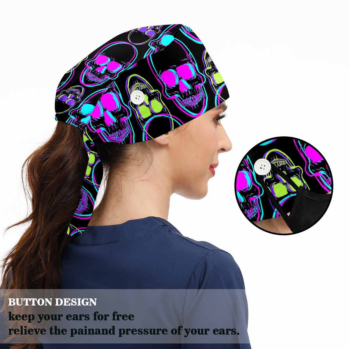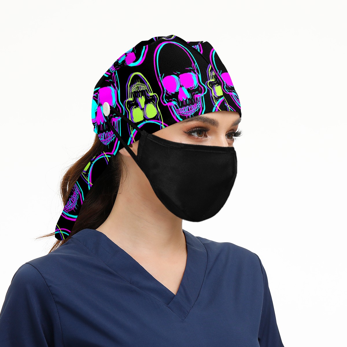 Working Caps with Button & Sweatband Satin Lined Cotton Adjustable Nurse Hats Elastic Band Scrub Cap Surgeon Hat Abstract Human Skull On Black Background