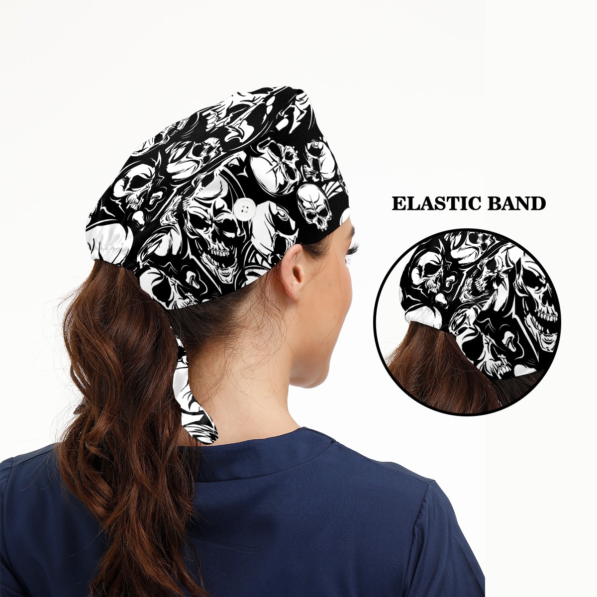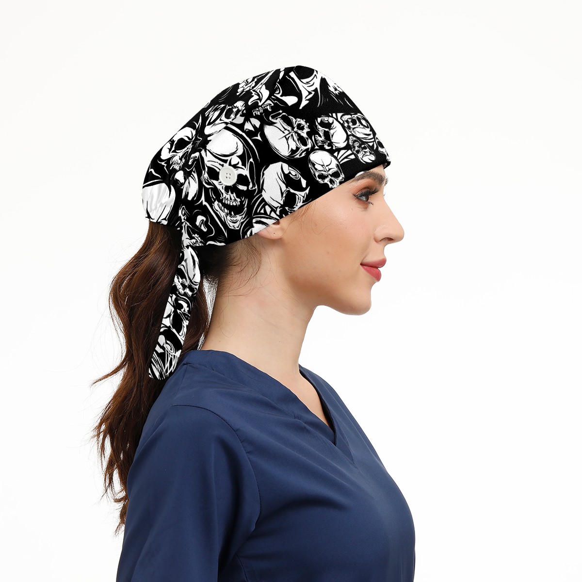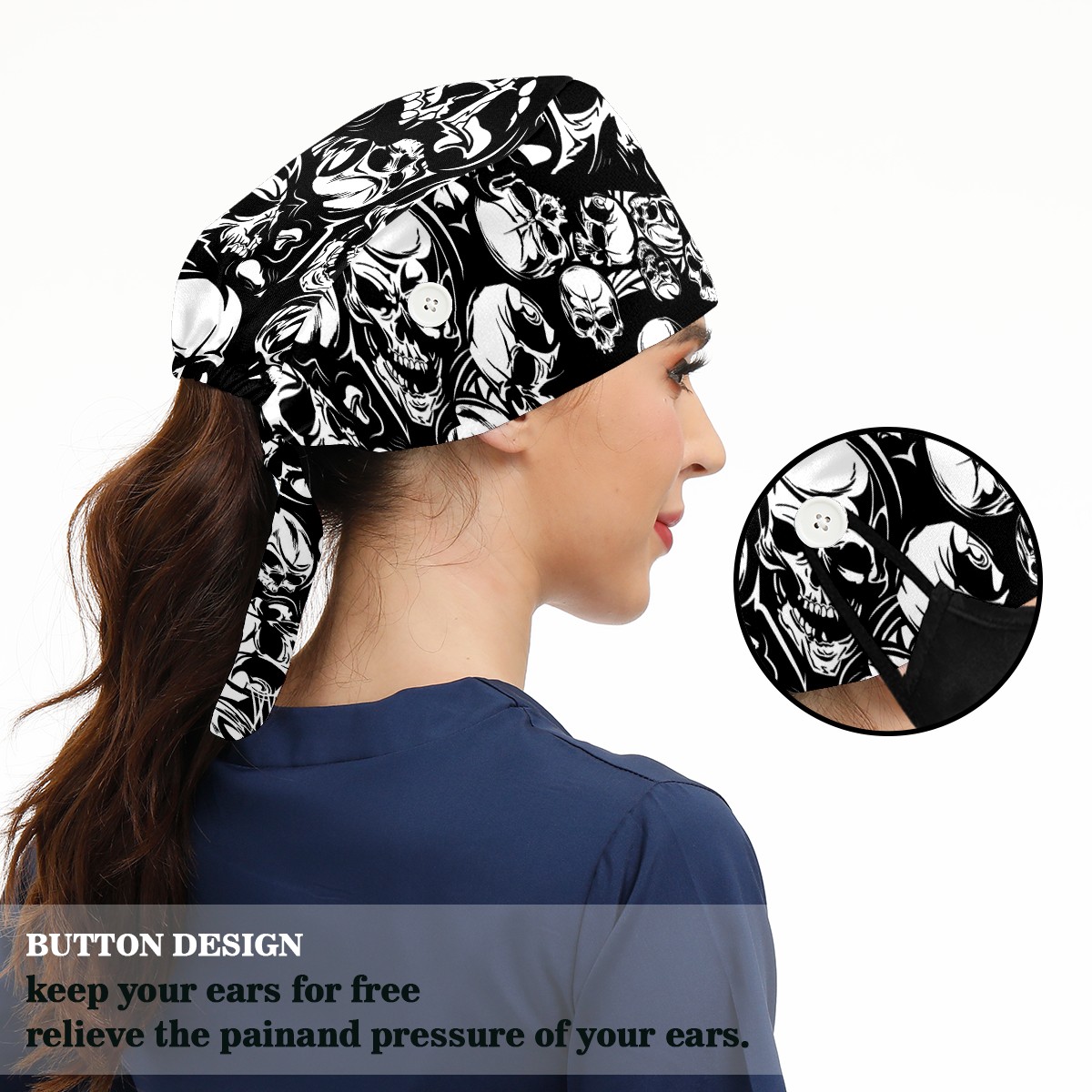 Working Caps with Button & Sweatband Satin Lined Cotton Adjustable Nurse Hats Elastic Band Scrub Cap Surgeon Hat Black And White Skull