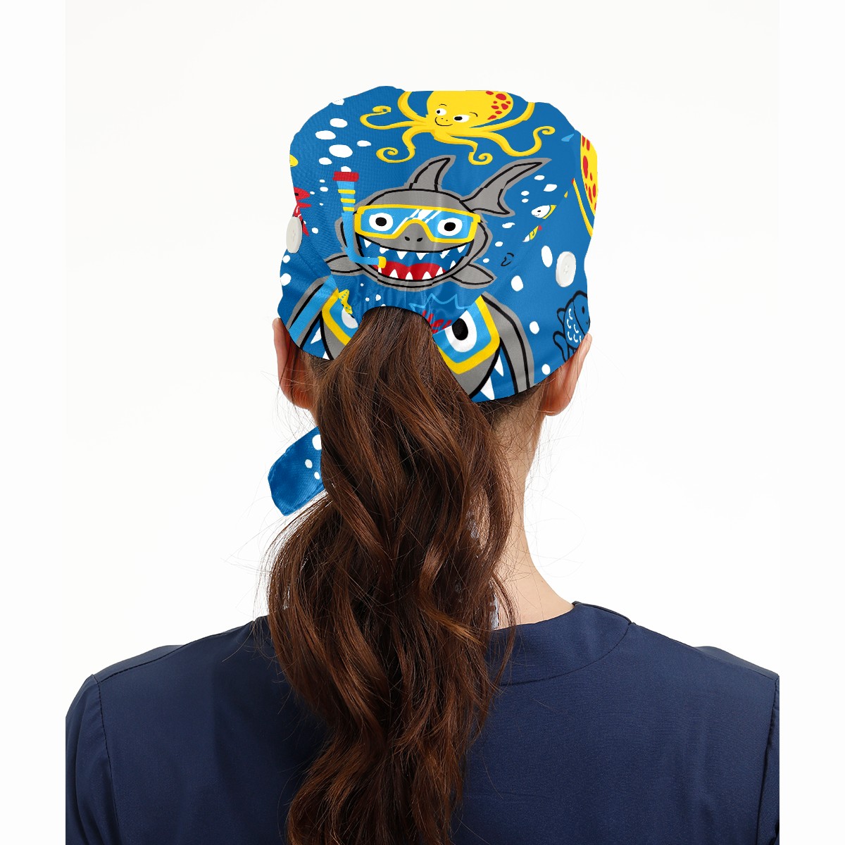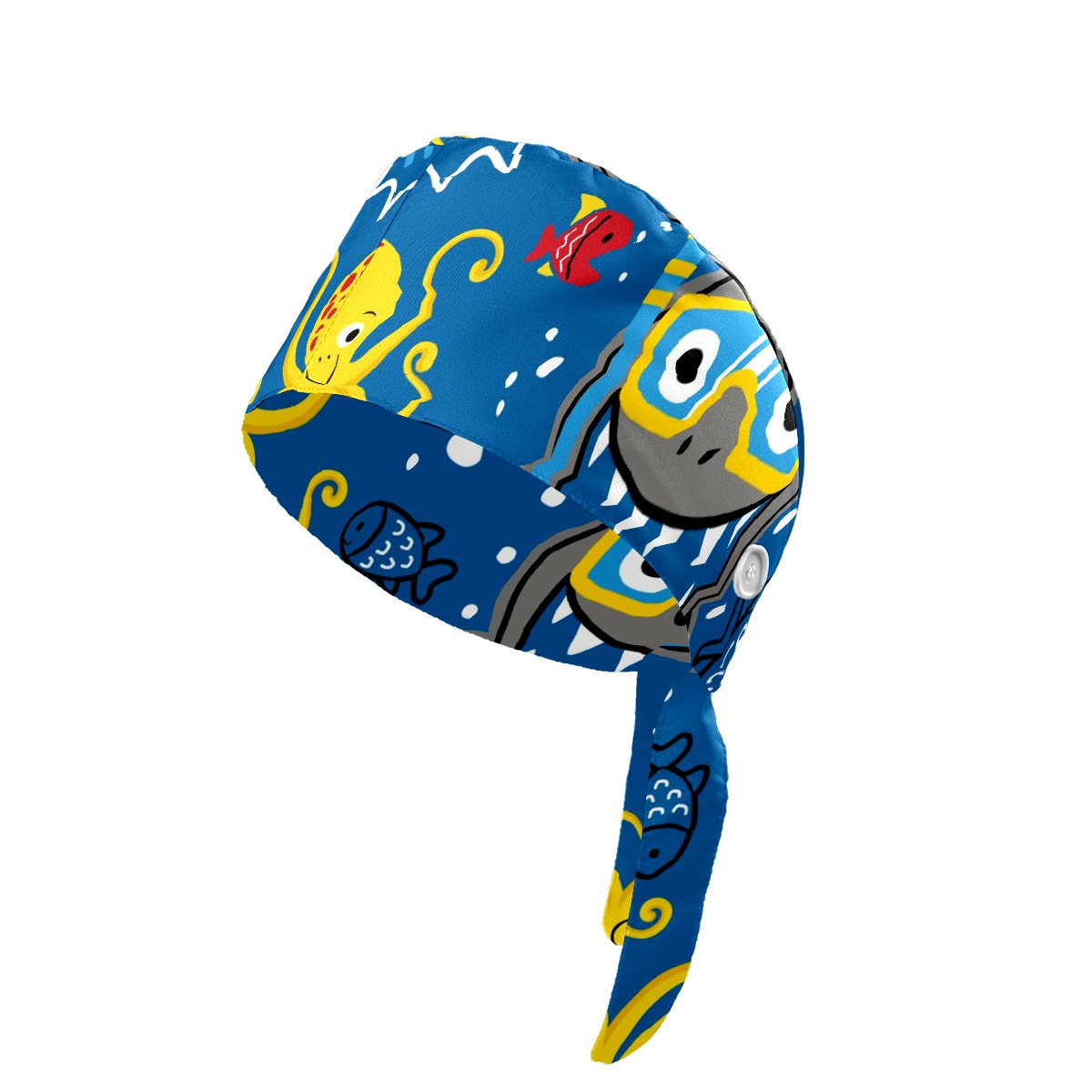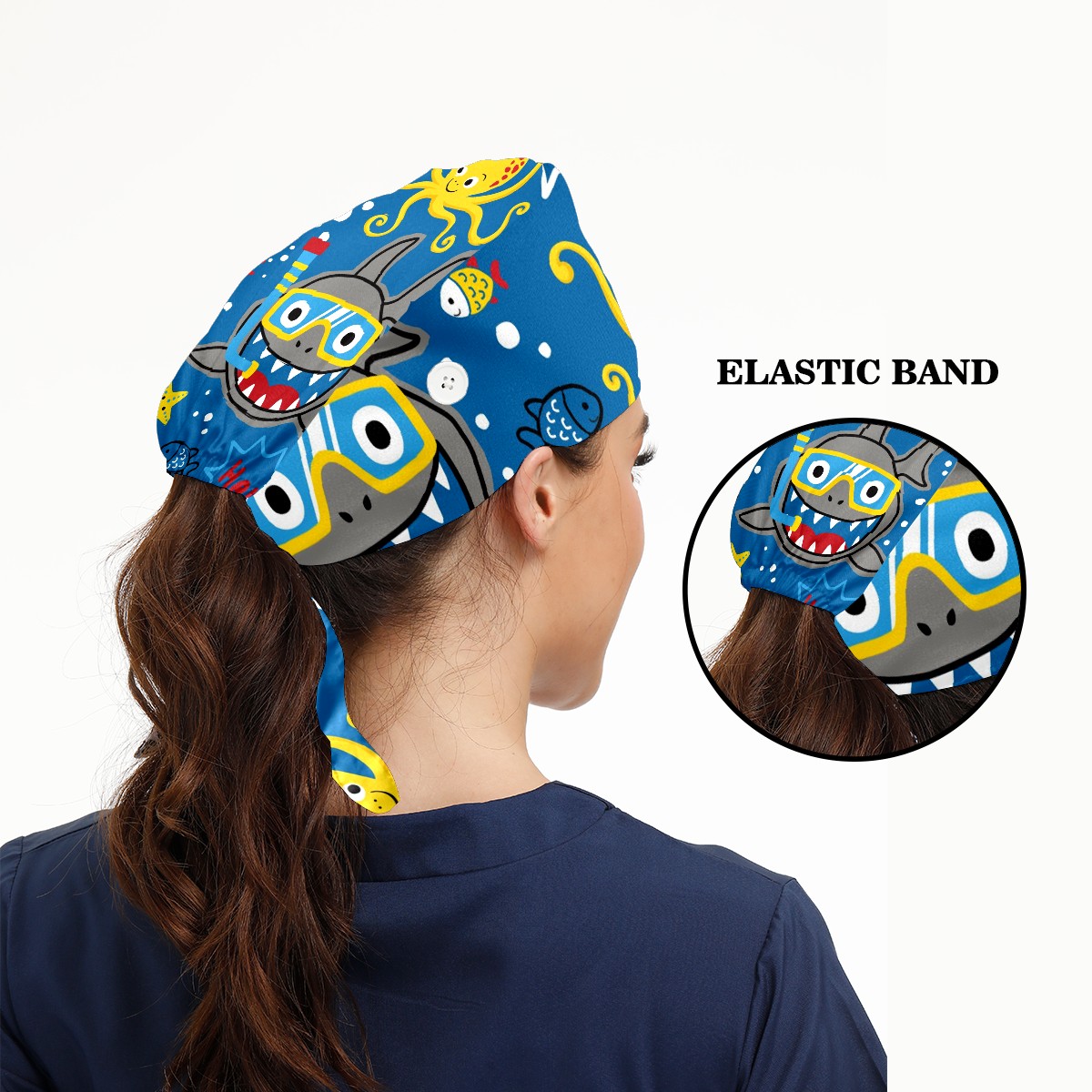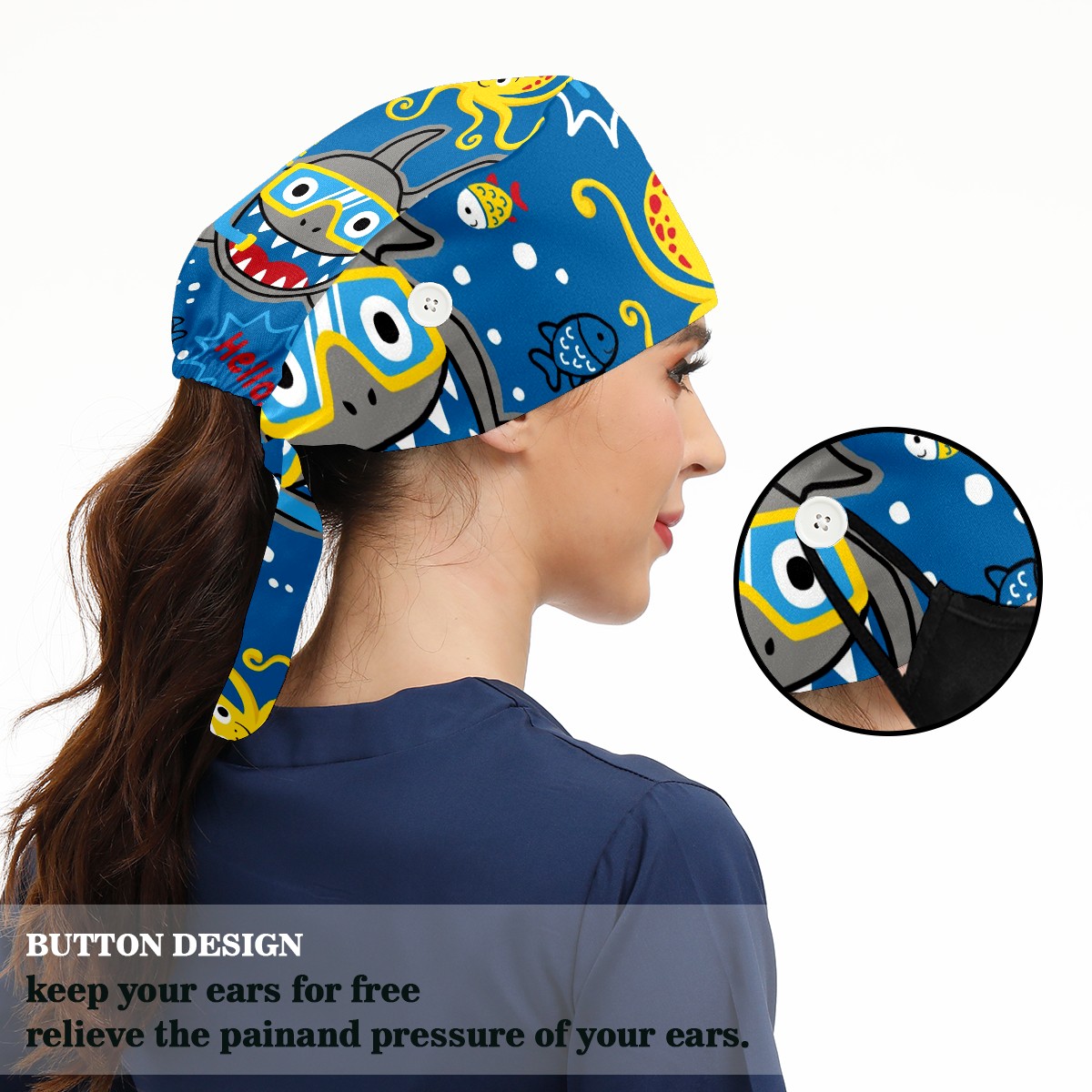 Working Caps with Button & Sweatband Satin Lined Cotton Adjustable Nurse Hats Elastic Band Scrub Cap Surgeon Hat Shark Wearing Diving Goggles