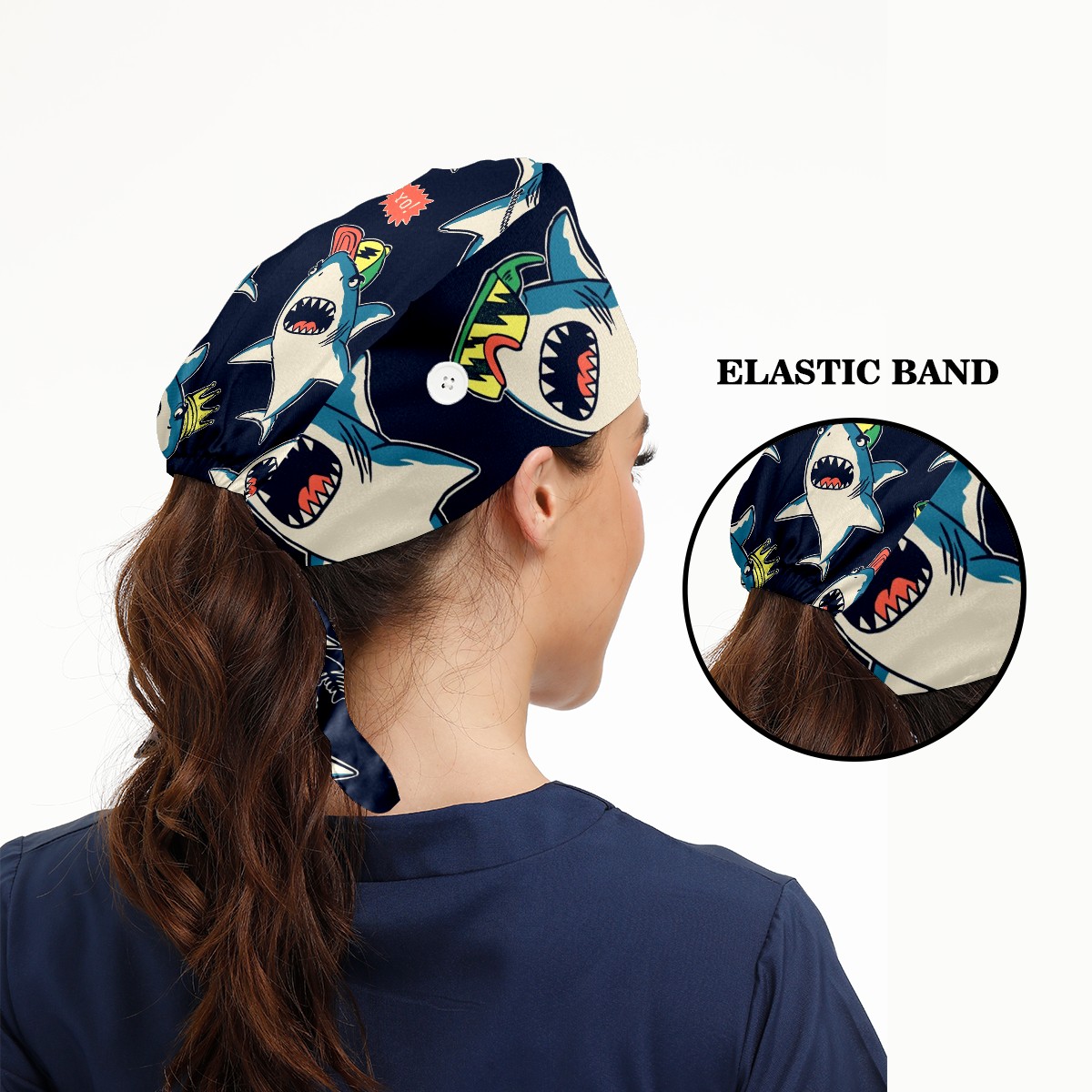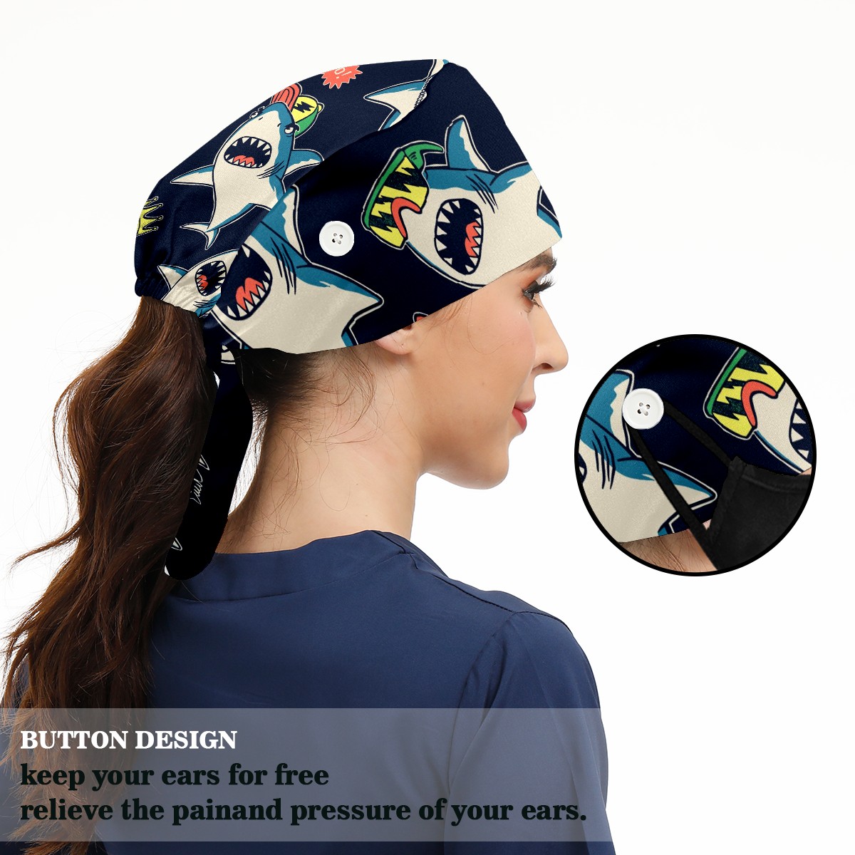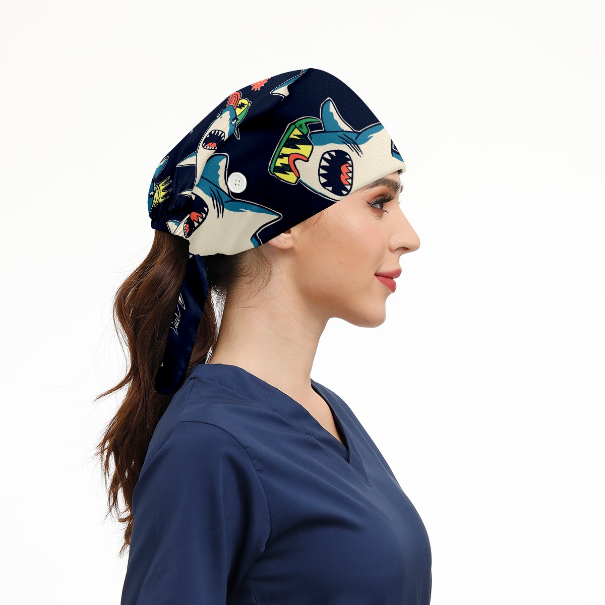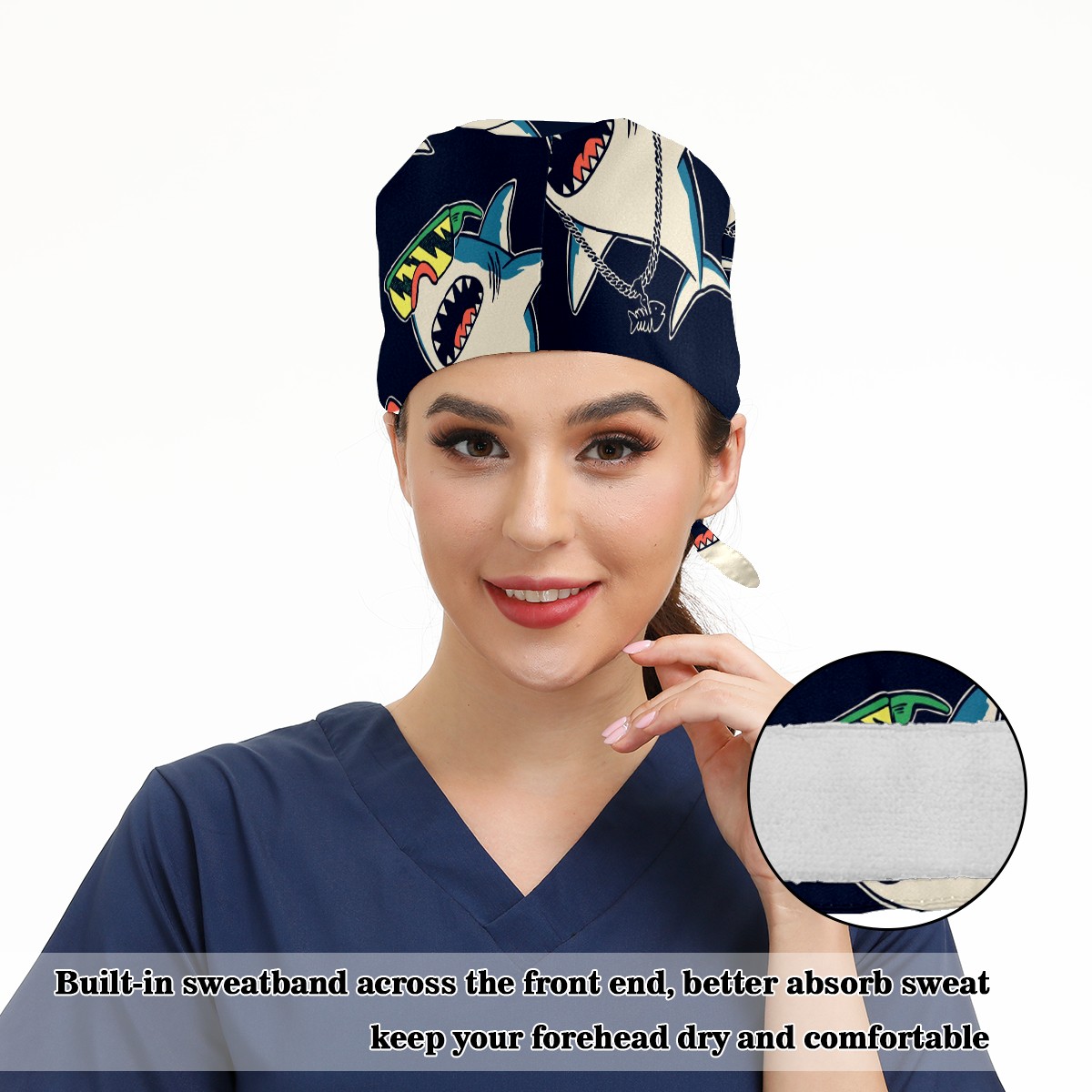 Working Caps with Button & Sweatband Satin Lined Cotton Adjustable Nurse Hats Elastic Band Scrub Cap Surgeon Hat Cute Shark Prince