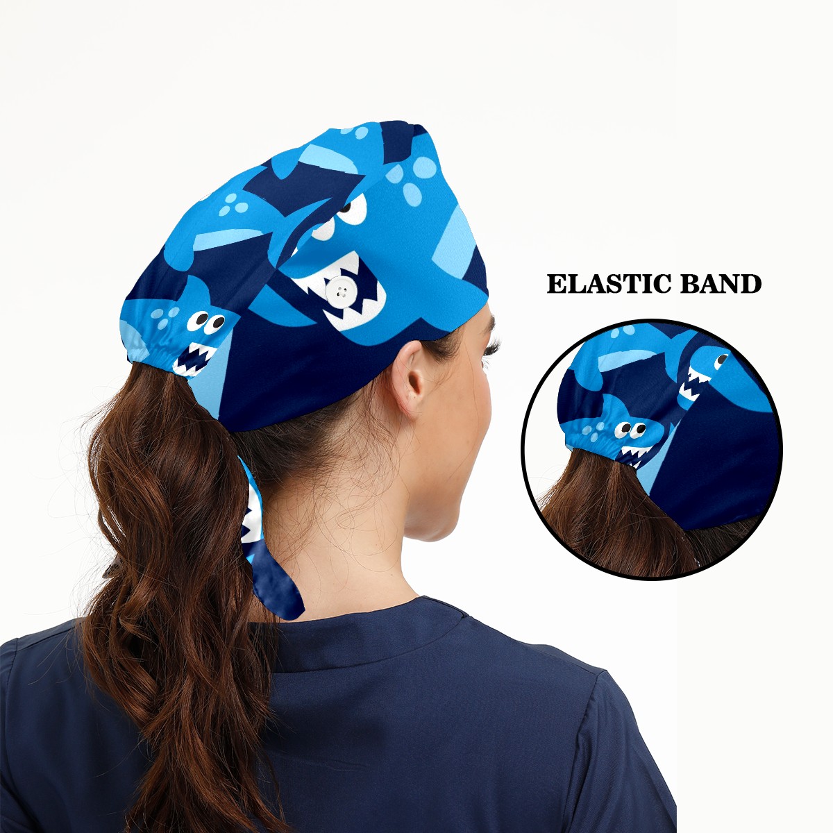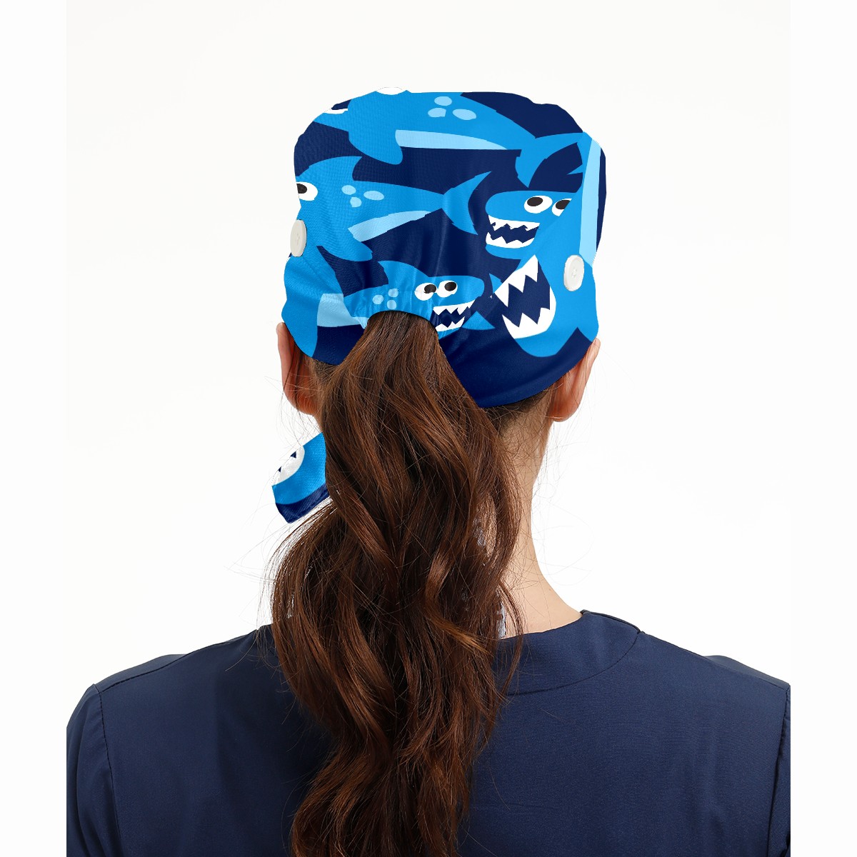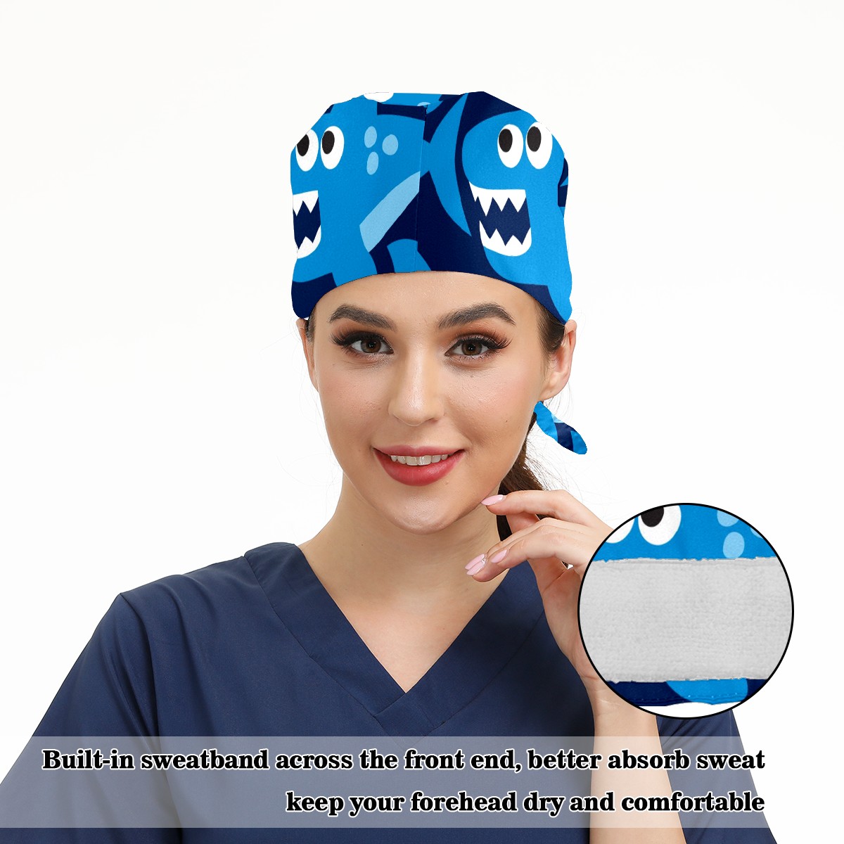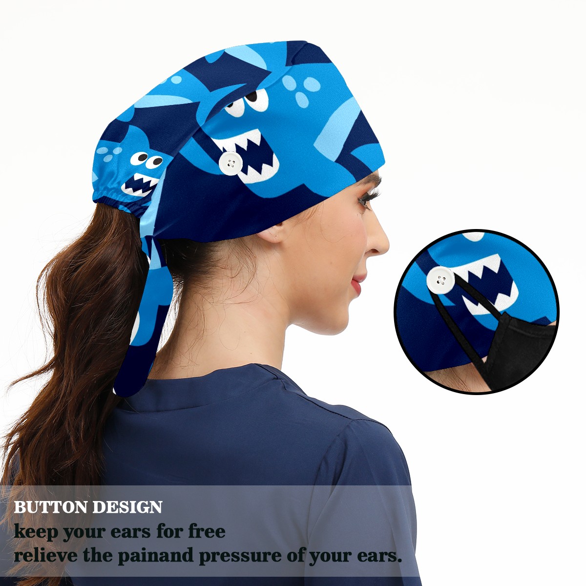 Working Caps with Button & Sweatband Satin Lined Cotton Adjustable Nurse Hats Elastic Band Scrub Cap Surgeon Hat Cartoon Blue Shark