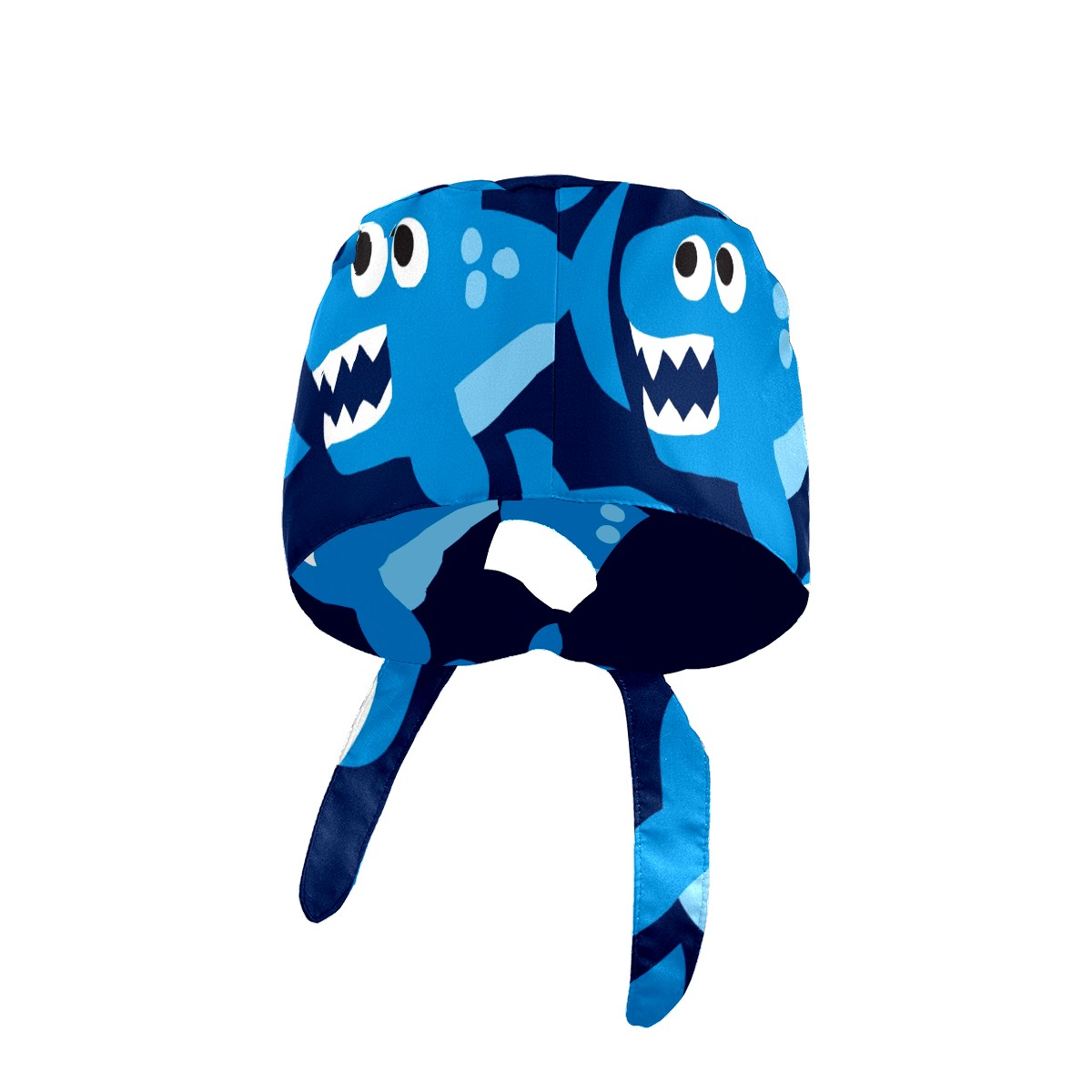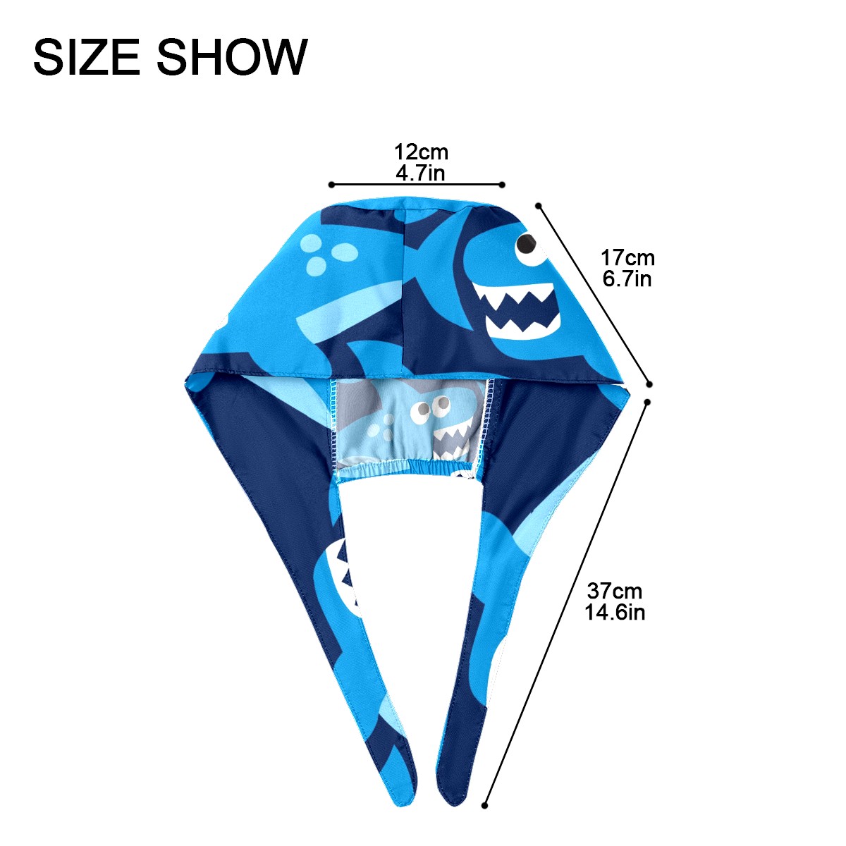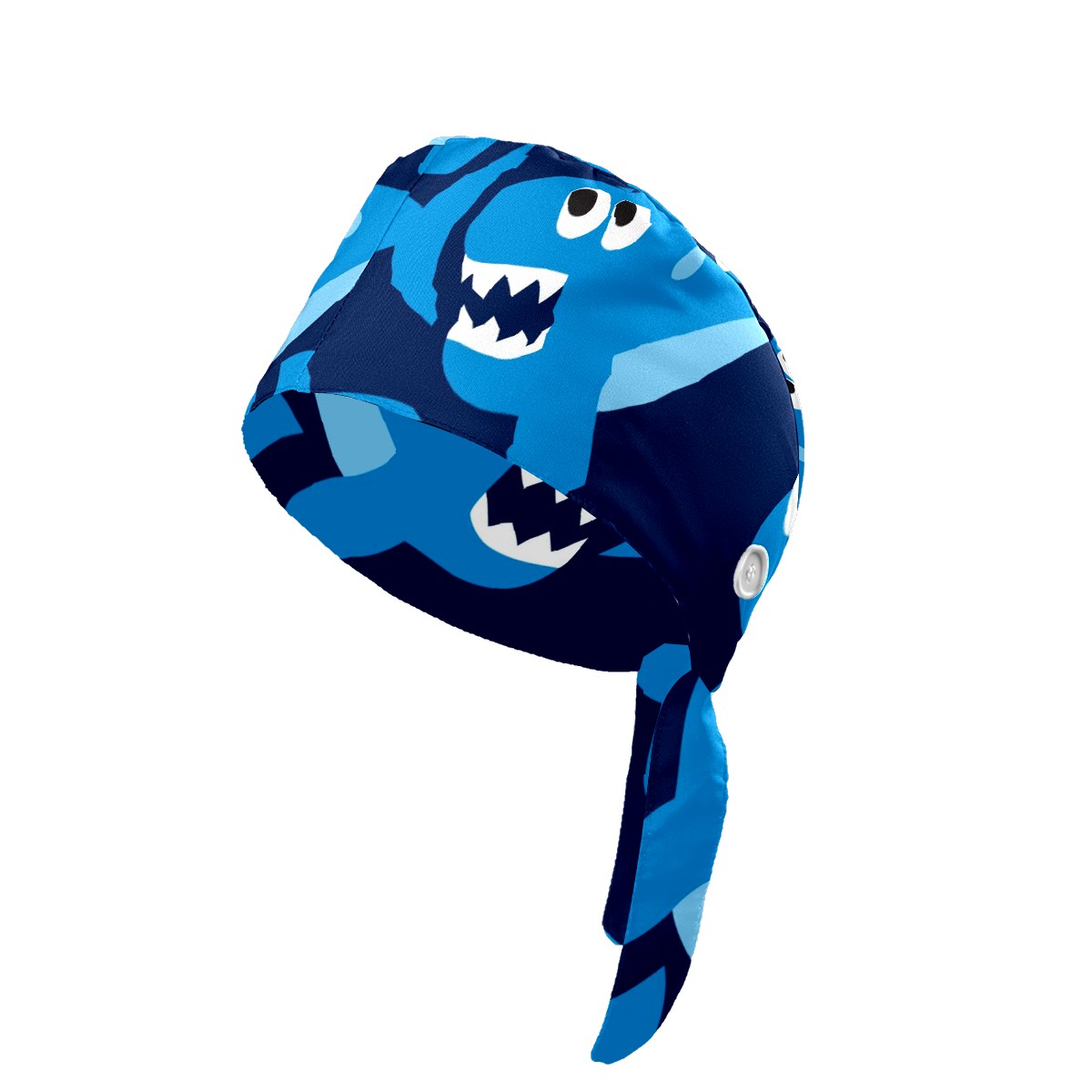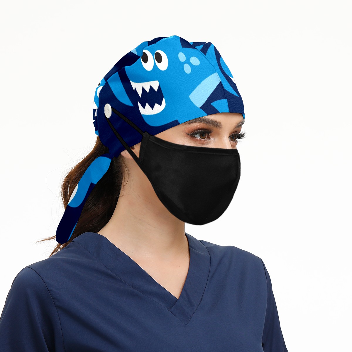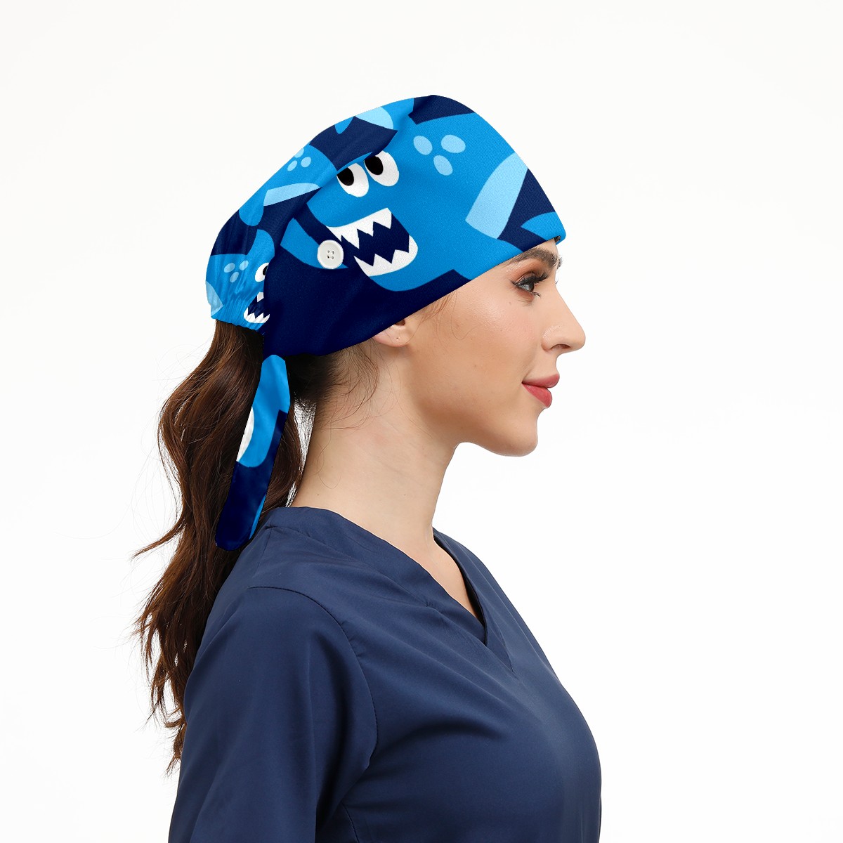 Working Caps with Button & Sweatband Satin Lined Cotton Adjustable Nurse Hats Elastic Band Scrub Cap Surgeon Hat Cartoon Blue Shark