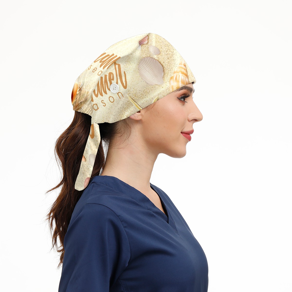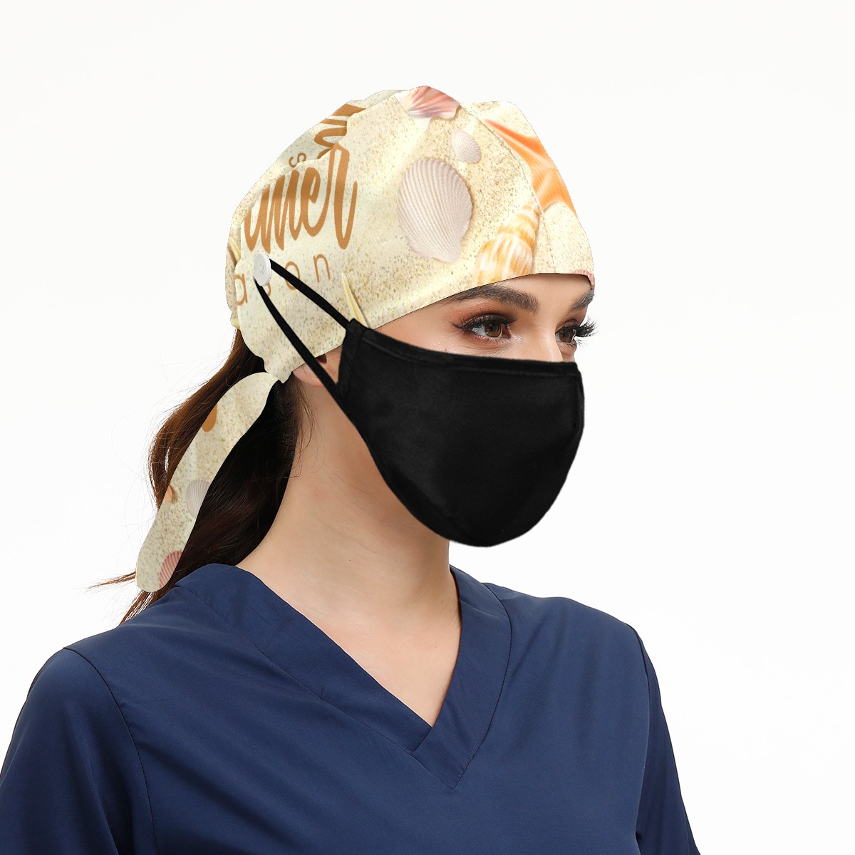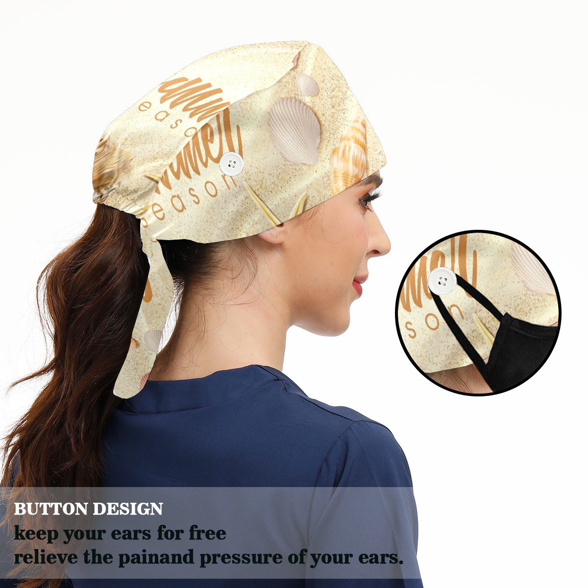 Working Caps with Button & Sweatband Satin Lined Cotton Adjustable Nurse Hats Elastic Band Scrub Cap Surgeon Hat Summer Beach Seashell Starfish