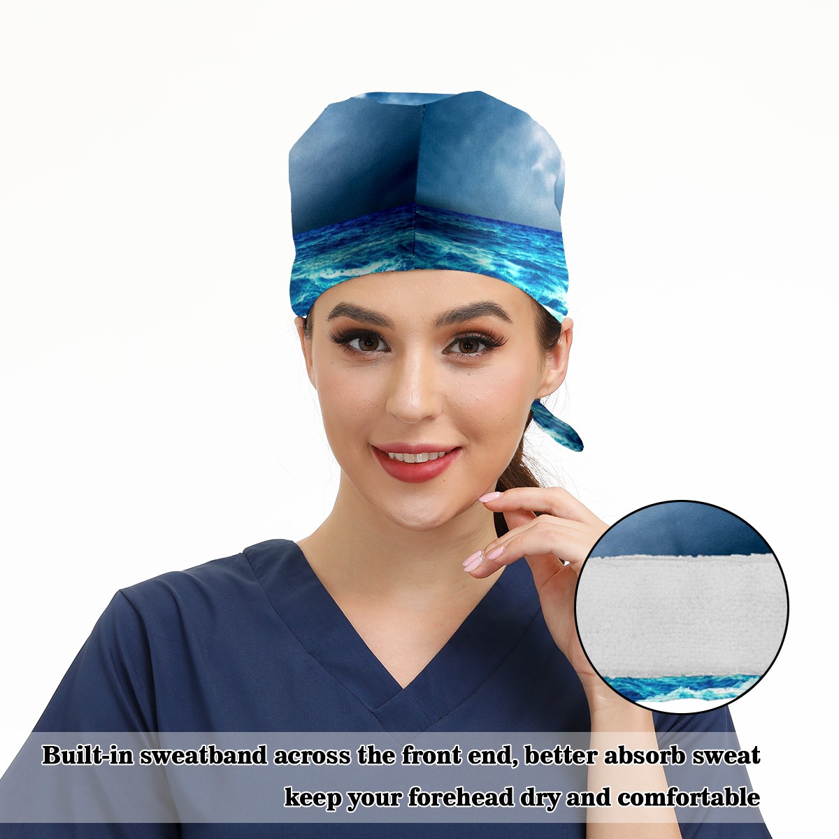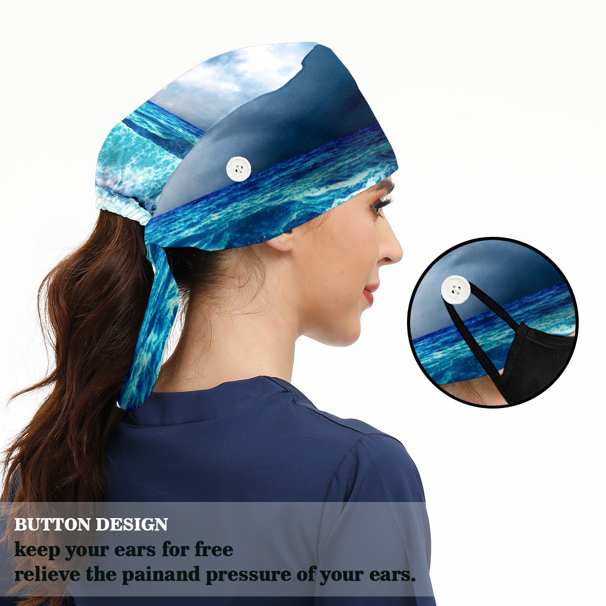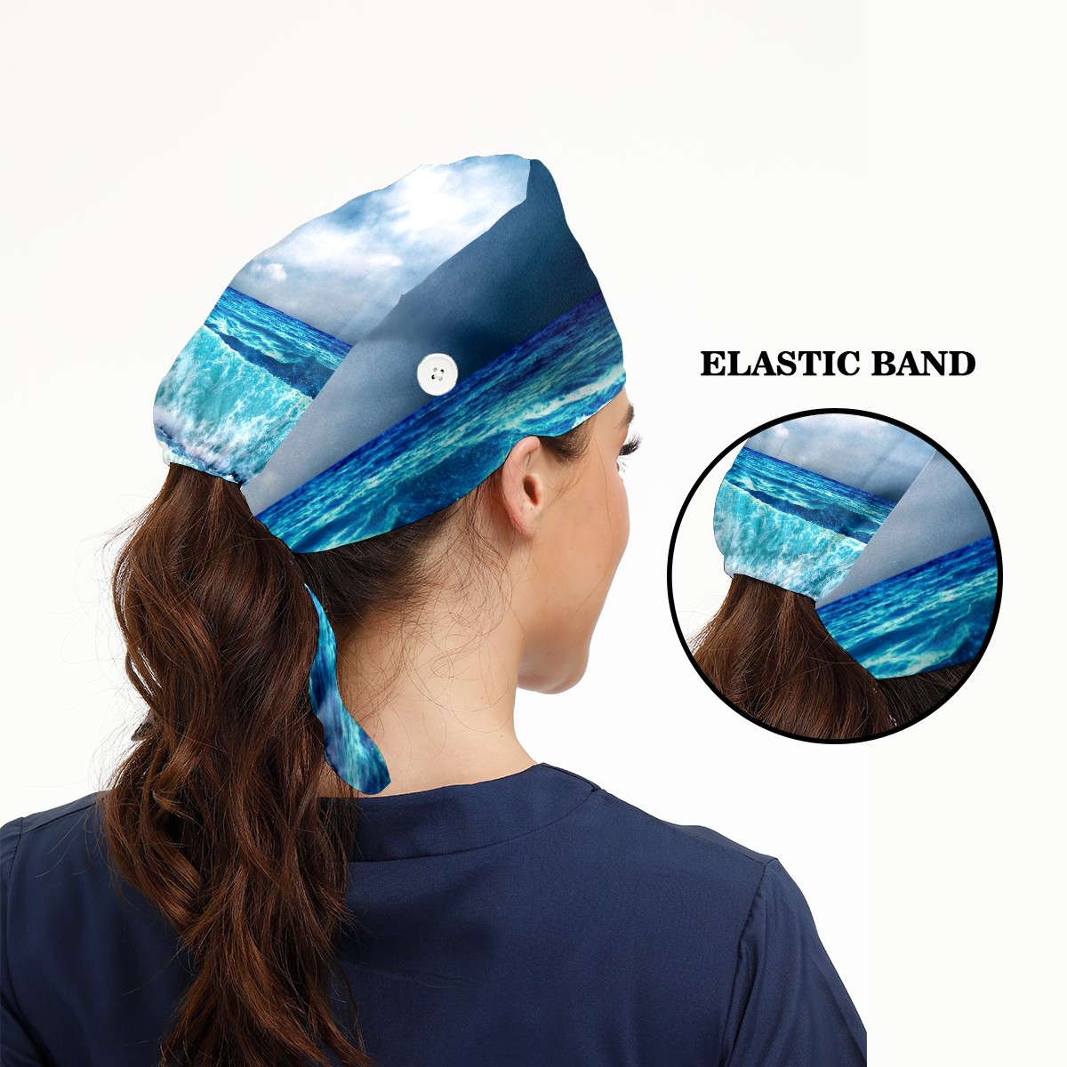 Working Caps with Button & Sweatband Satin Lined Cotton Adjustable Nurse Hats Elastic Band Scrub Cap Surgeon Hat Sea Landscape