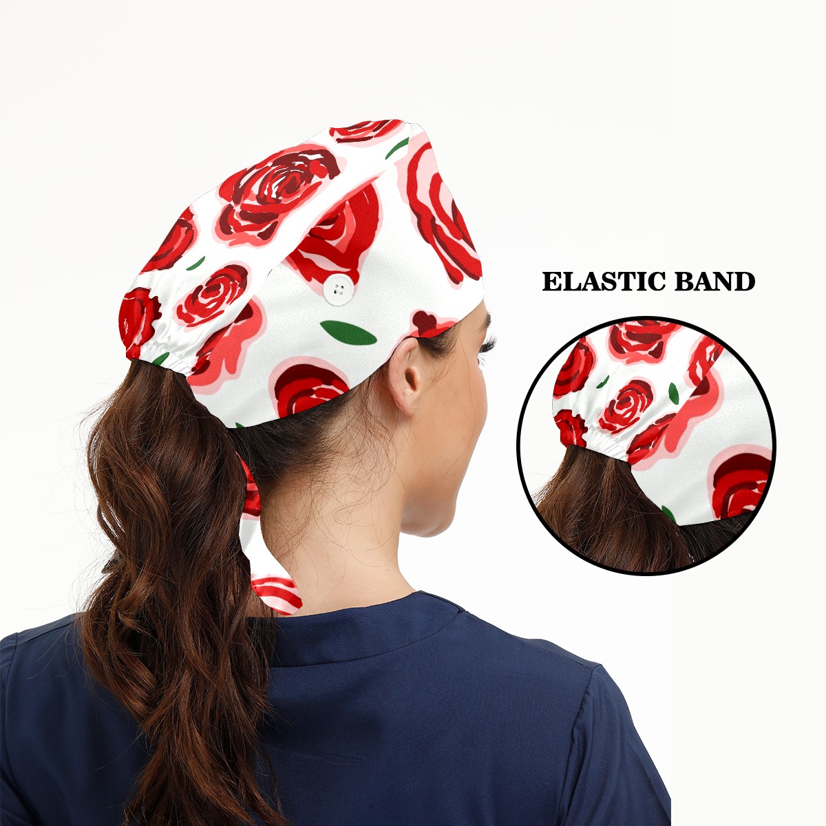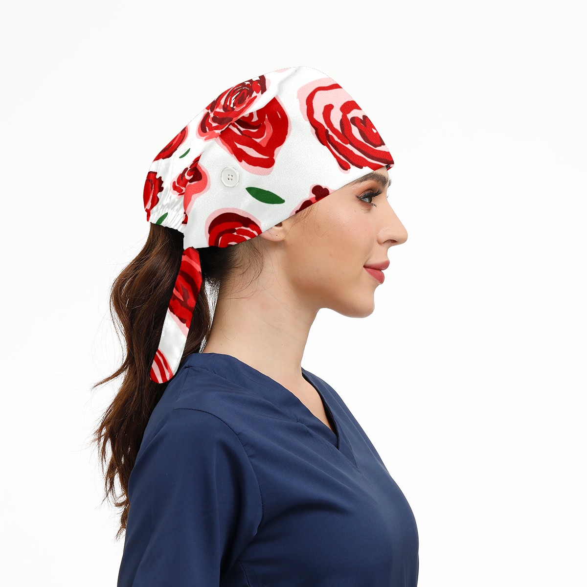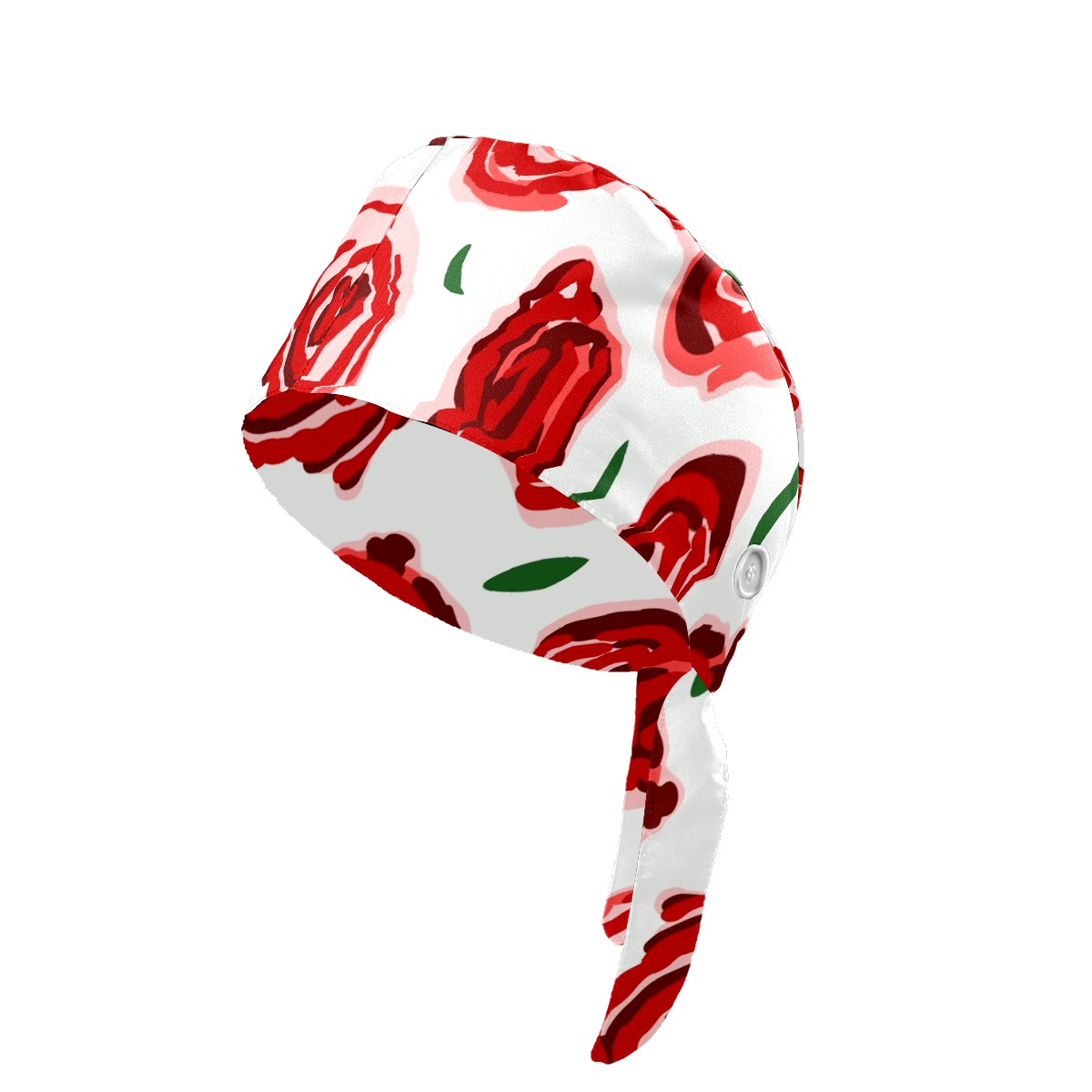 Working Caps with Button & Sweatband Satin Lined Cotton Adjustable Nurse Hats Elastic Band Scrub Cap Surgeon Hat Red Rose Flower On White Background