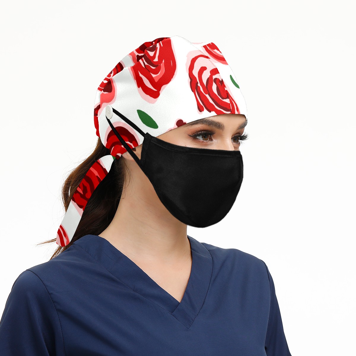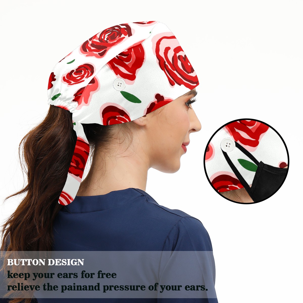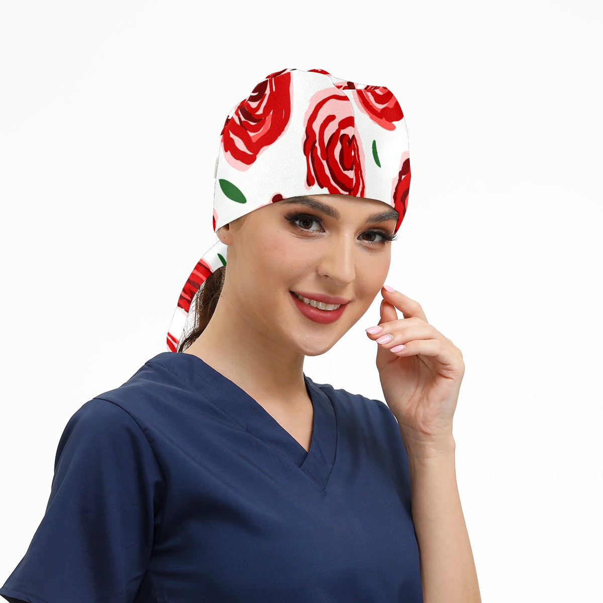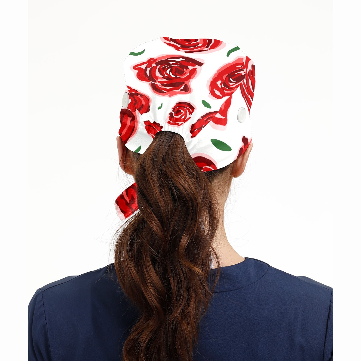 Working Caps with Button & Sweatband Satin Lined Cotton Adjustable Nurse Hats Elastic Band Scrub Cap Surgeon Hat Red Rose Flower On White Background