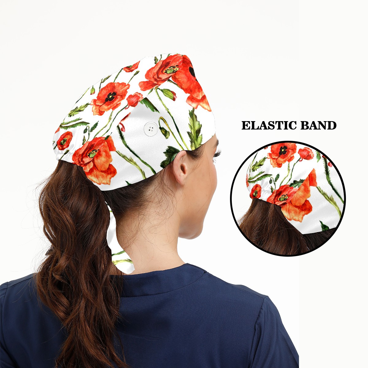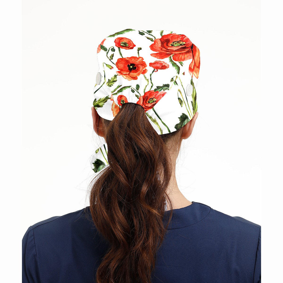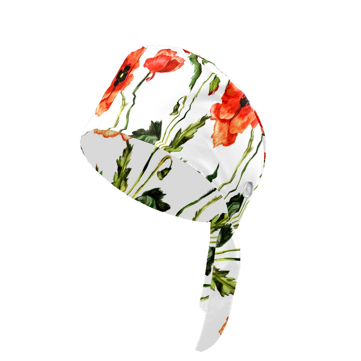 Working Caps with Button & Sweatband Satin Lined Cotton Adjustable Nurse Hats Elastic Band Scrub Cap Surgeon Hat Red Poppy Flowers Watercolor