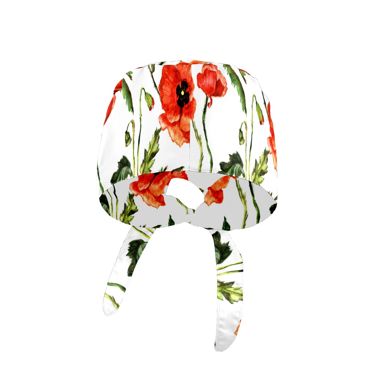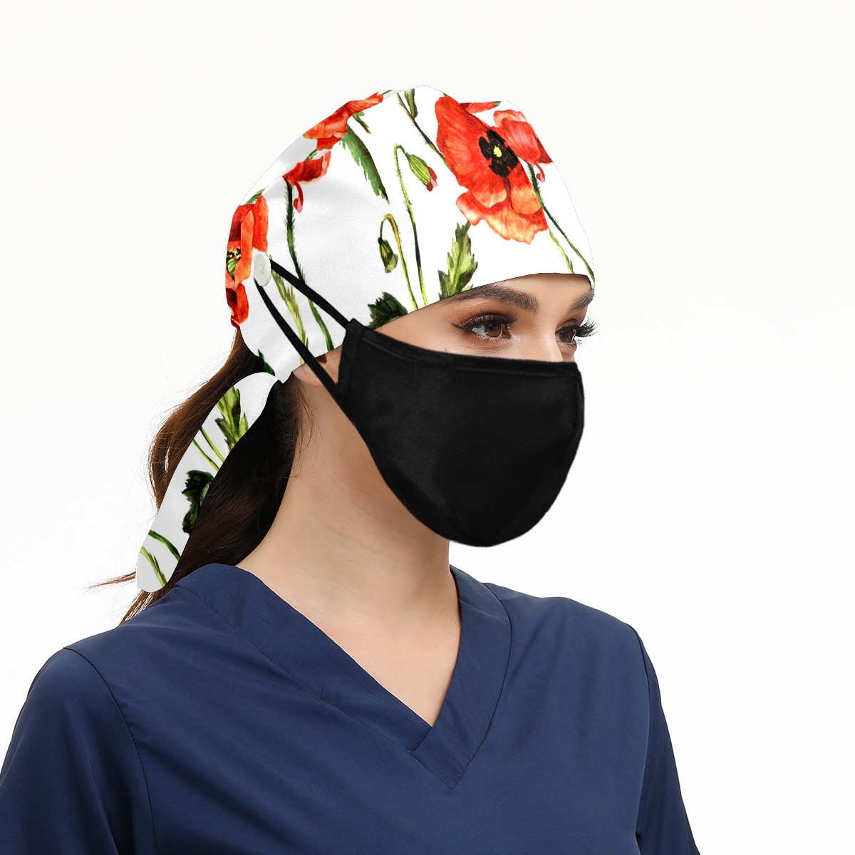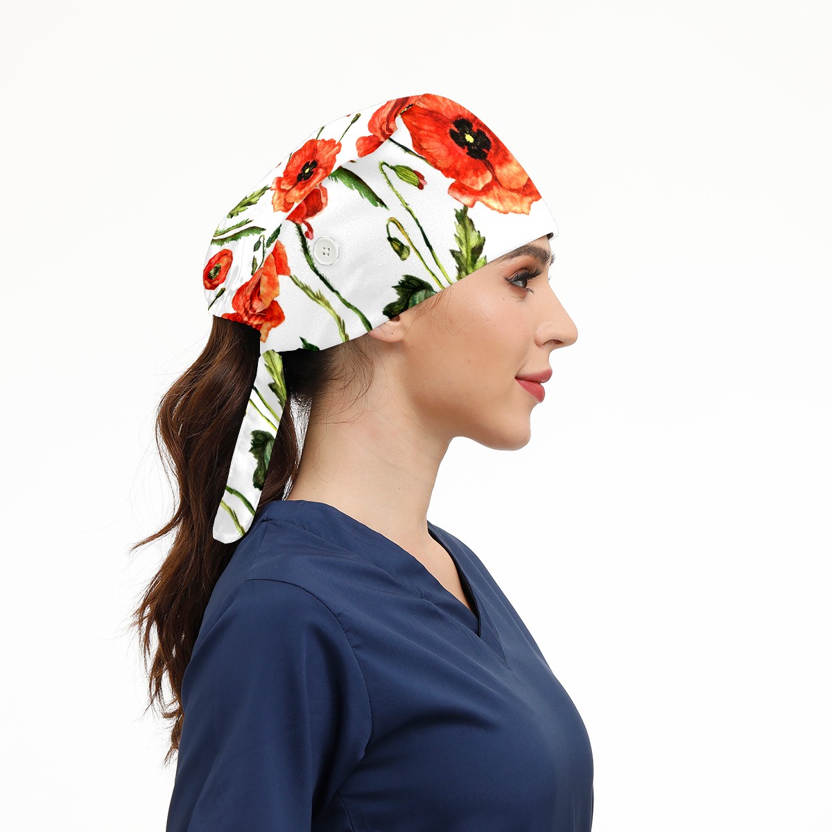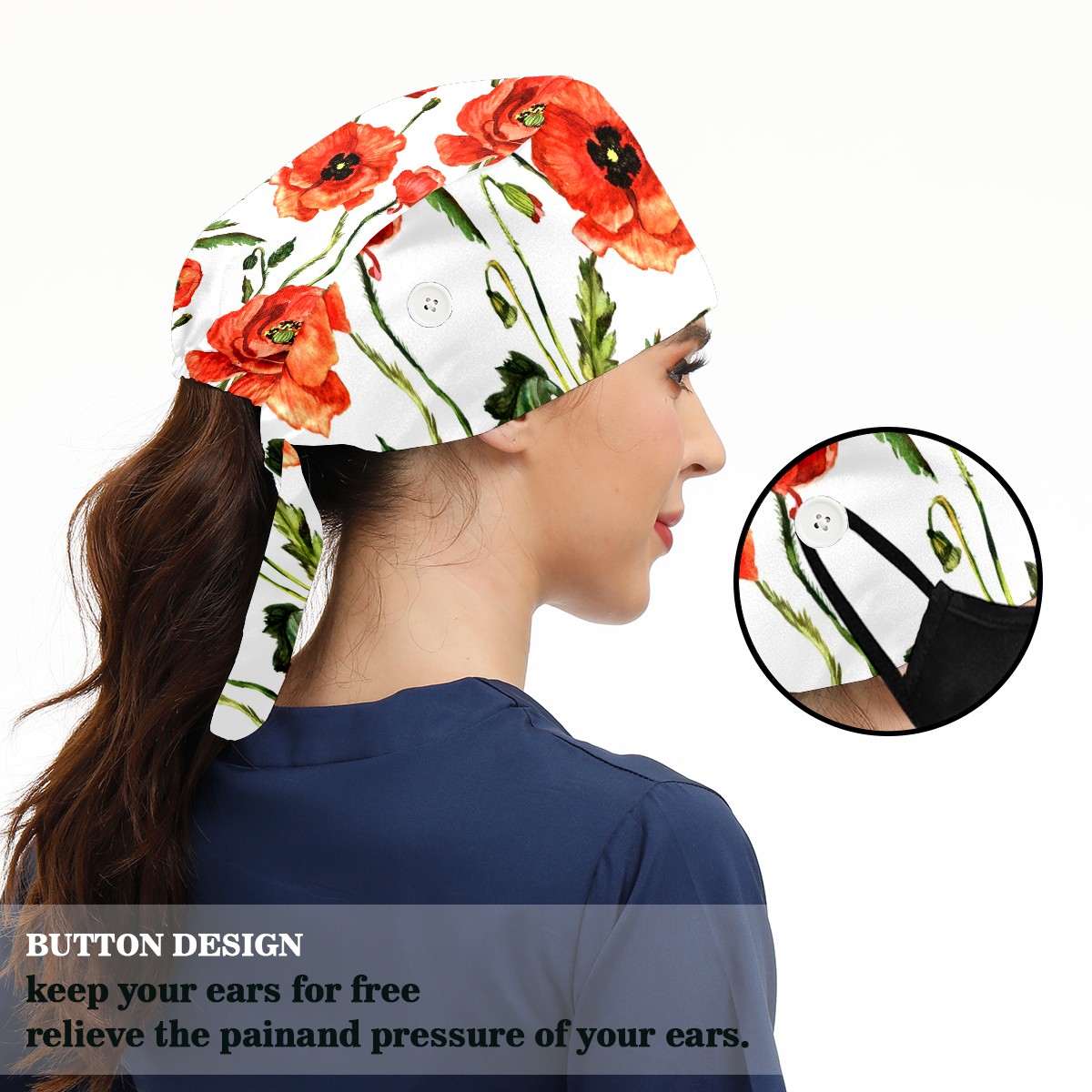 Working Caps with Button & Sweatband Satin Lined Cotton Adjustable Nurse Hats Elastic Band Scrub Cap Surgeon Hat Red Poppy Flowers Watercolor