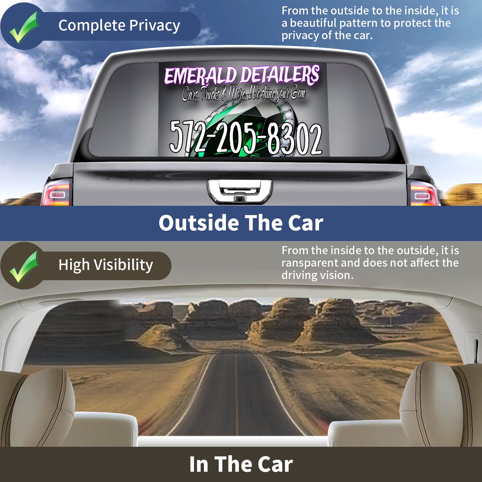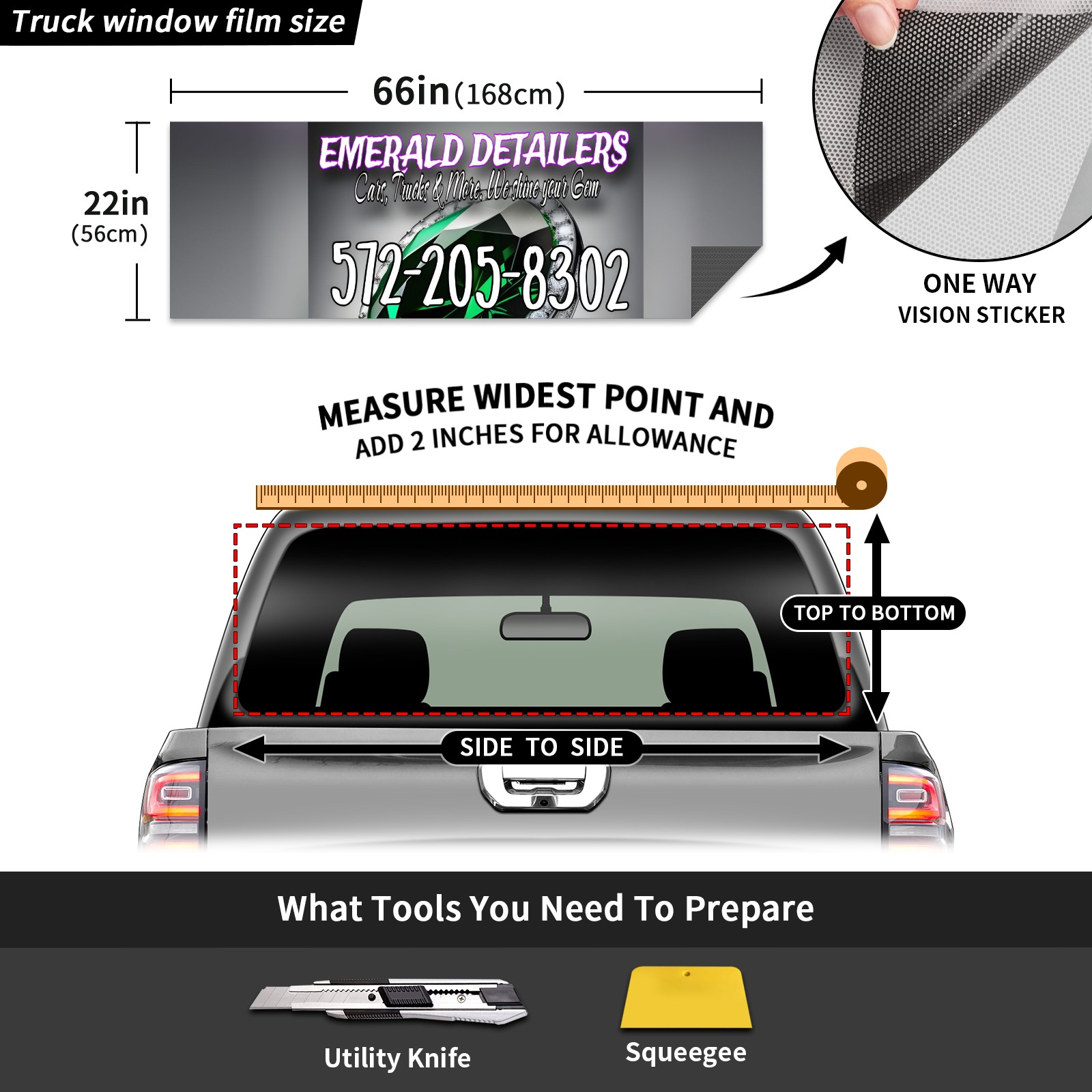 <p><strong>Truck Rear Window Graphics Decals Pickup Trucks Back Window Film Stickers 66" x 22" Perforated Vinyl Wrap Stickers Decorations for Car Rear Window</strong></p><p><strong><br /></strong></p><p><strong>Features :</strong></p><p>- Size of the rear window decals for trucks is 66x22 Inches (168x56cm).</p><p>- High quality perforated vinyl window film, one way vision sticker.</p><p>- Perforated is see through from the inside but not from outside.</p><p>- Clear printing, waterproof and durable.</p><p>- The car back window graphics stickers fits most truck and makes your vehicle more beautiful. </p><p><br /></p><p><strong>【Installation Instructions】</strong></p><p><strong>1. CLEAN SURFACE -</strong> Clean the rear window thoroughly and make sure the surface clean.</p><p><strong>2. STICK THE DECALS -</strong> Tear off the paper on the back and stick the decal on the window.</p><p><strong>3. SCRAPE OFF AIR BUBBLES -</strong> Use a squeegee or other card to scrape off the excess air bubbles.</p><p><strong>4. TRIM THE EXCESS -</strong> Use a knife to cut off the excess stickers of the window, finally complete.</p><p><br /></p><p>1. Please measure the size before purchasing, back window graphics decal for truck can be cut to your desired size.</p><p>2.The graphics stickers for truck back window is a great gift for yourself also can as a birthday / halloween / christmas gift for your friends and family.</p>